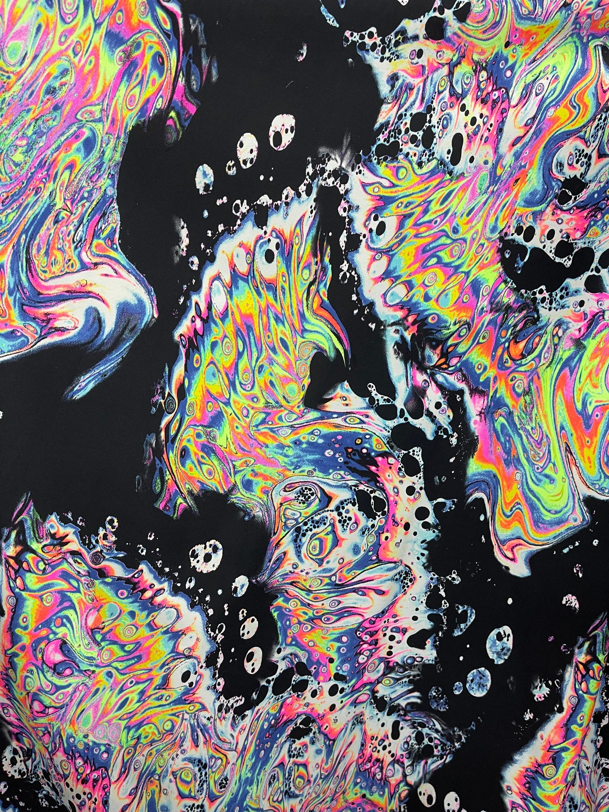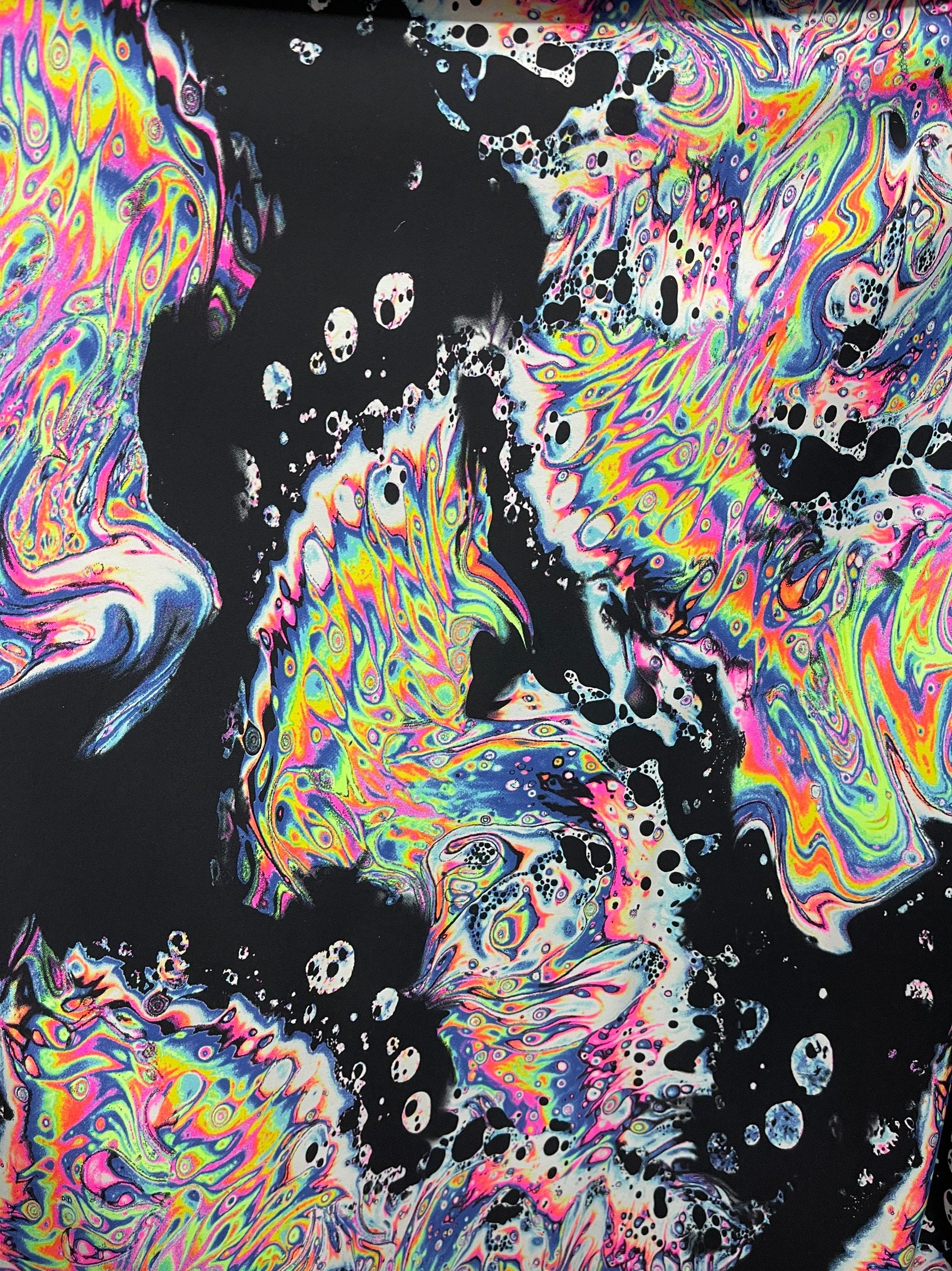 New Lava abstract design reflective with black light it glows in the dark print nylon spandex best quality 4-way stretch 58/60”