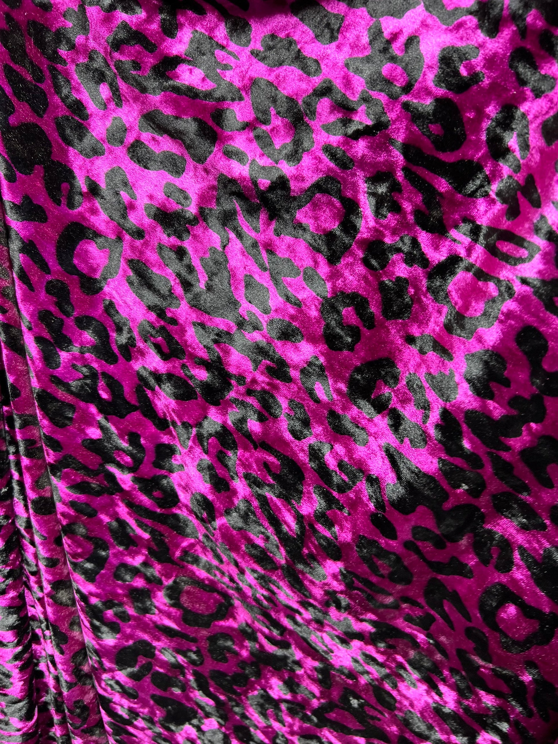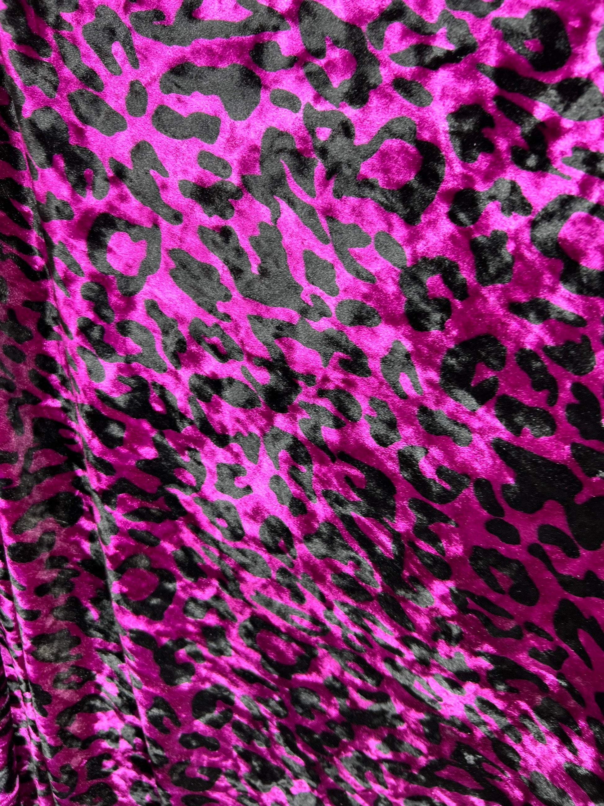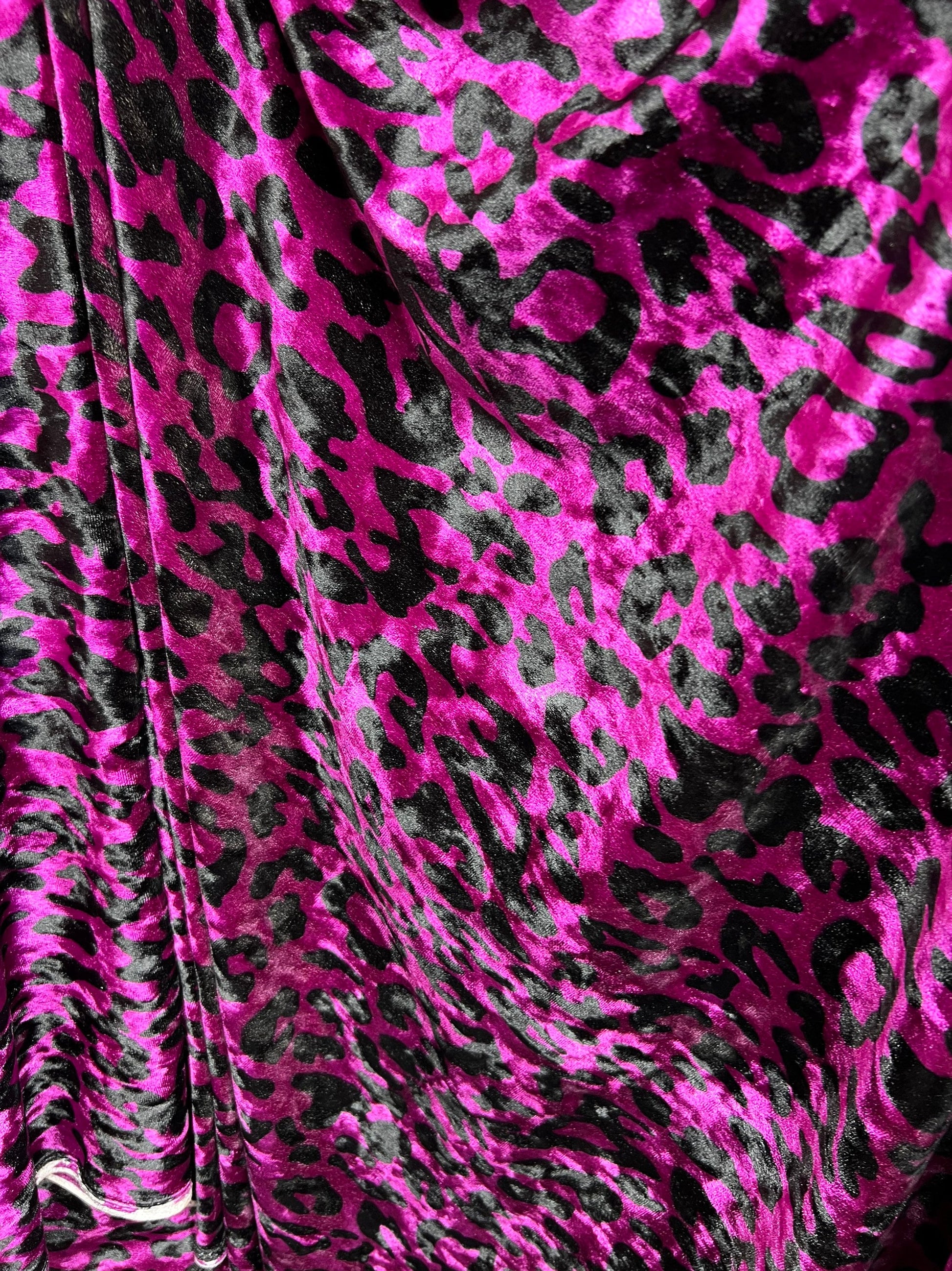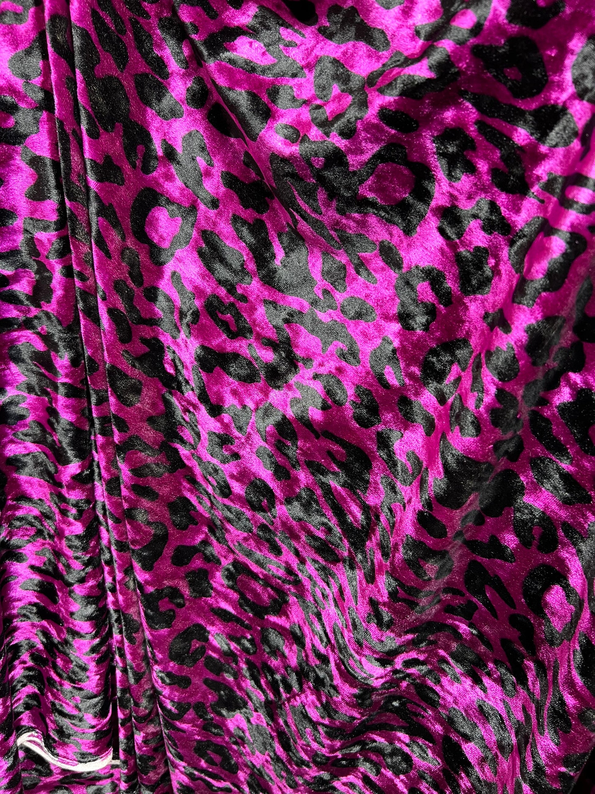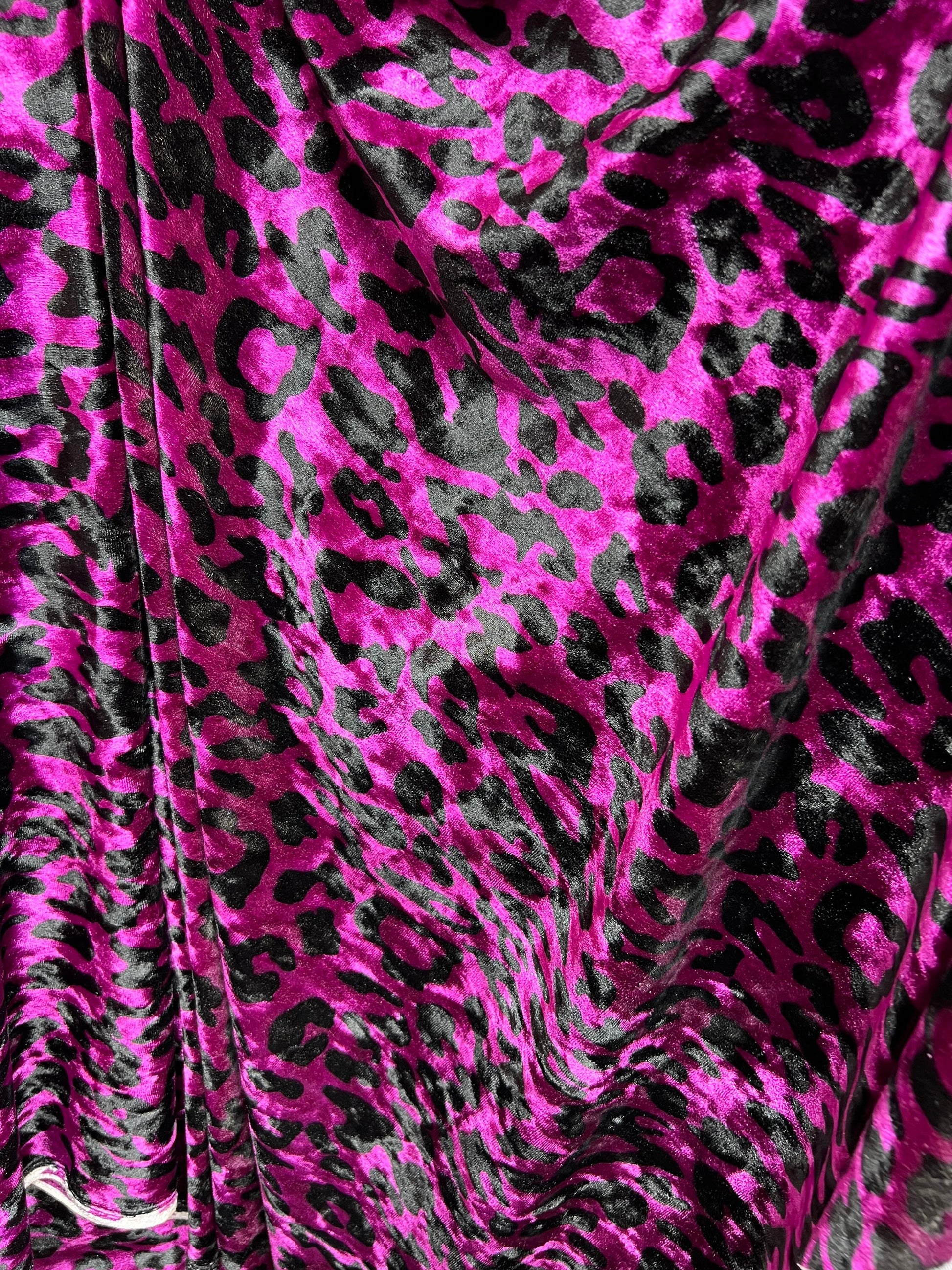 New Leopard design Magenta/Black exotic animal print on 4-way stretch velvet 58/60” Sold by the YD. Ships worldwide from Los Angeles California USA.