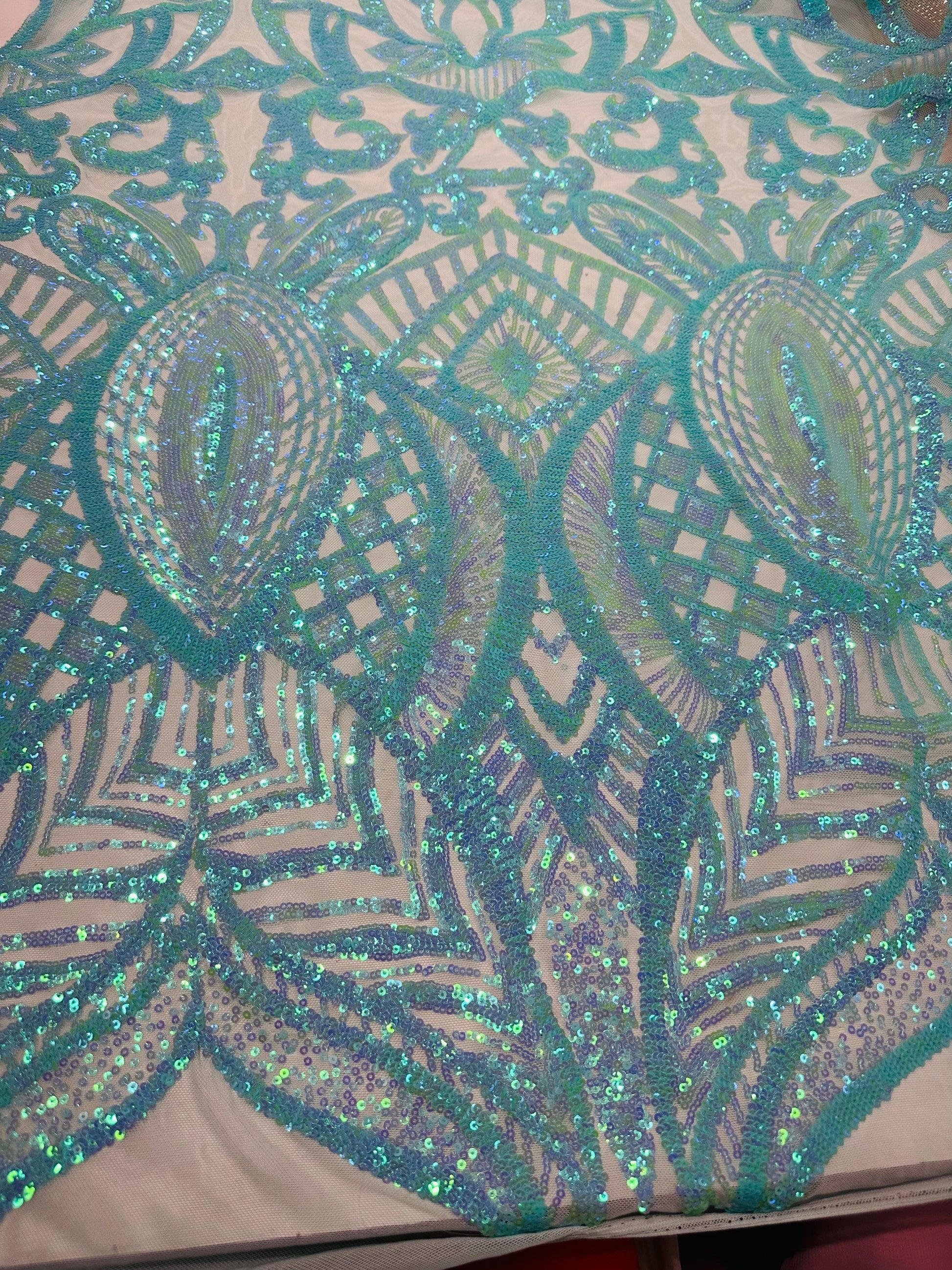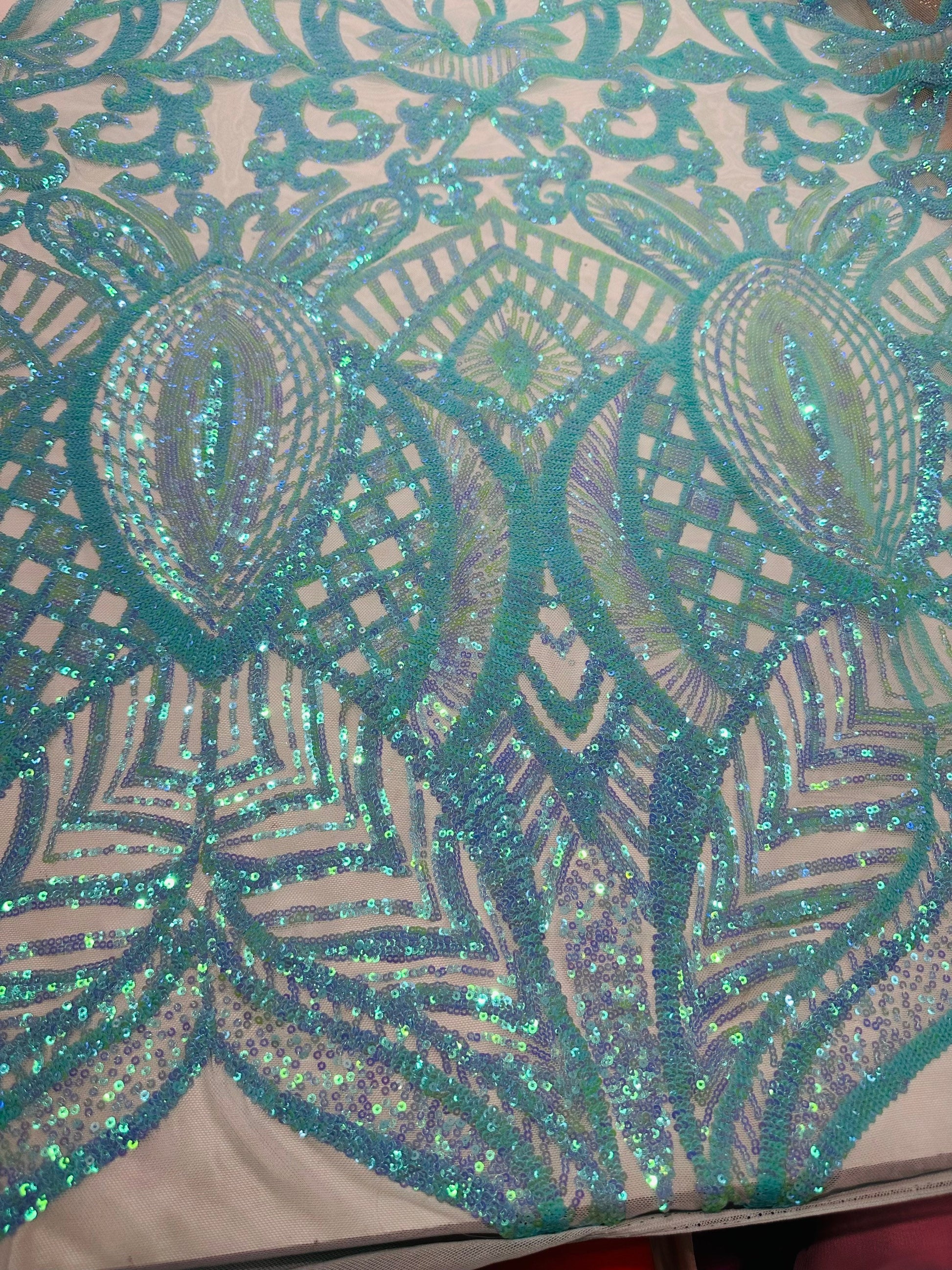New Luxury Jlo sequins design Tiffany blue embroidered on stretch power mesh 4-way stretch 55/57” Sold by the YD. Ships worldwide from Los Angeles California USA