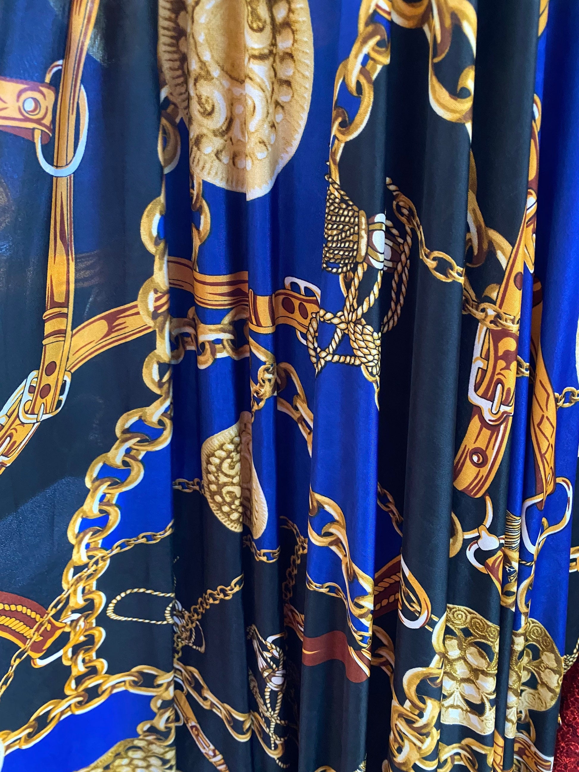 New luxury sapphire gold chain modern design print on poly spandex medium weight 4-way stretch 58/60” Sold by the YD. Ships worldwide