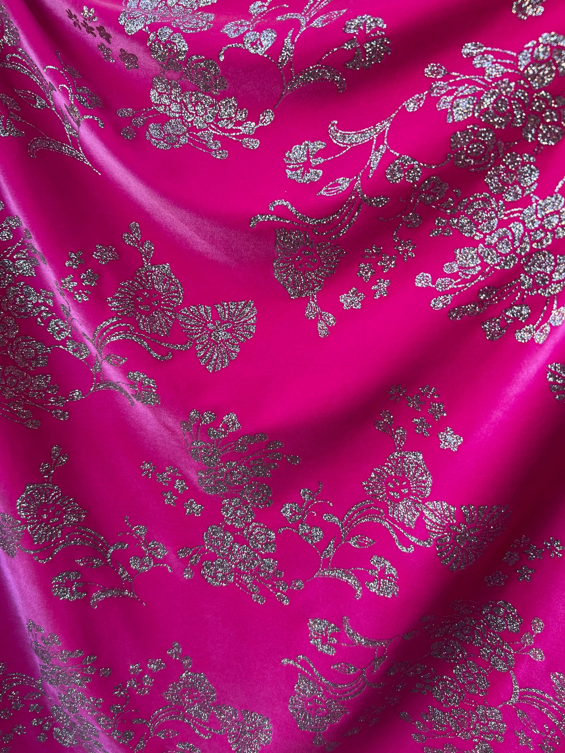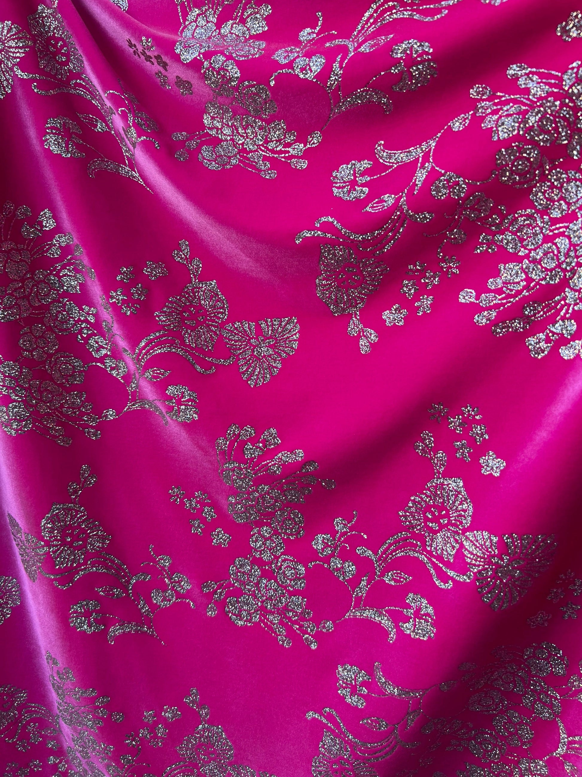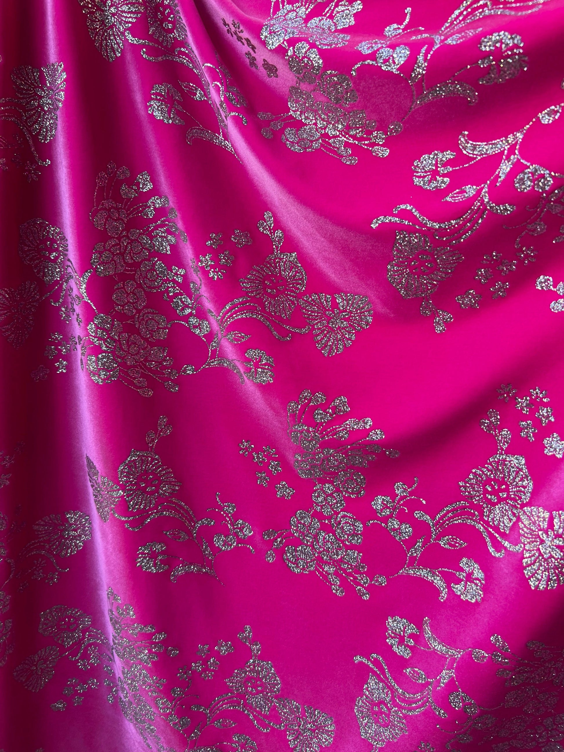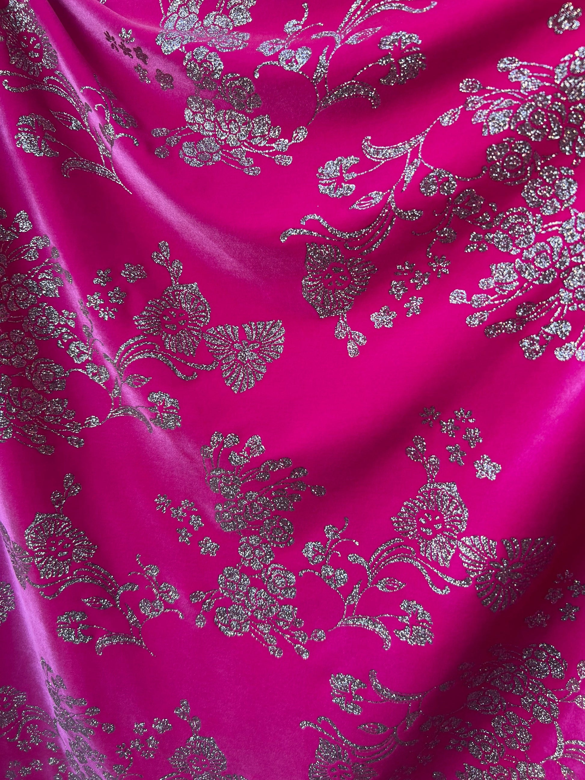 New Luxury stretch velvet romantic flower design hoy pink/silver 4-way stretch 58/60” Sold by the YD. Ships Worldwide from Los Angeles CA