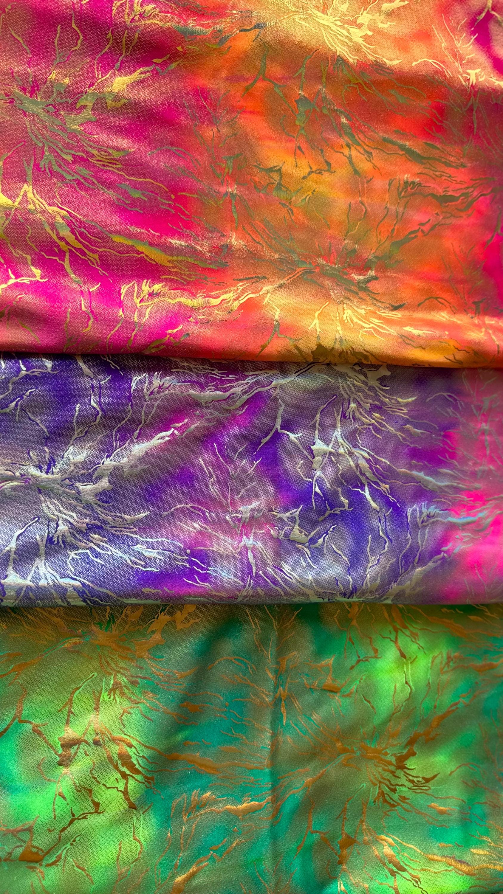New Luxury Tie Dye Modern Abstract design hologram metallic nylon spandex 4-way stretch 58/60” Sold by the YD. Ships worldwide from Los Angeles California USA