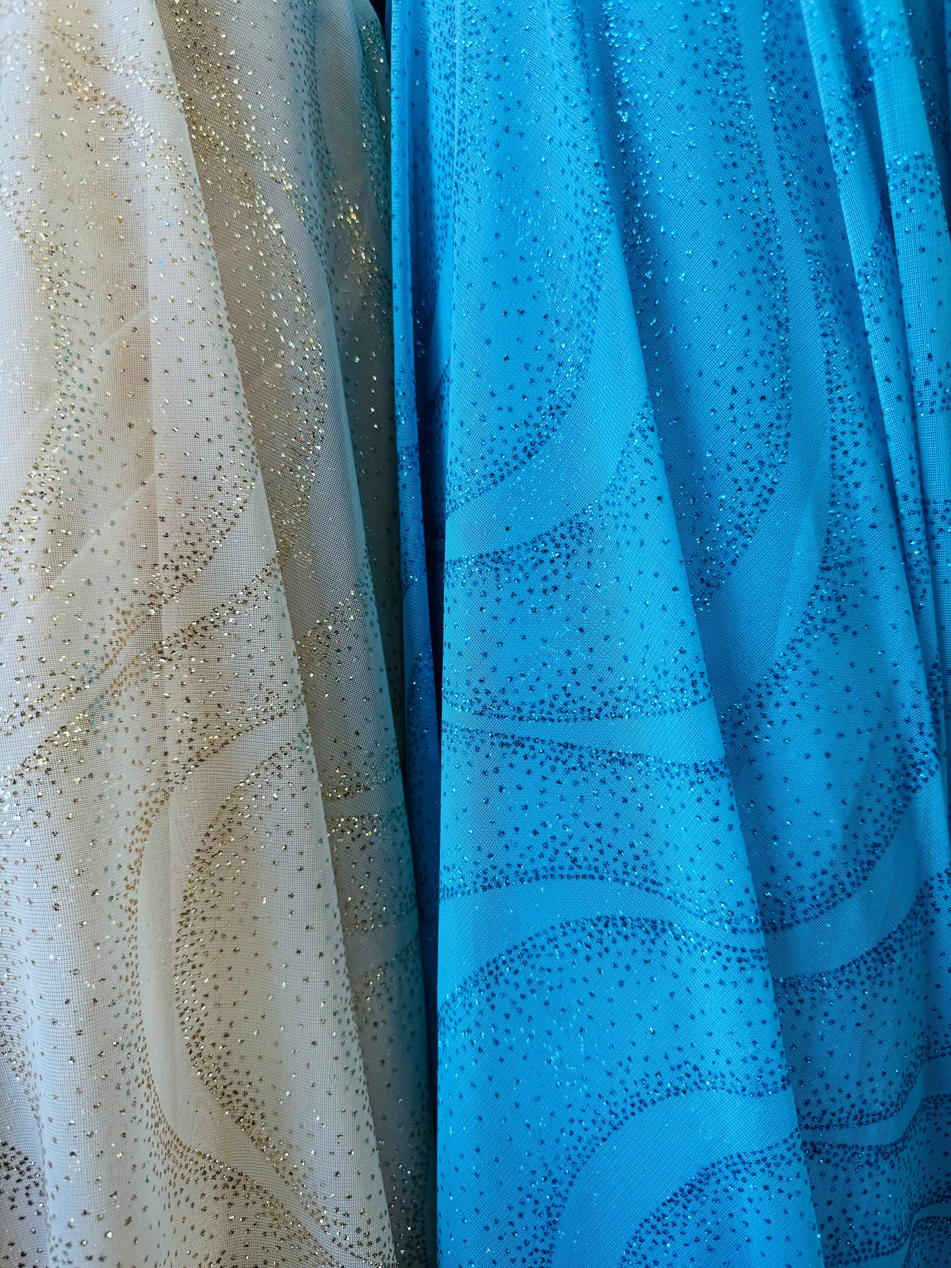 New Luxury Wavy design on mesh with glitter 2-way stretch 58/60” Sold by the YD. Ships worldwide from Los Angeles California USA.