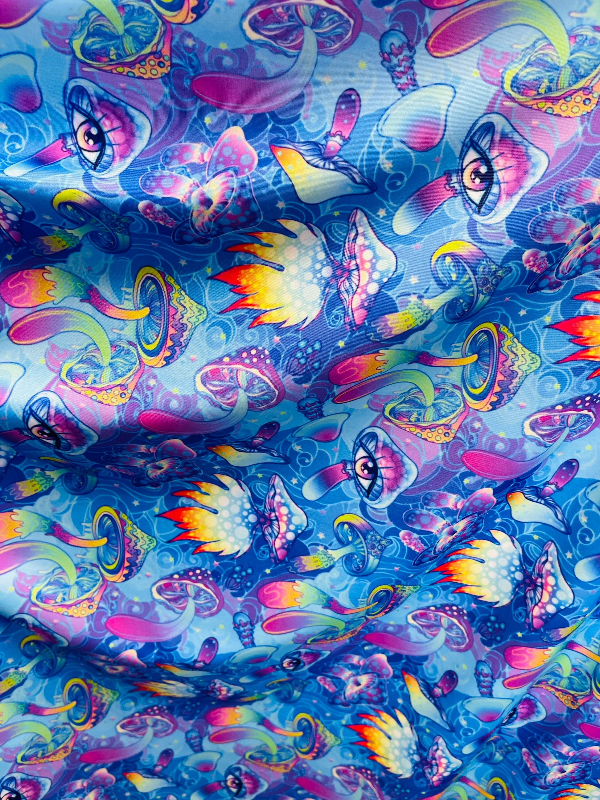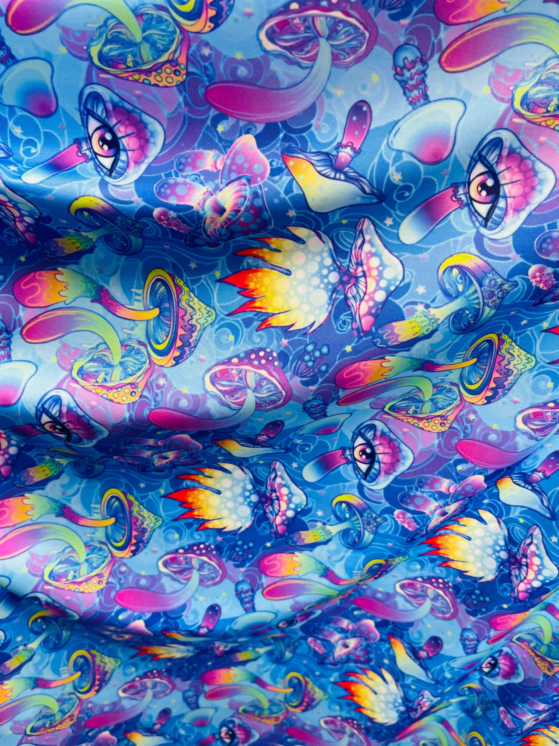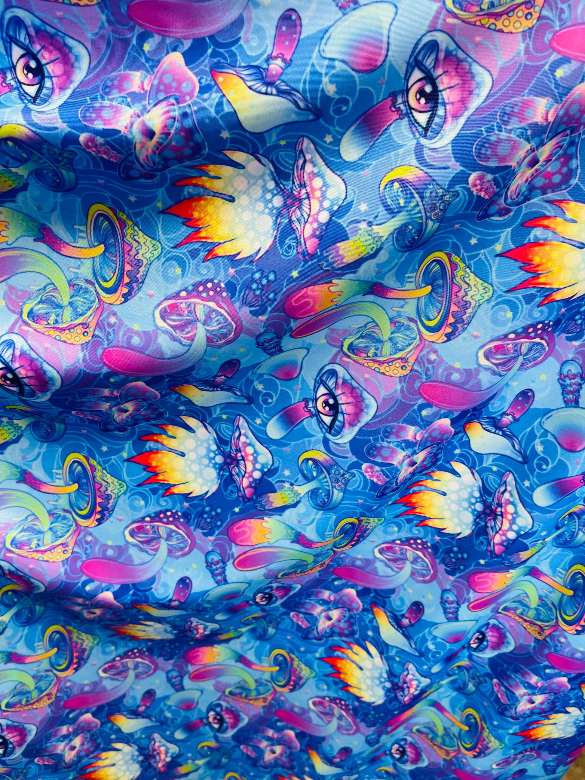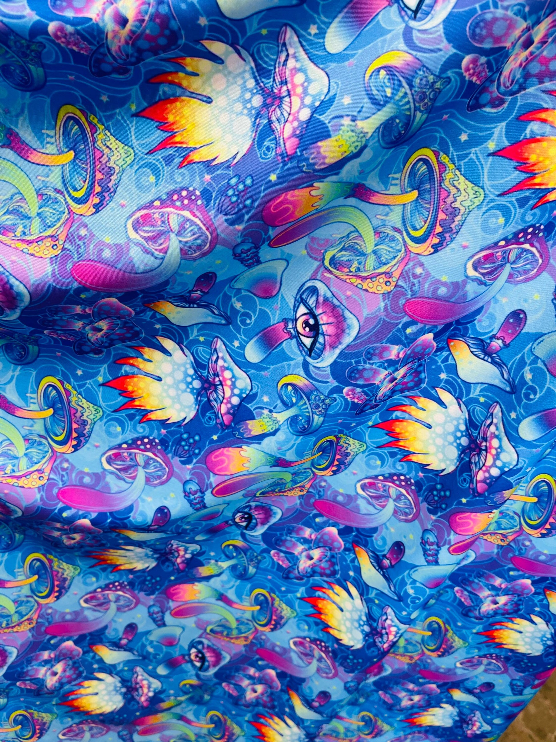 New Magic Mushrooms design print on great quality of nylon spandex 4-way stretch 58/60” Sold by the YD. Ships Worldwide from Los Angeles California USA.