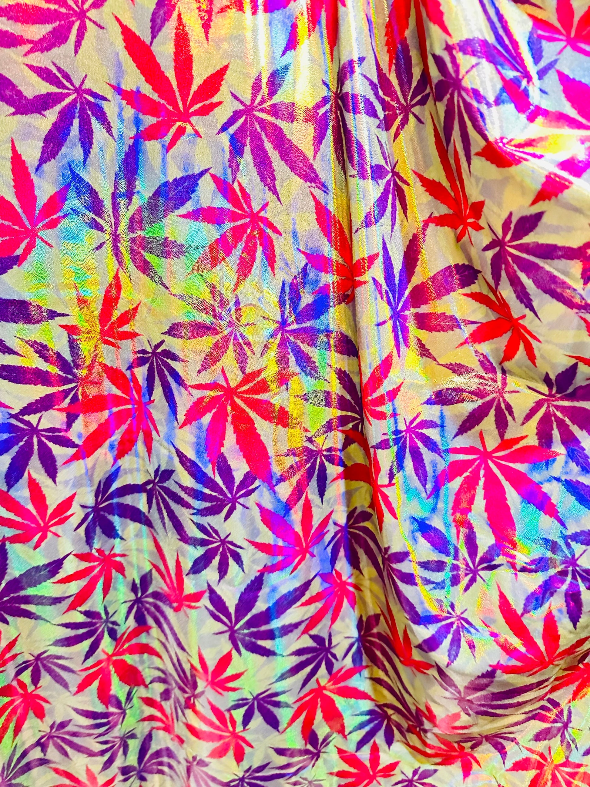 New Marijuana leaf design on Iridescent metallic nylon spandex with foggy foil 4-way stretch 58/60”