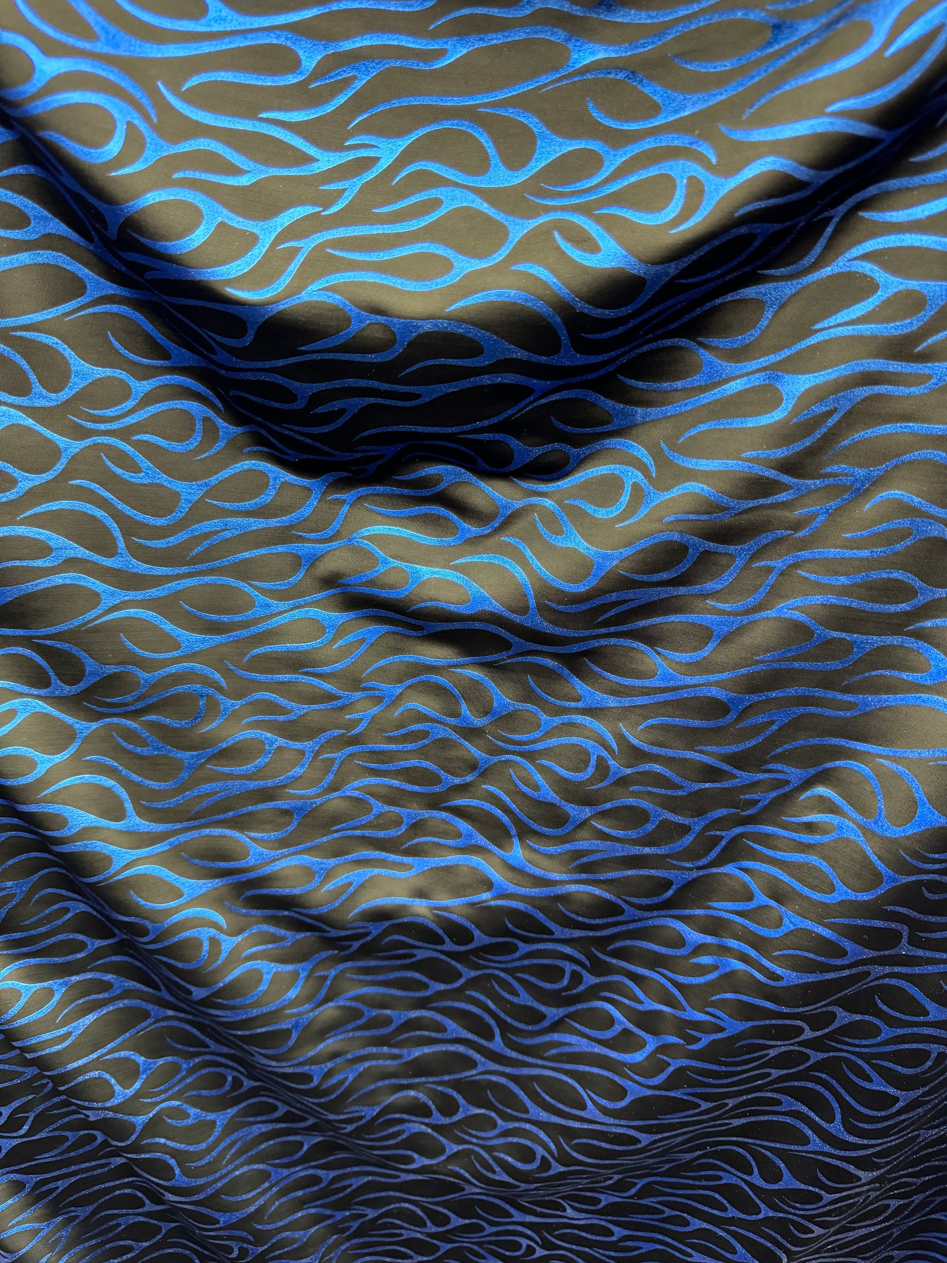 New metallic flames design on nylon spandex 4-way stretch 58/60” Sold by the YD. Ships worldwide from Los Angeles California USA.