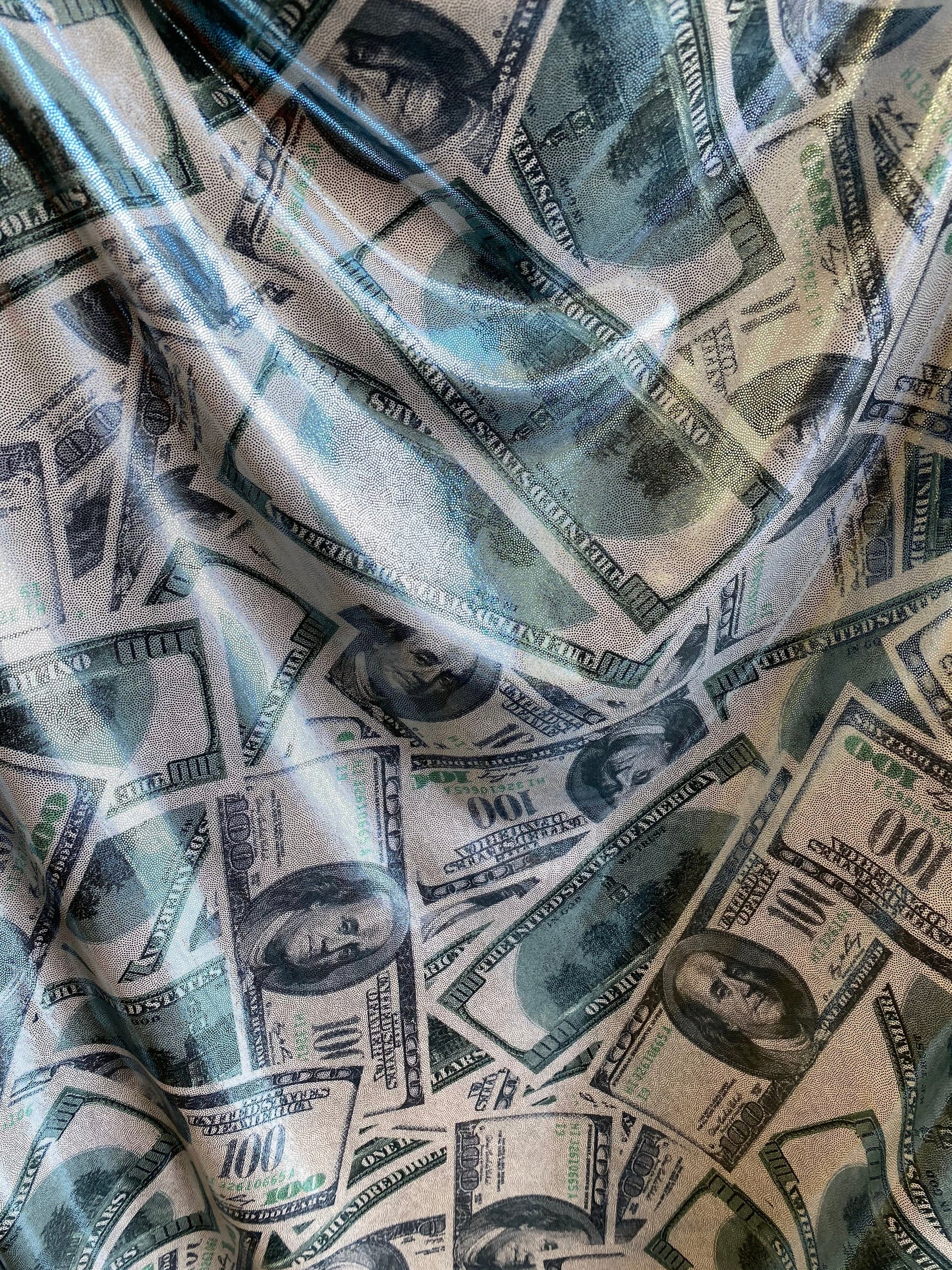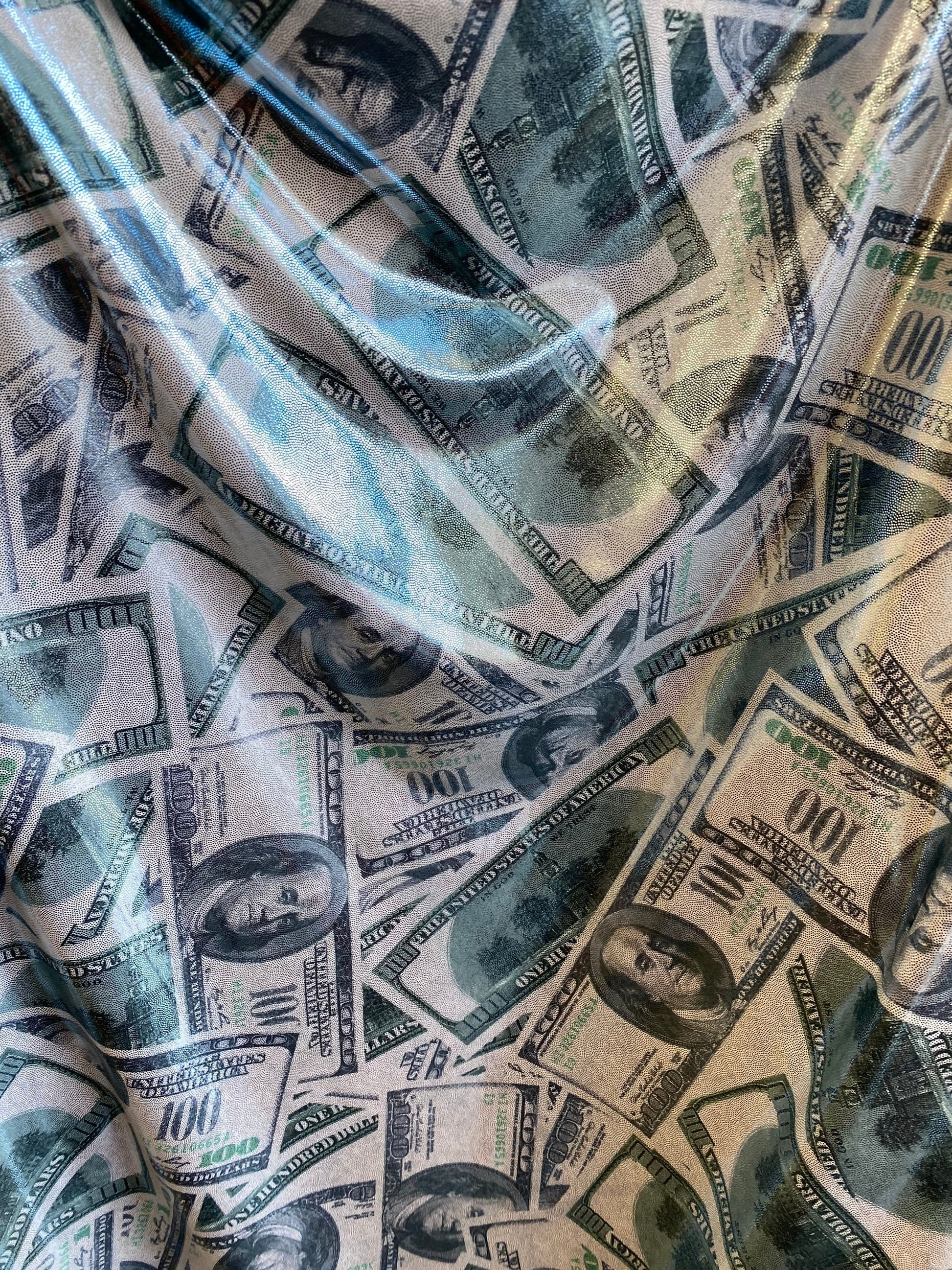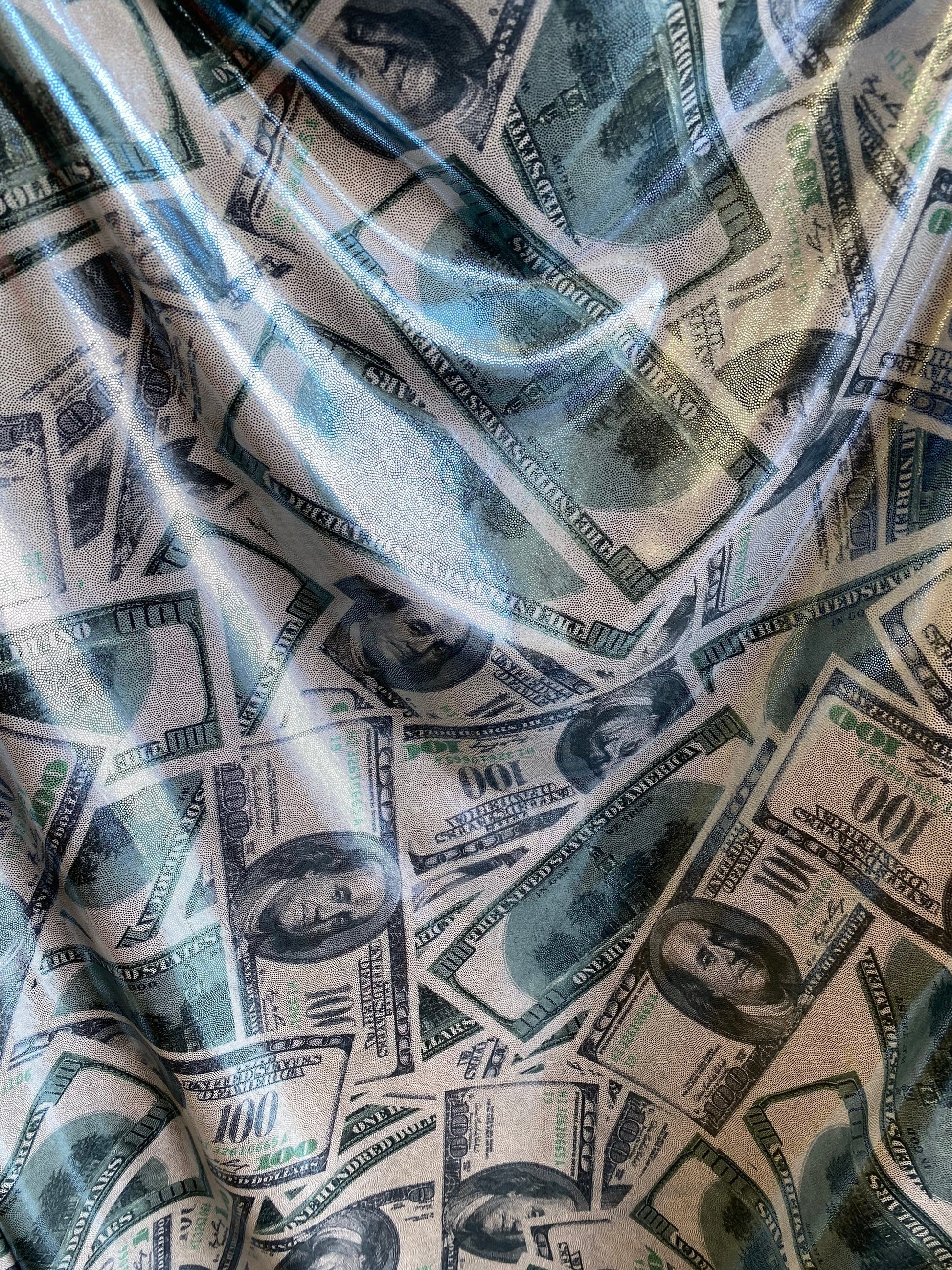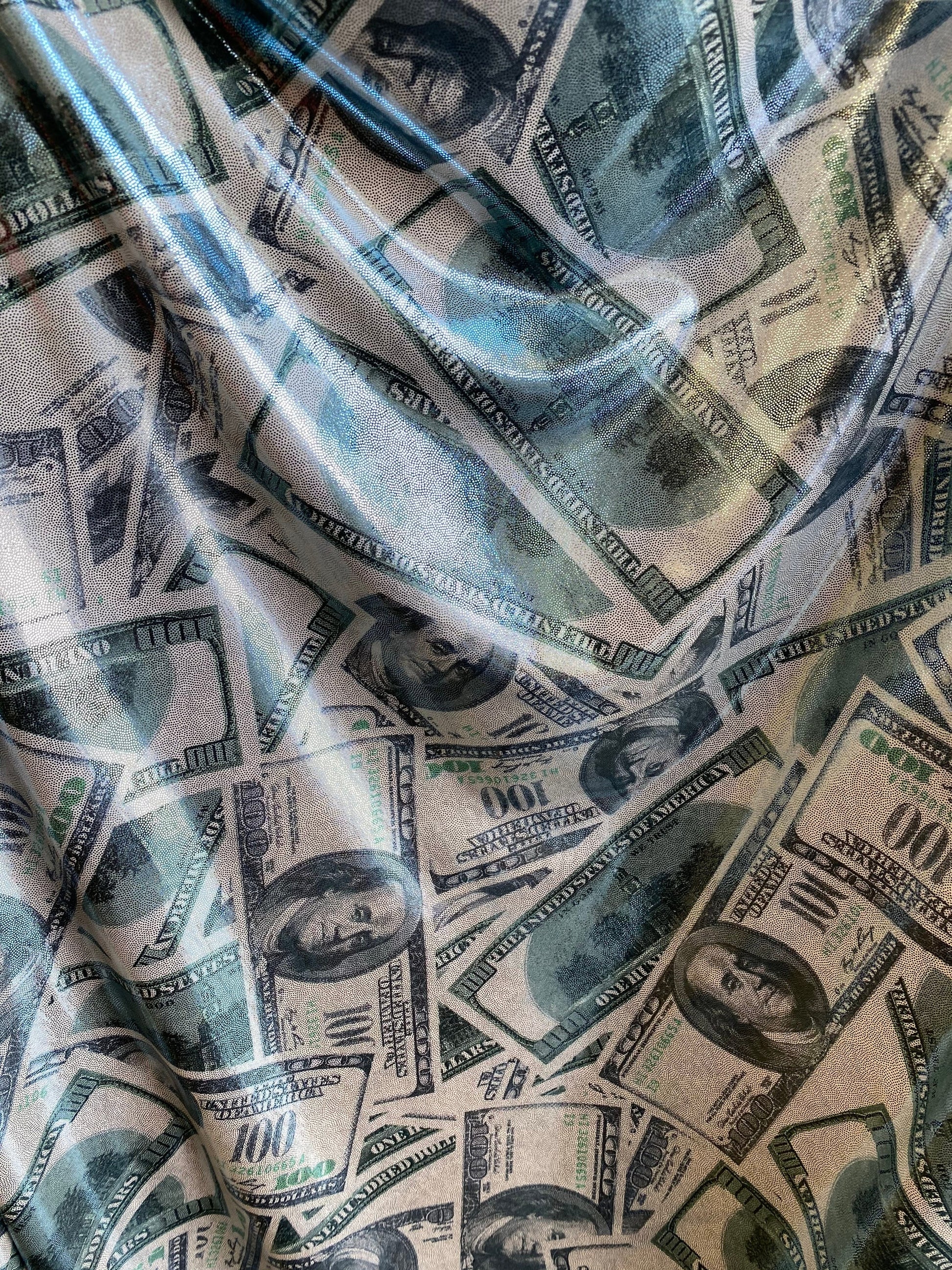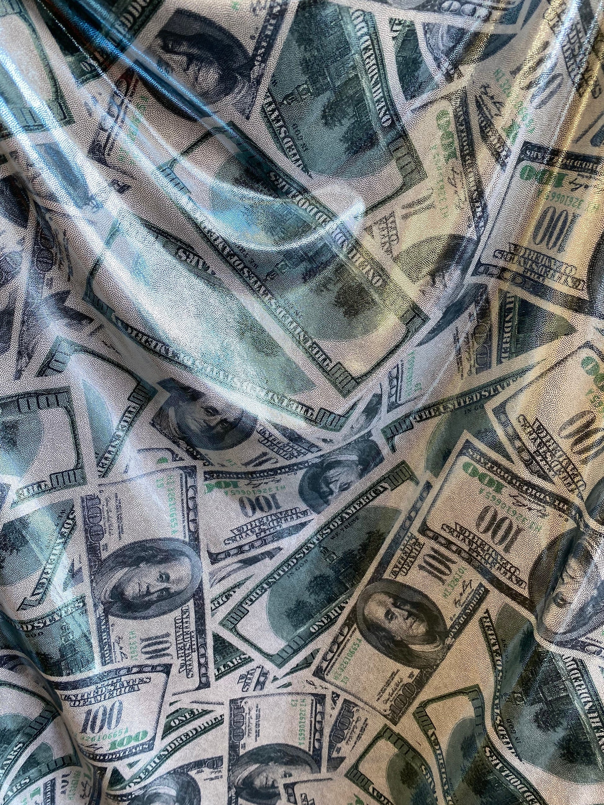 New metallic money design hologram Silver/green 100 dollar bill print on good quality of nylon 4-way spandex with foggy foil all over 58/60” Sold by the YD. Ships worldwide from Los Angeles California USA.