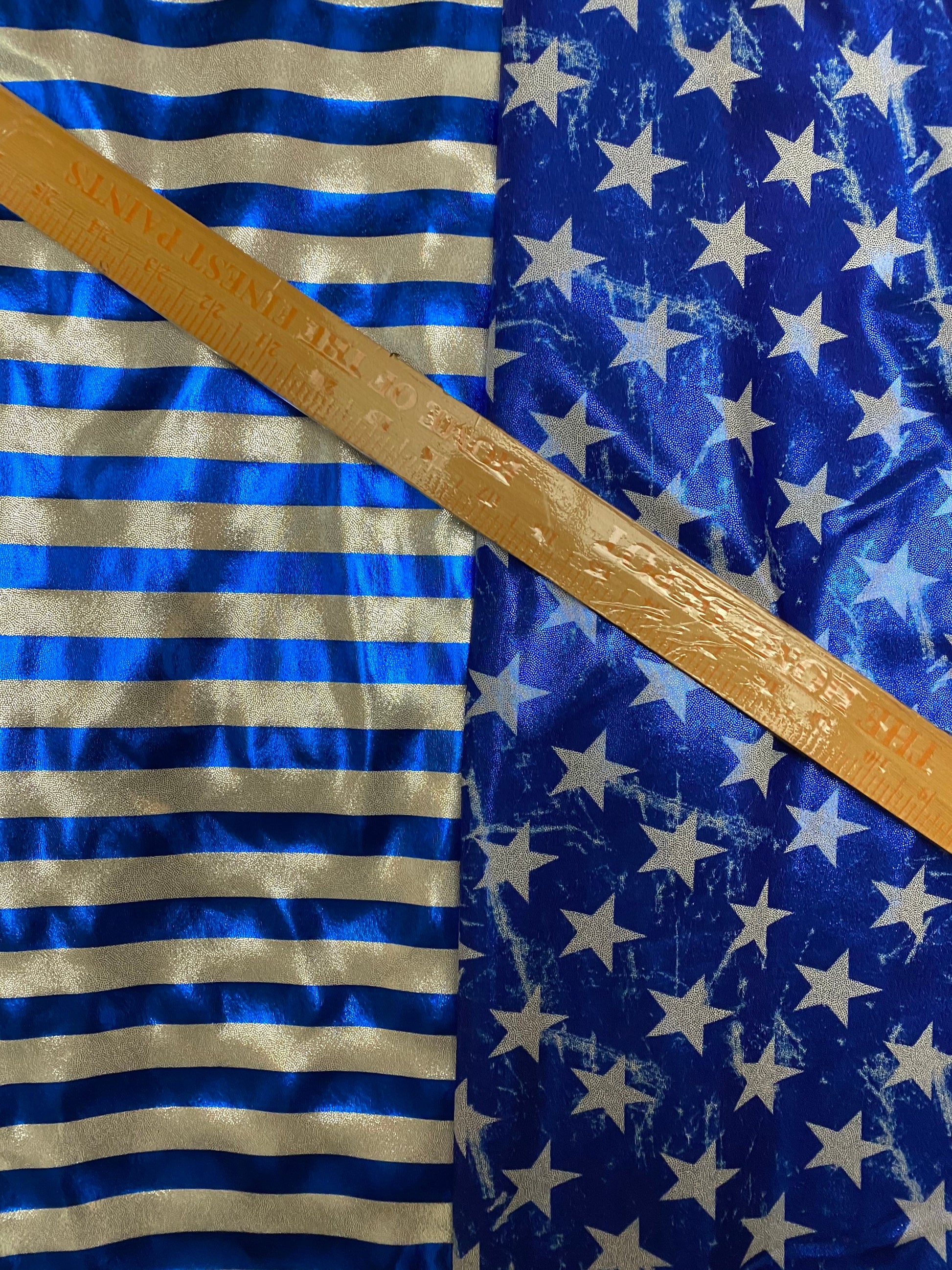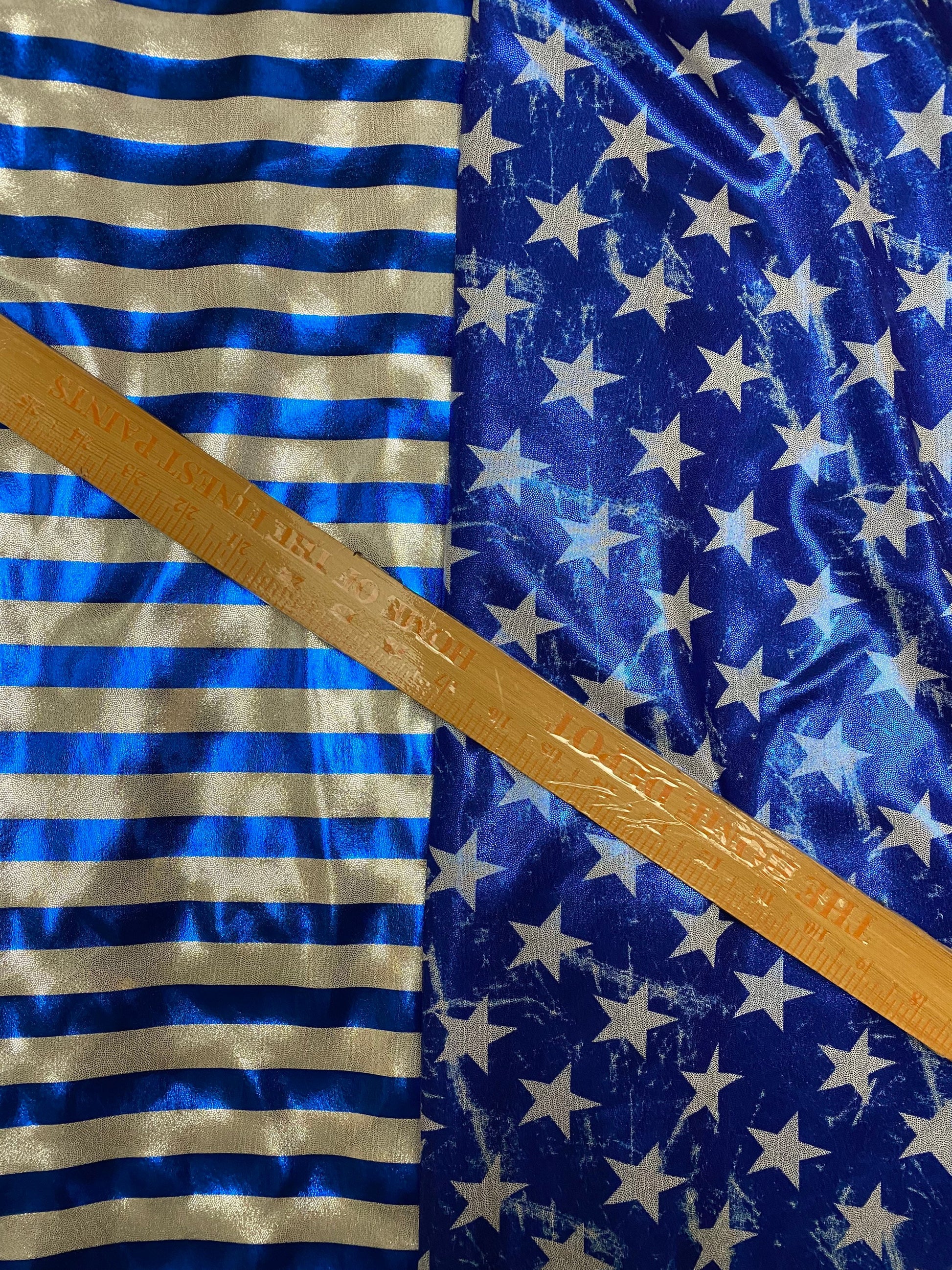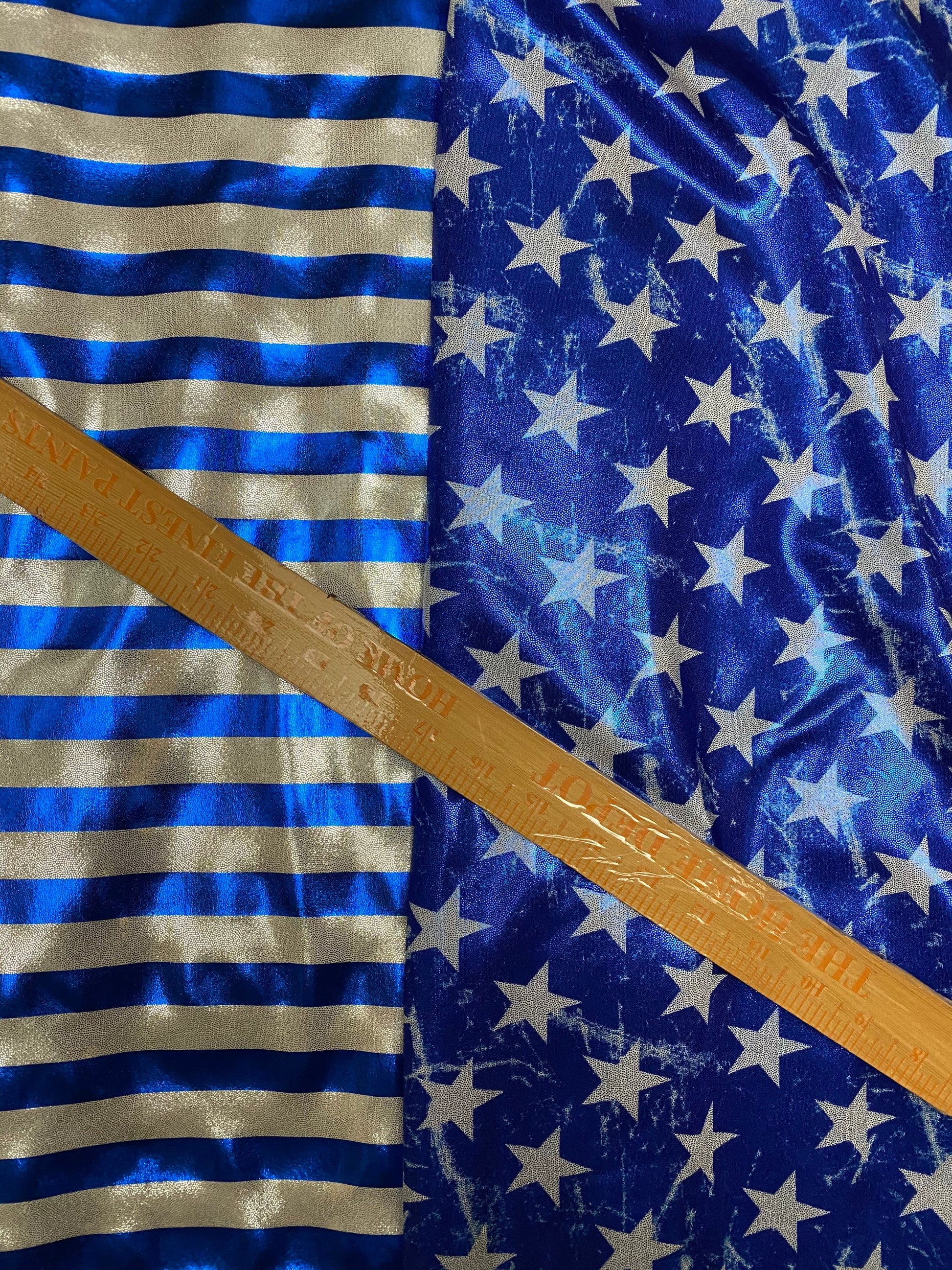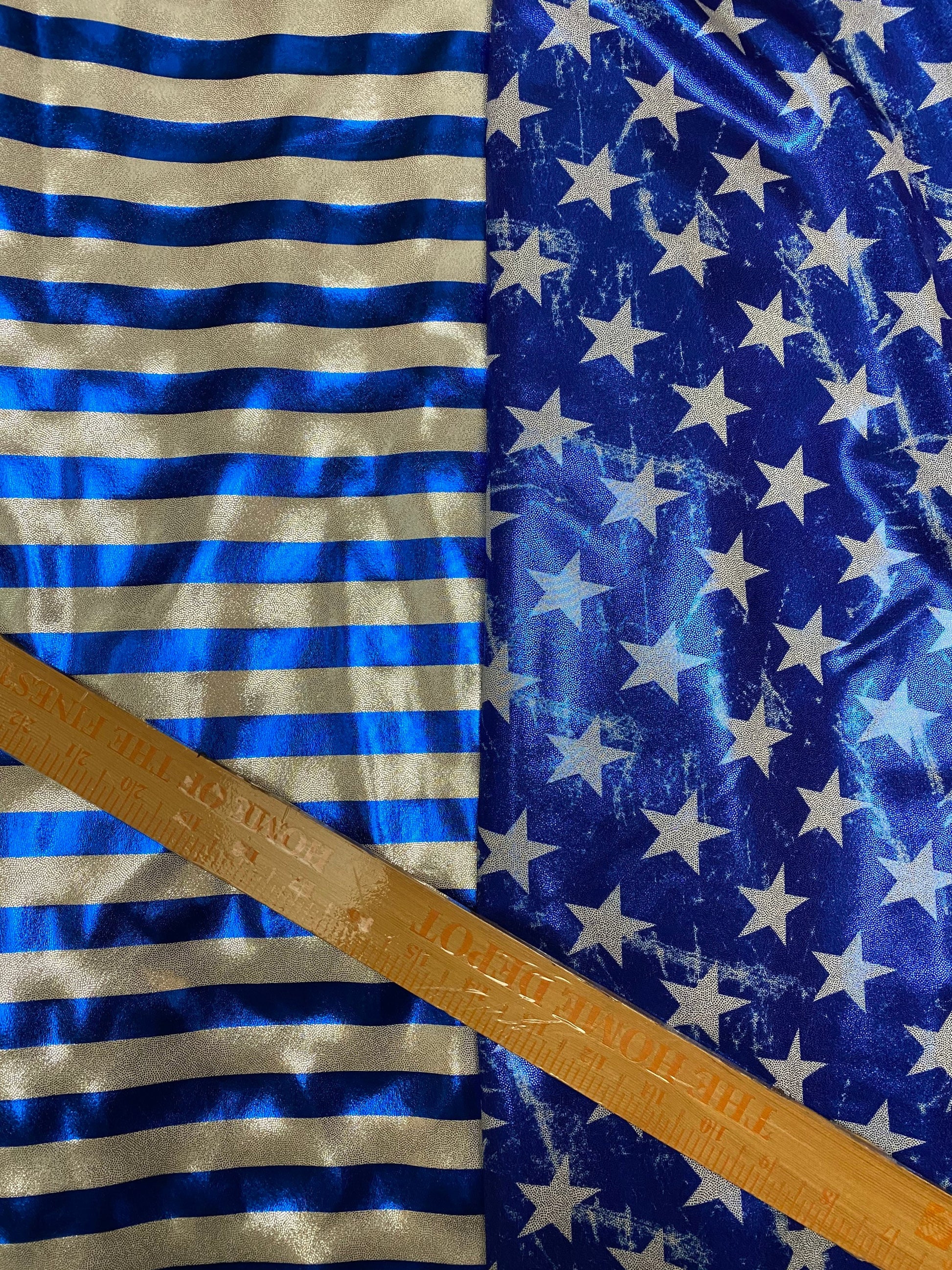 New metallic nylon spandex stripes blue/silver and stars design blue white spandex with foggy foil 4-way stretch 58/60” Sold by the YD. Ships worldwide from Los Angeles California USA.