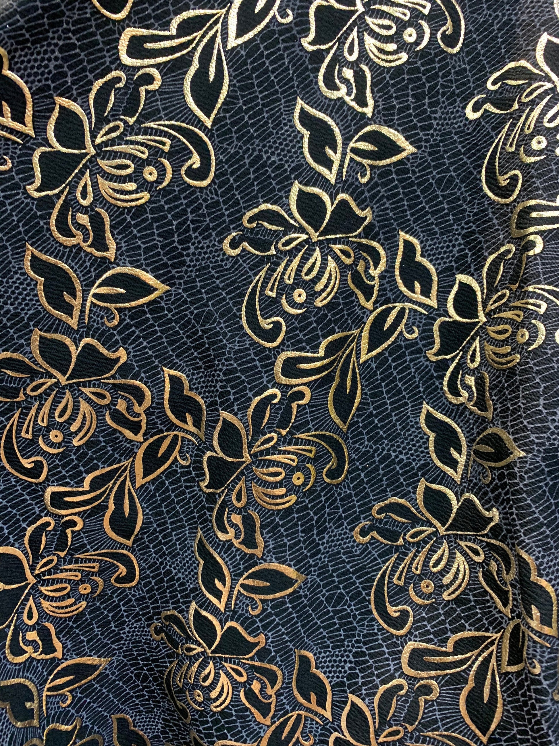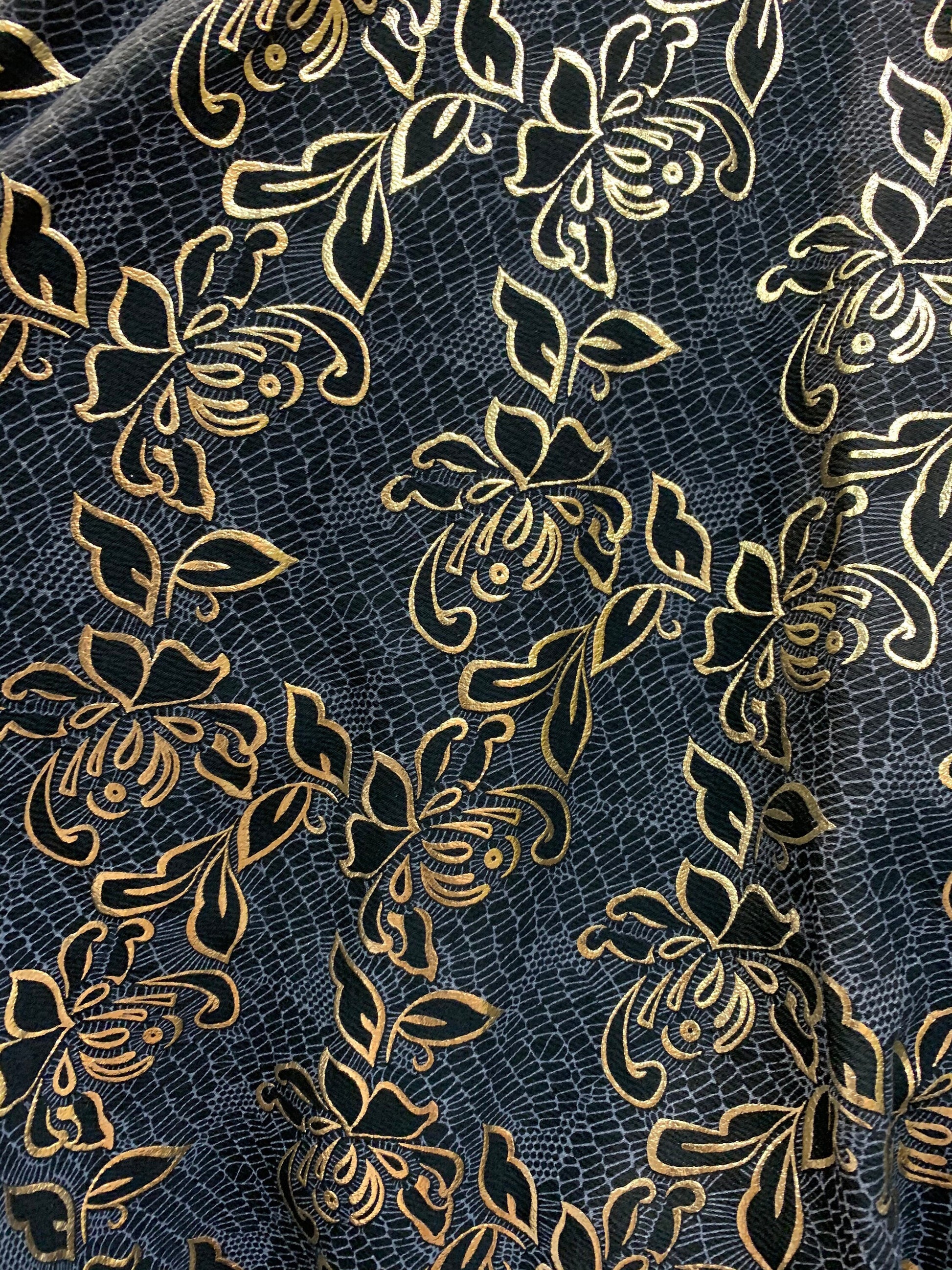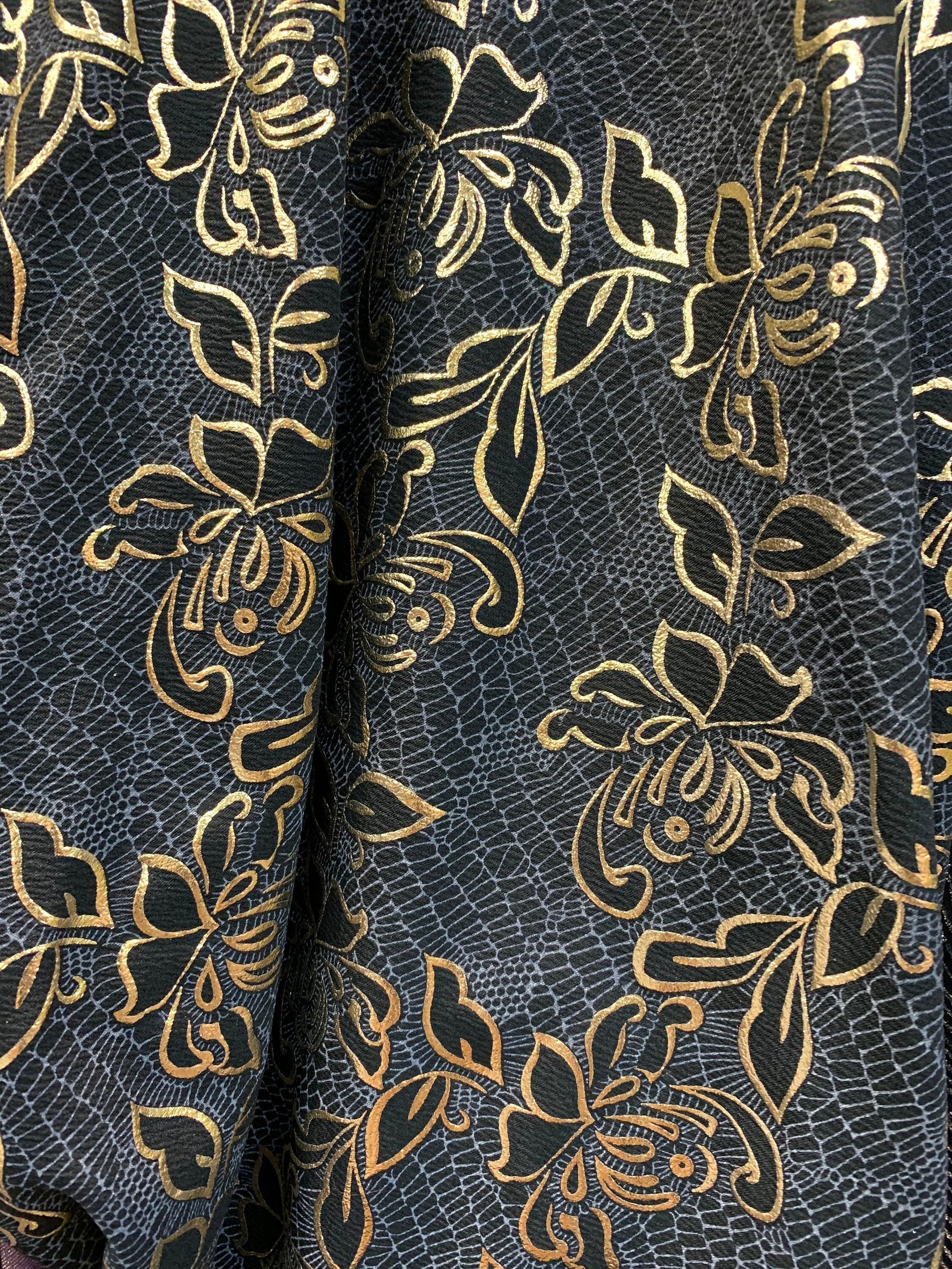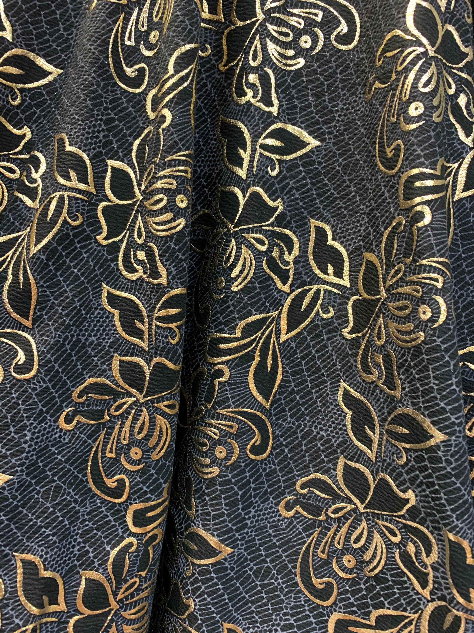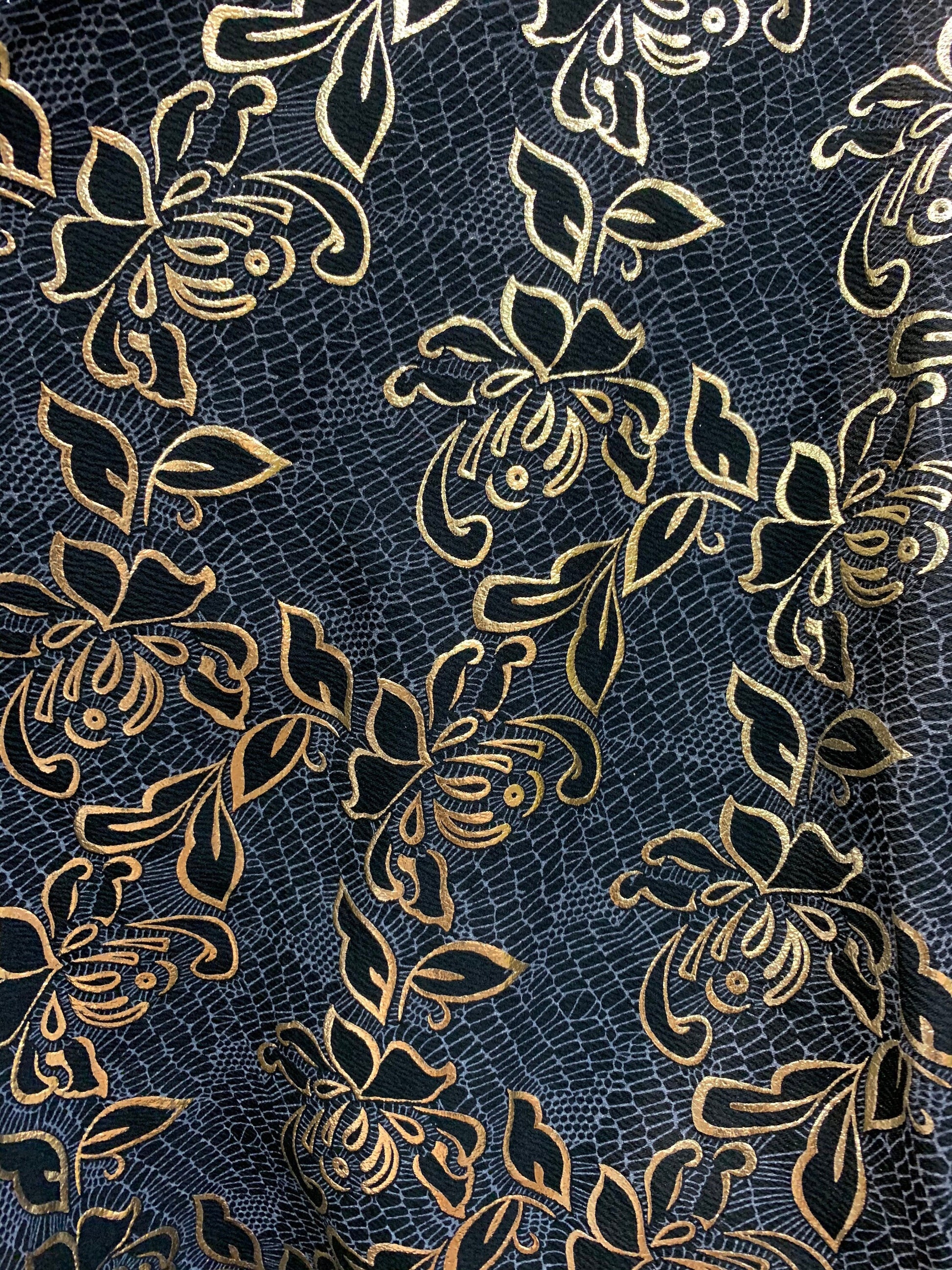 New metallic poly spandex flower design Black/gold 2-way stretch 58/60” Sold by the YD. Ships worldwide from Los Angeles California USA.