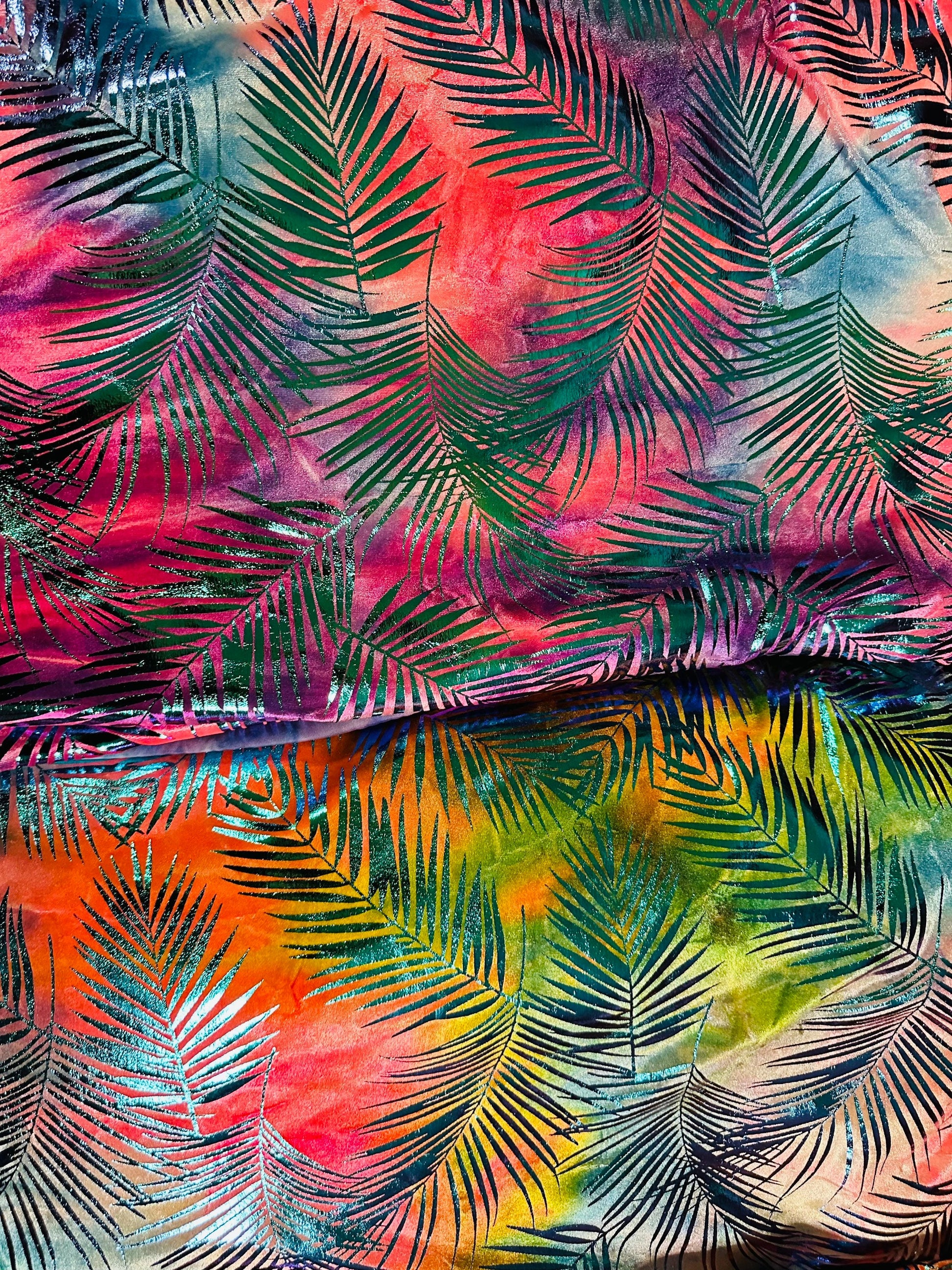 New Miami Tropical design luxury tie dye velvet with foil 4-way stretch 58/60” Sold by the YD. Ships worldwide from Los Angeles California USA
