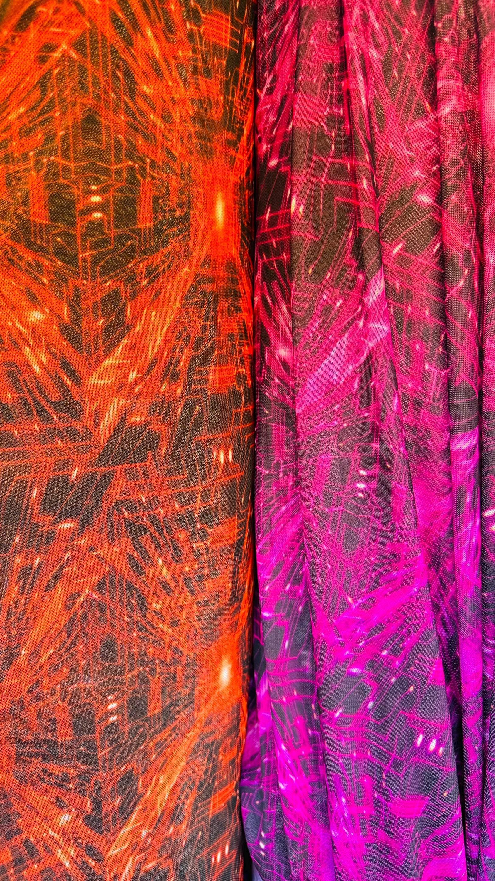 New 3D Digital abstract design print on great quality of power mesh nylon spandex 4-way stretch 58/60” Sold by the YD. Ships worldwide from Los Angeles California USA. High quality fabrics by AlexLAFabrics