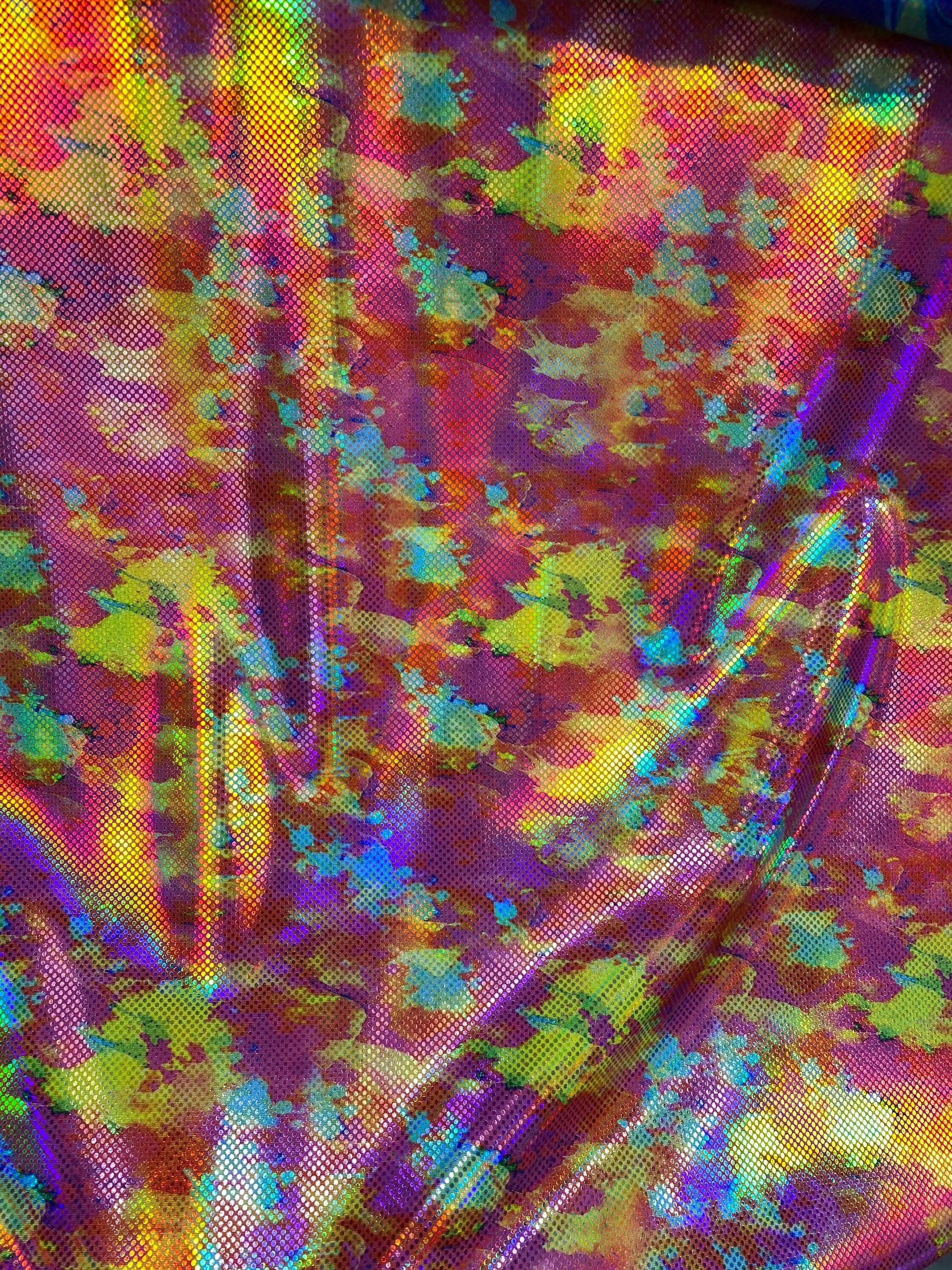 New modern abstract design yellow/pink/red digital foil print lacer hologram metallic nylon spandex 4-way stretch 58/60” Sold by the YD. Ships worldwide from Los Angeles California USA.