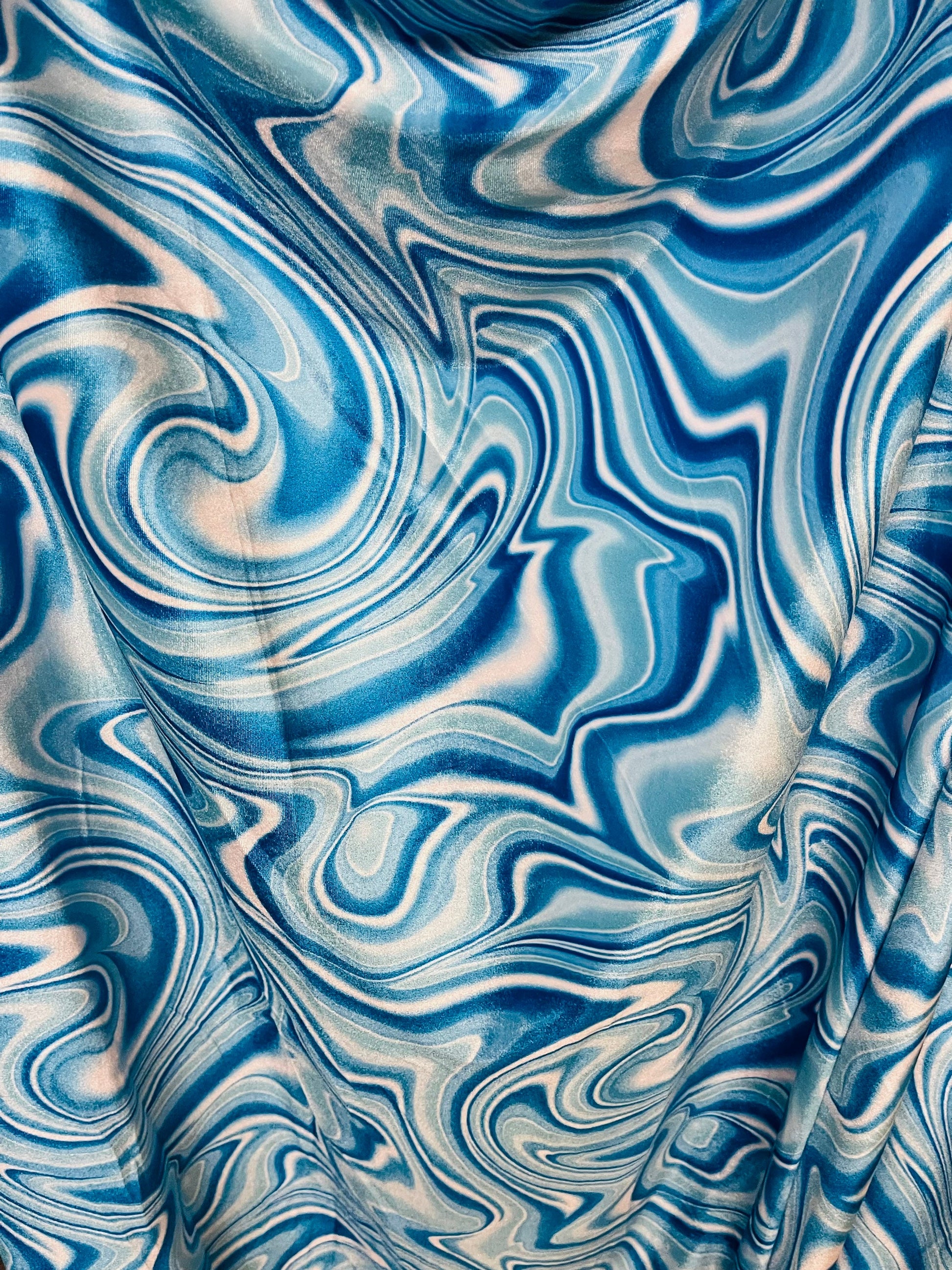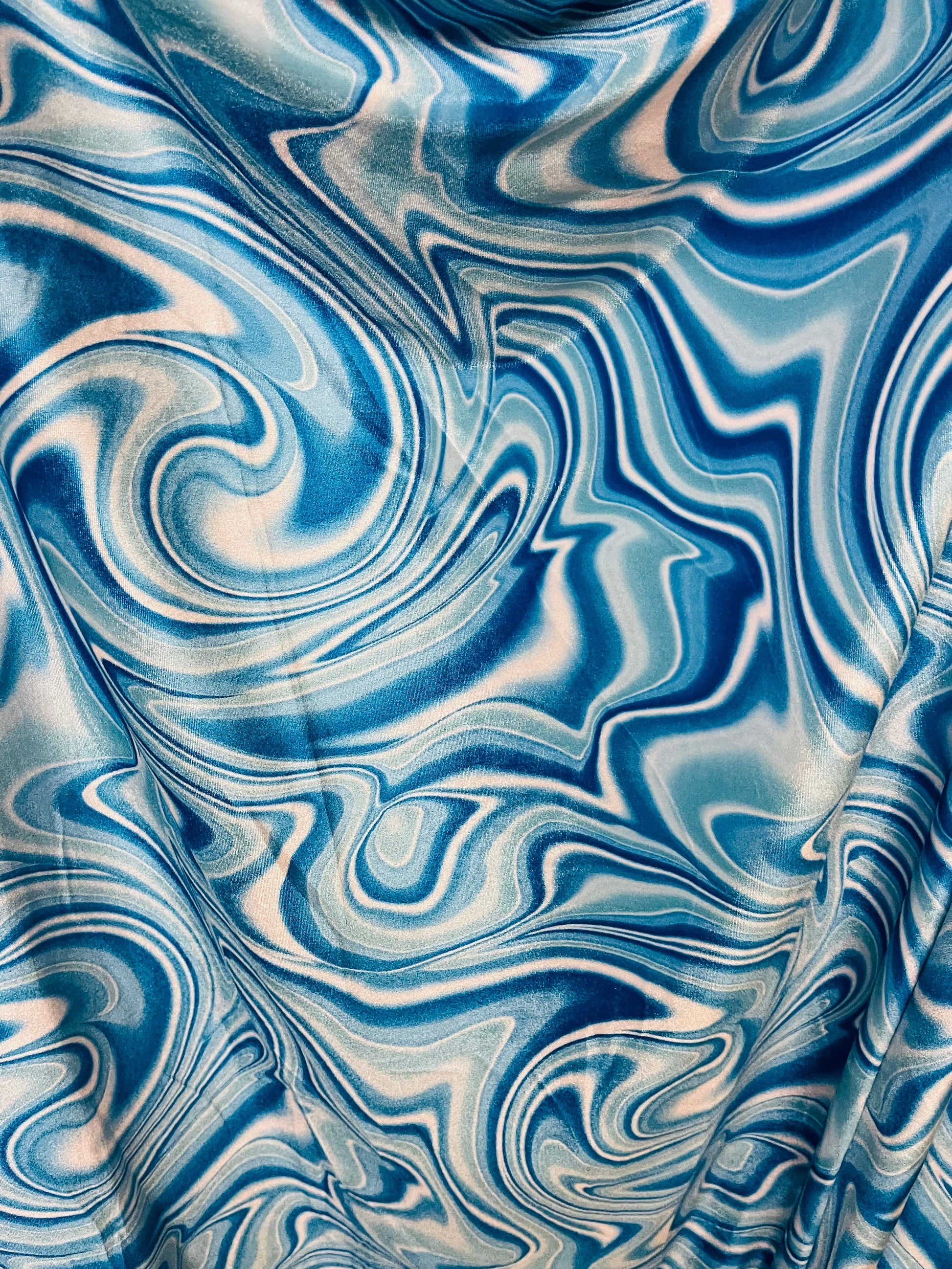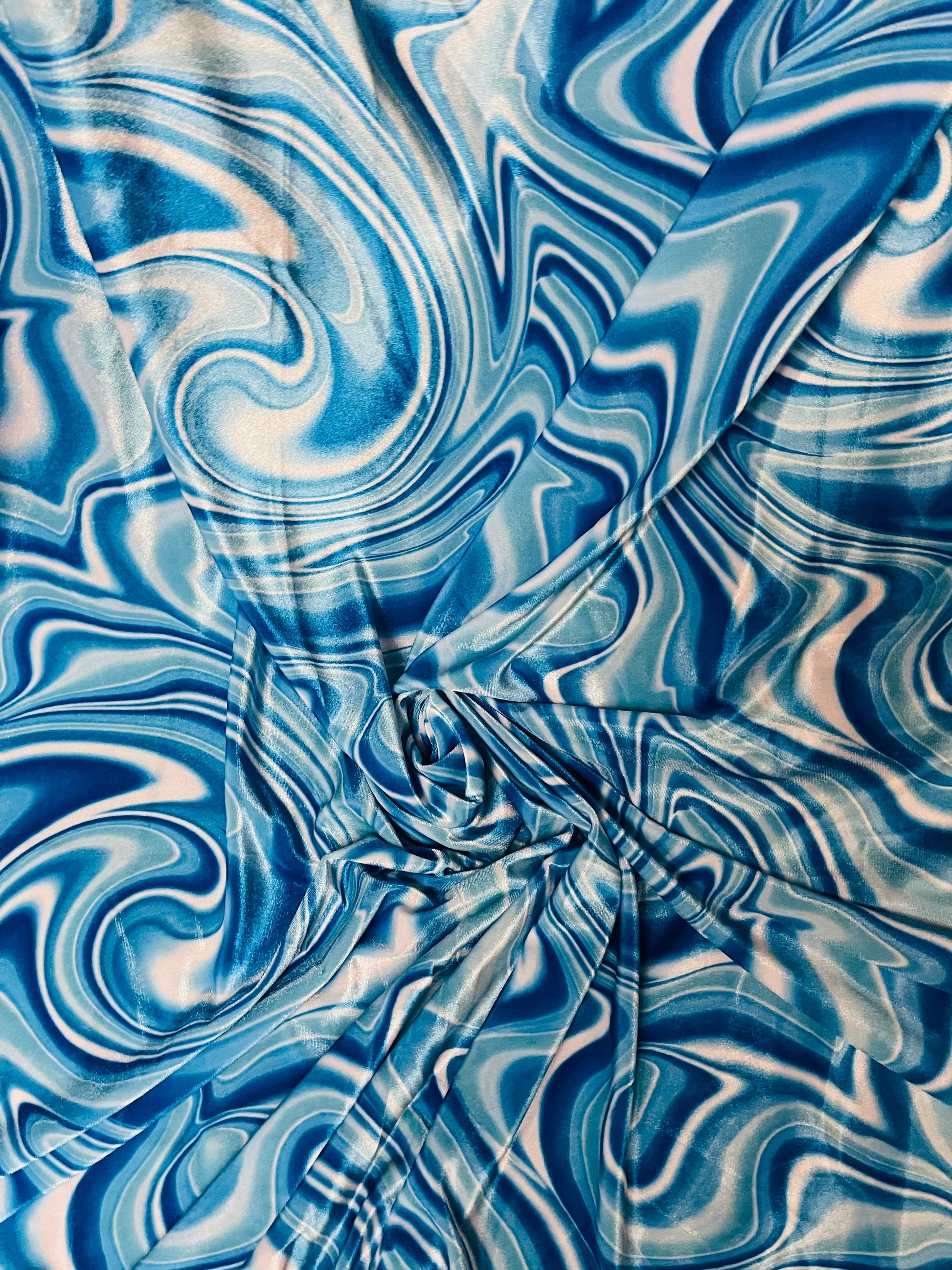 New Modern abstract lava design blue/multicolor print on best quality of stretch velvet 4-way stretch 58/60” Sold by the YD. Ships Worldwide from Los Angeles California USA.