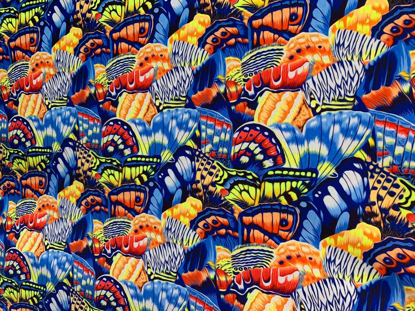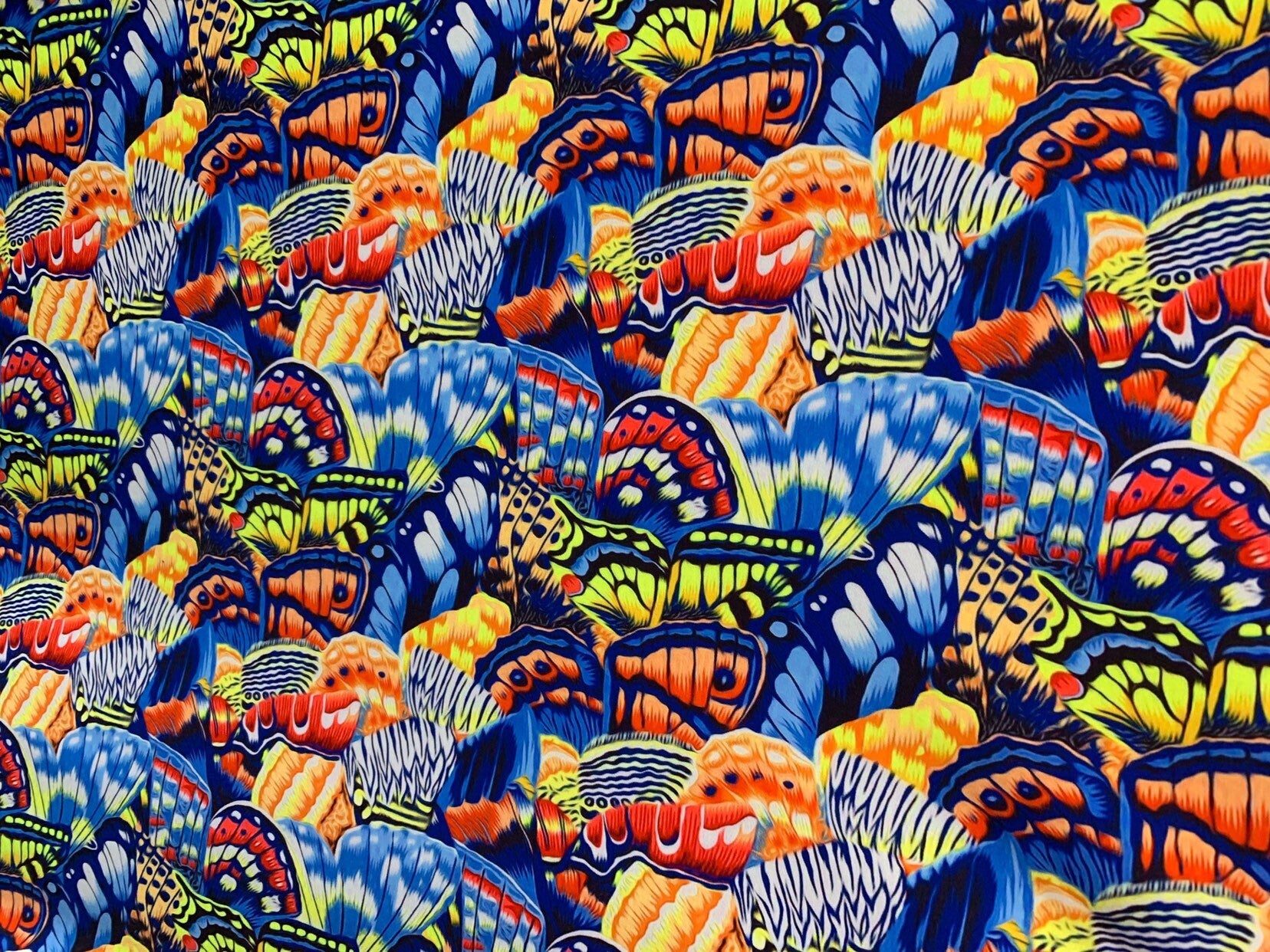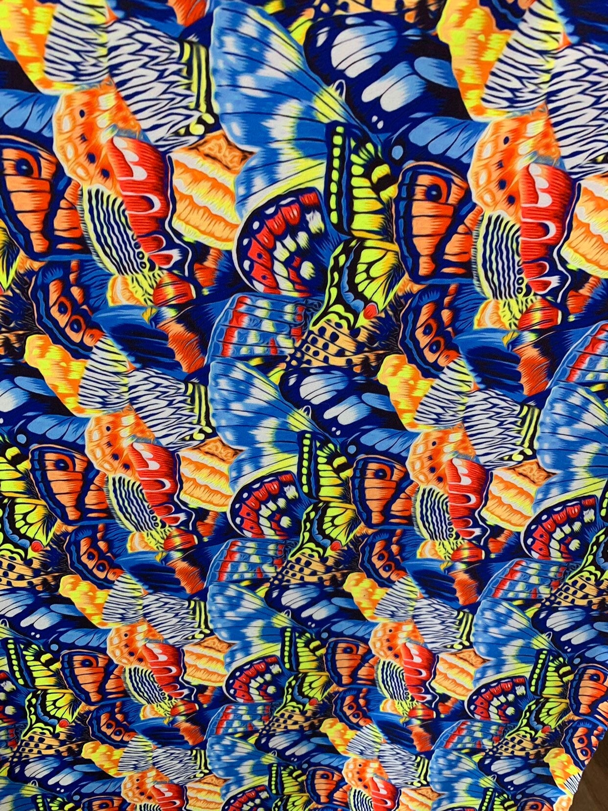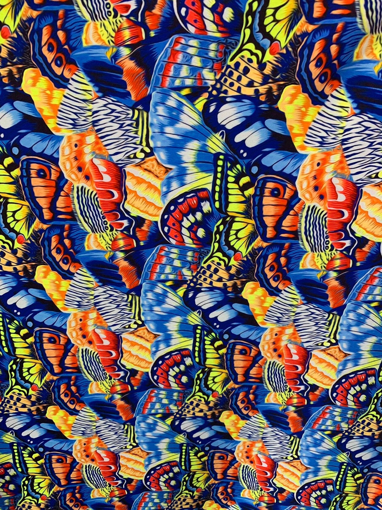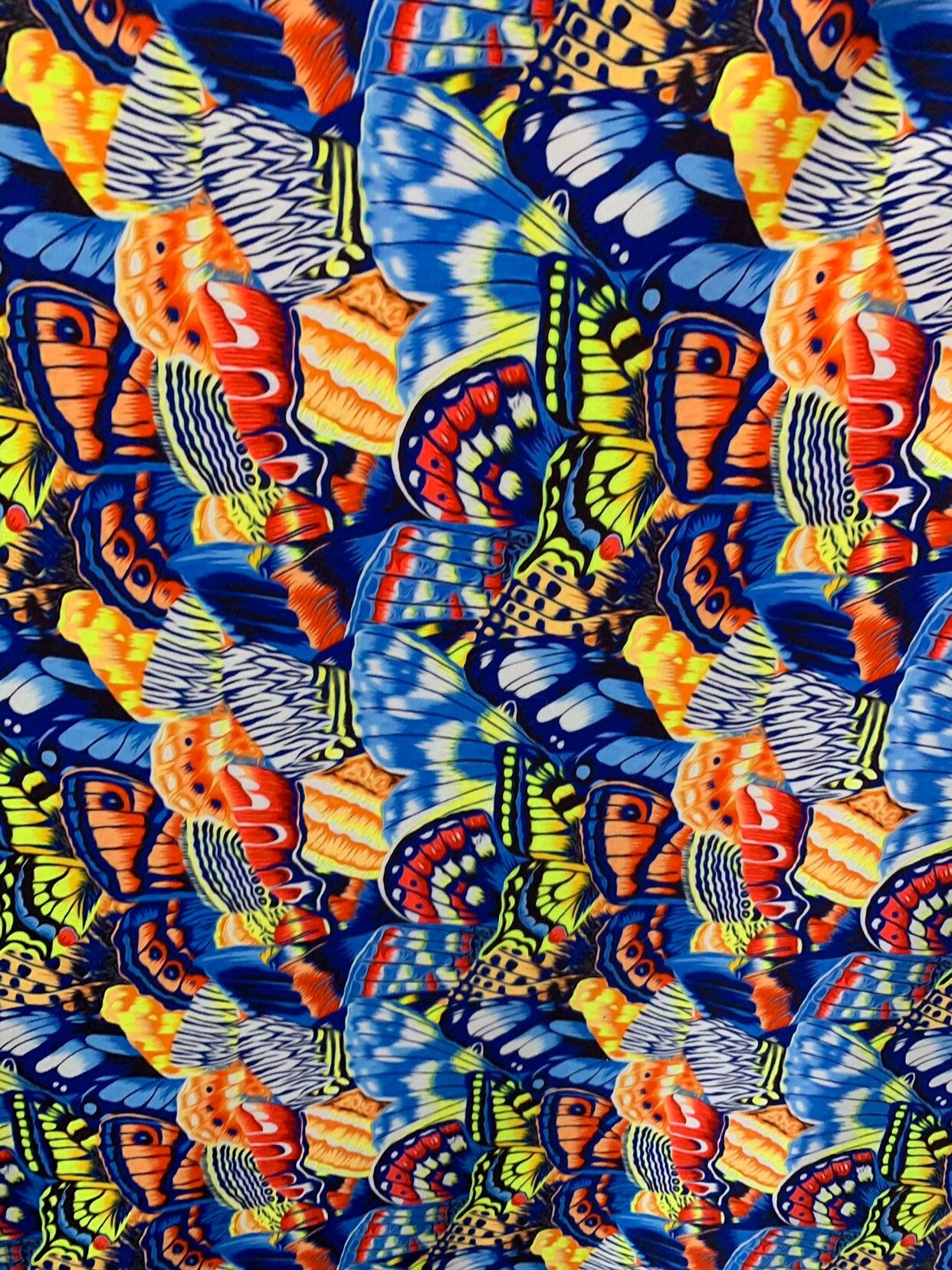 New multi butterflies design multicolor print on heavy nylon spandex 4way stretch 58/60" Sold by the YD. Ships worldwide from Los Angeles CA.