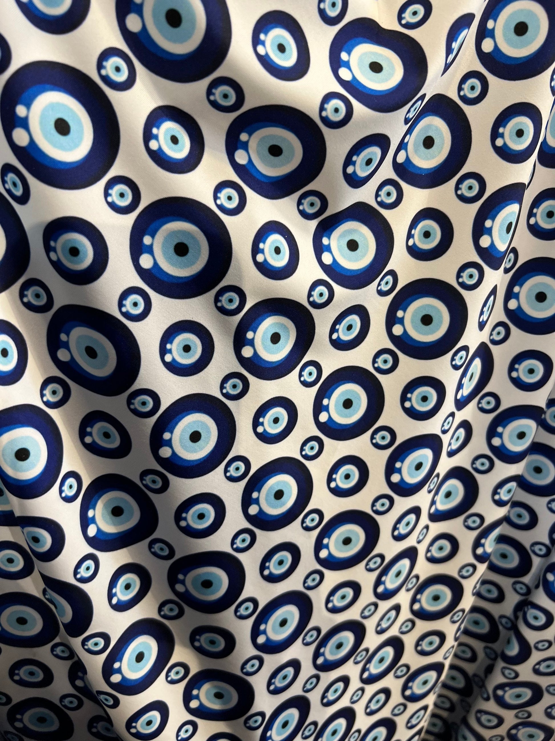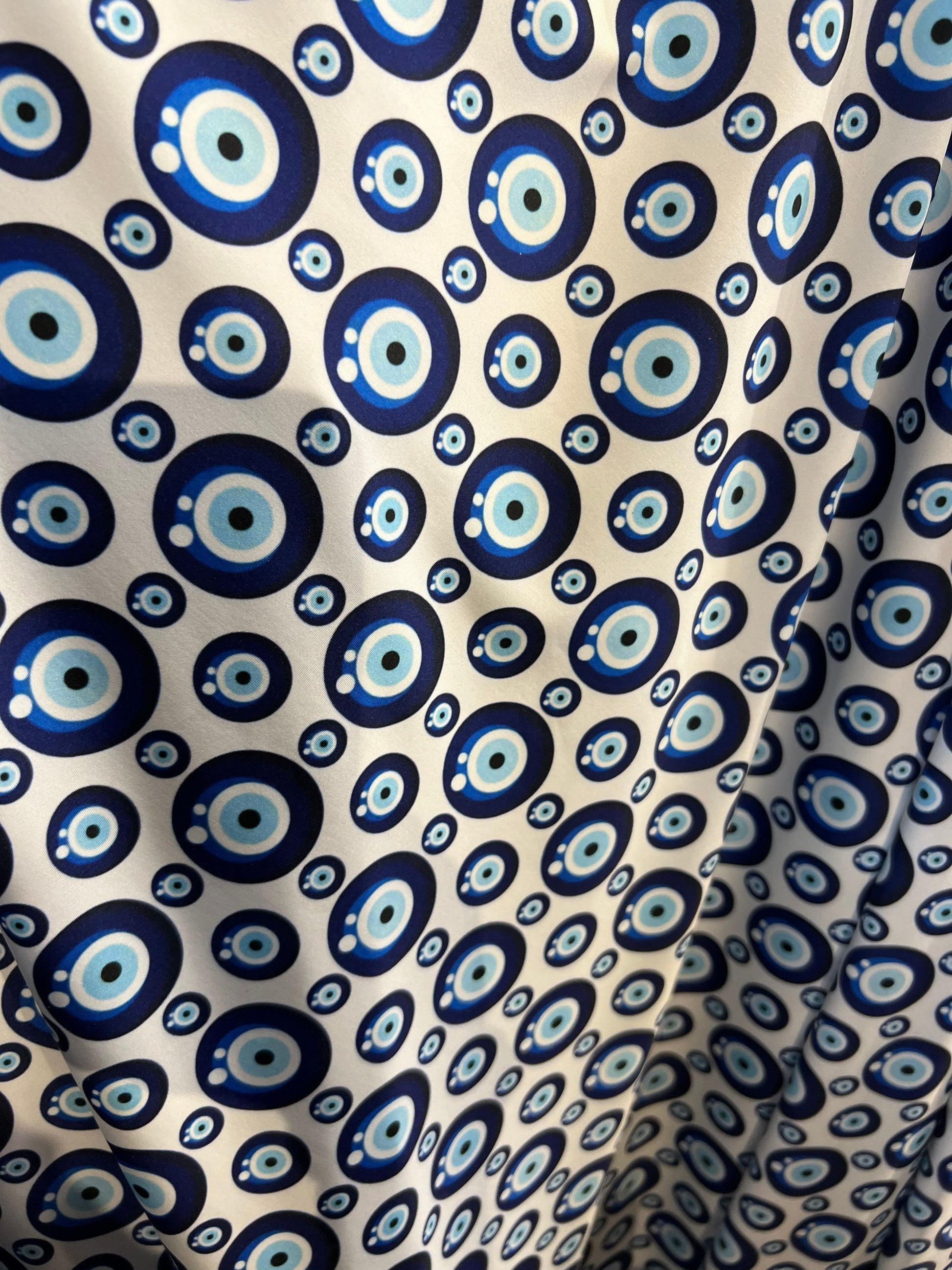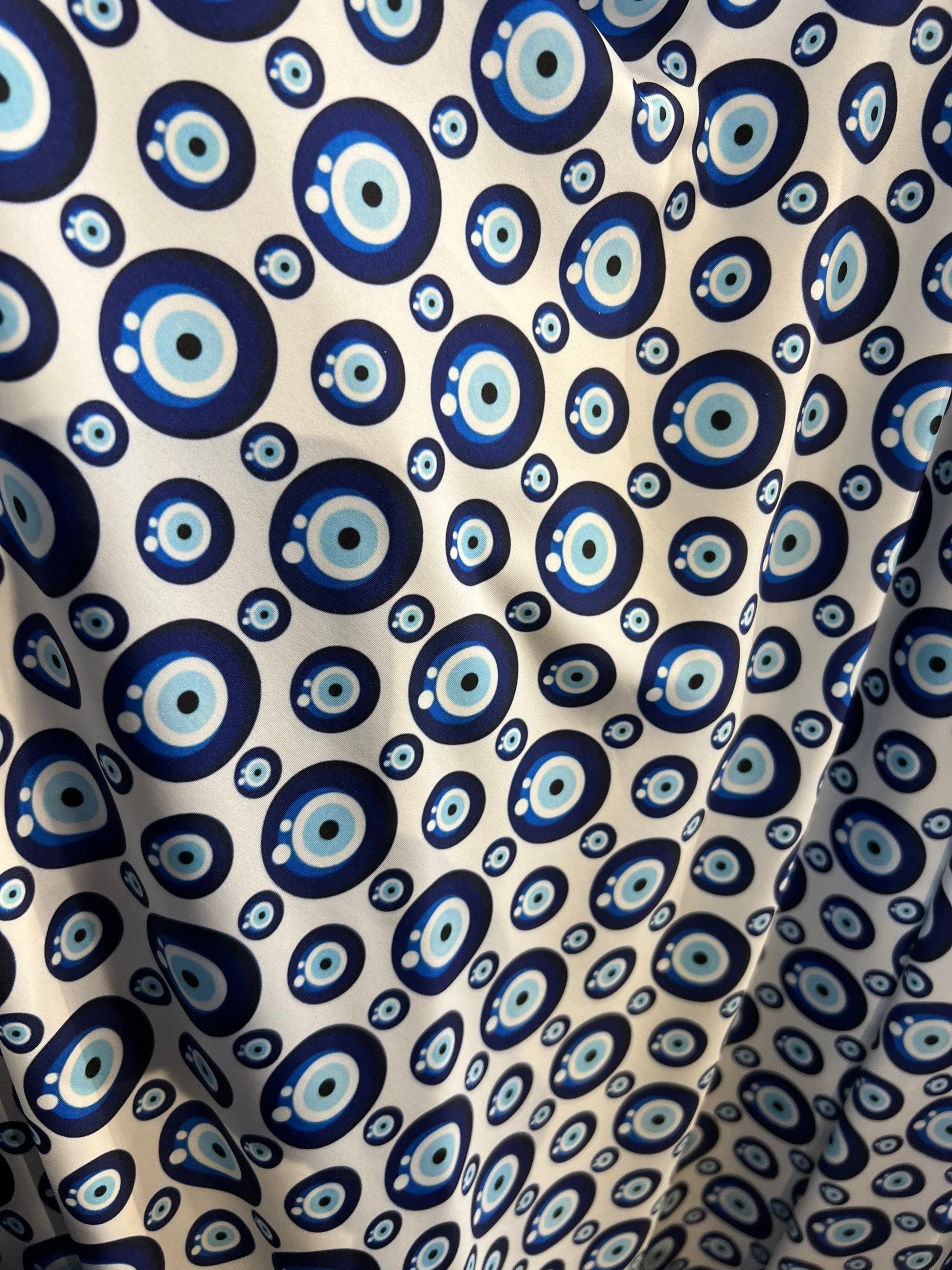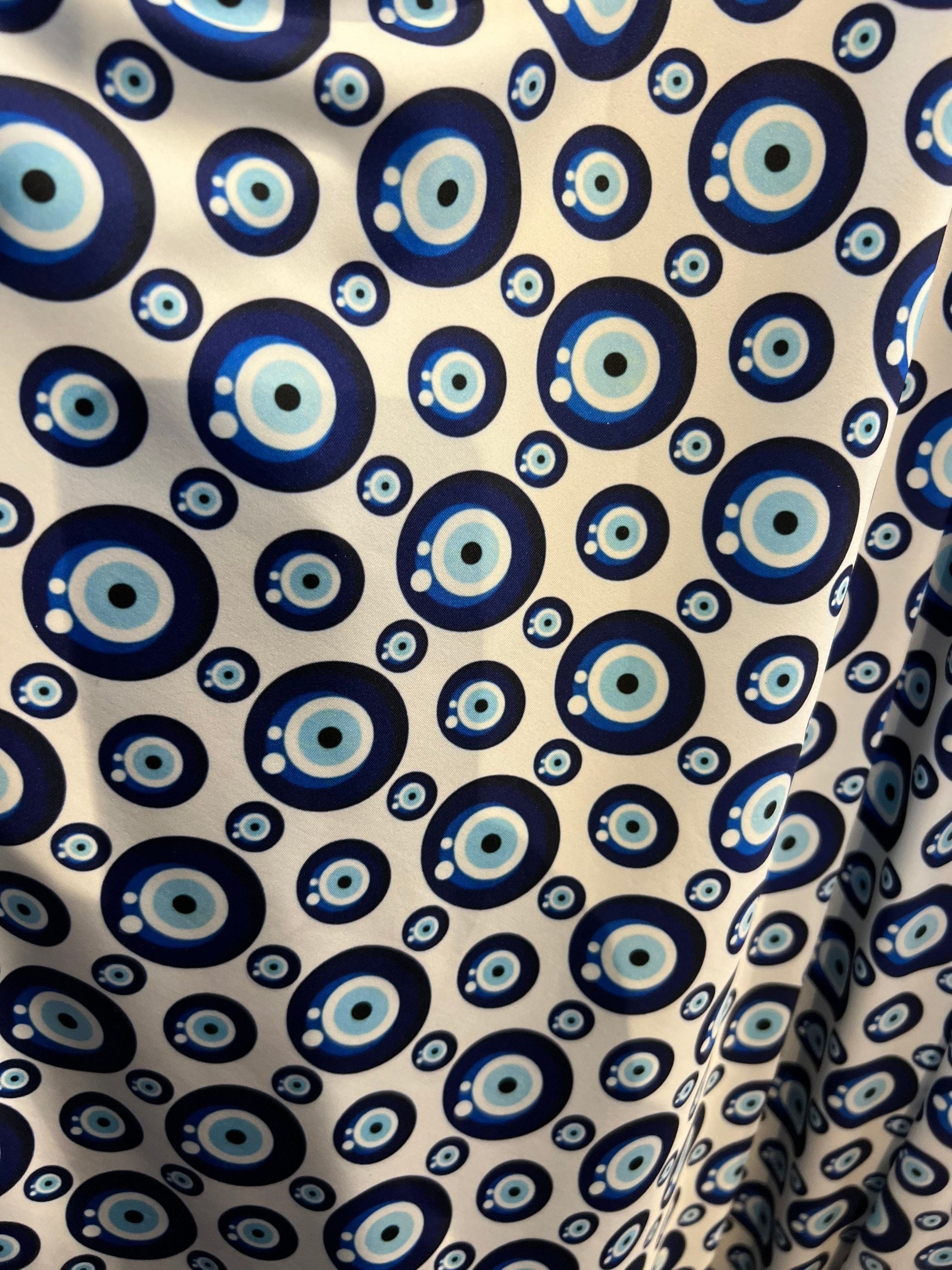 New Nazar Eye-Shape design print on great quality of nylon spandex 4-way stretch 58/60” Sold by the YD. Ships Worldwide from Los Angeles California USA.