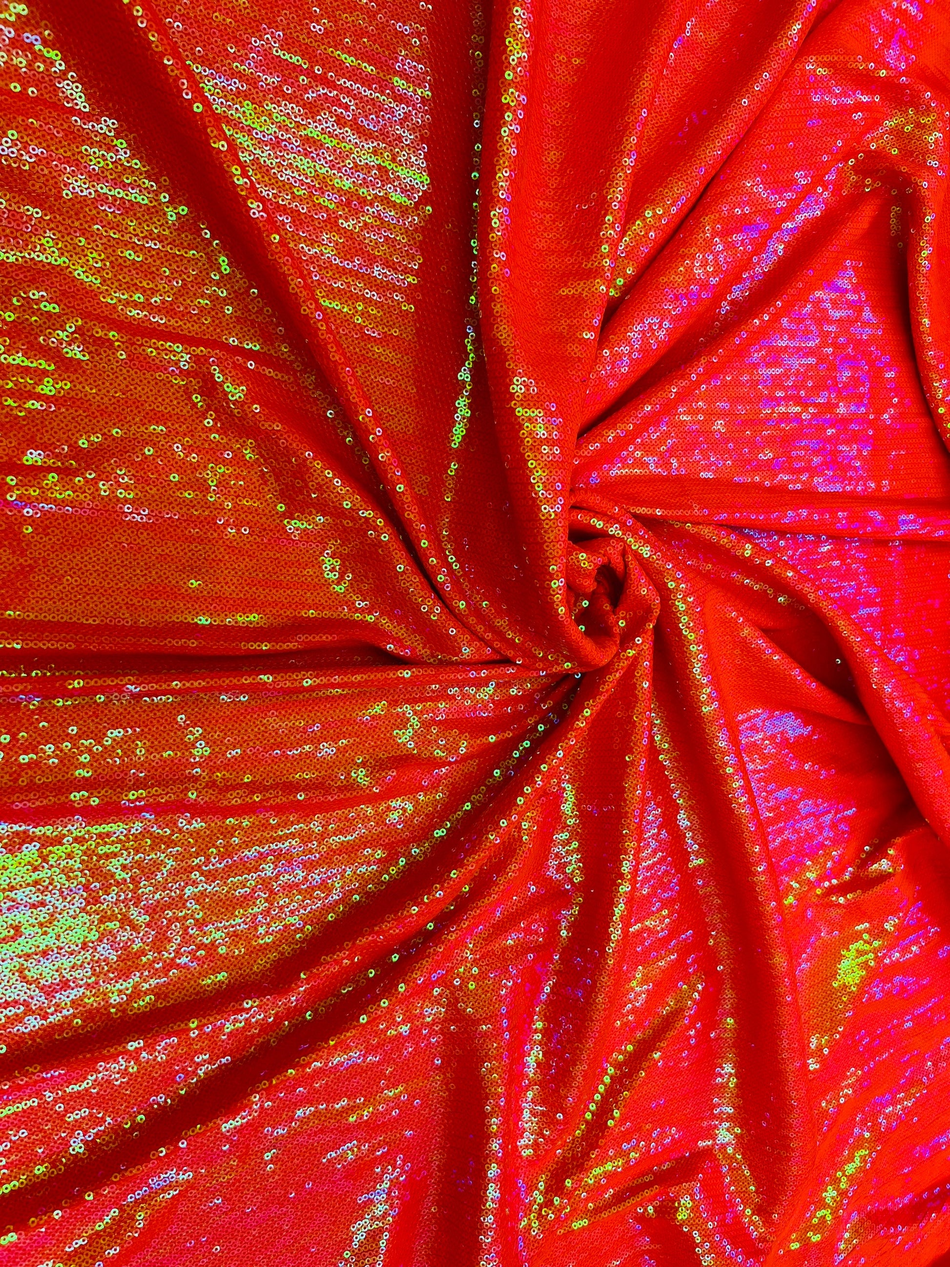 New neon colors iridescent mini sequins design embroidered on spandex base 2-way stretch 58/60” Sold by the YD. Ships Worldwide from Los Angeles California USA.
