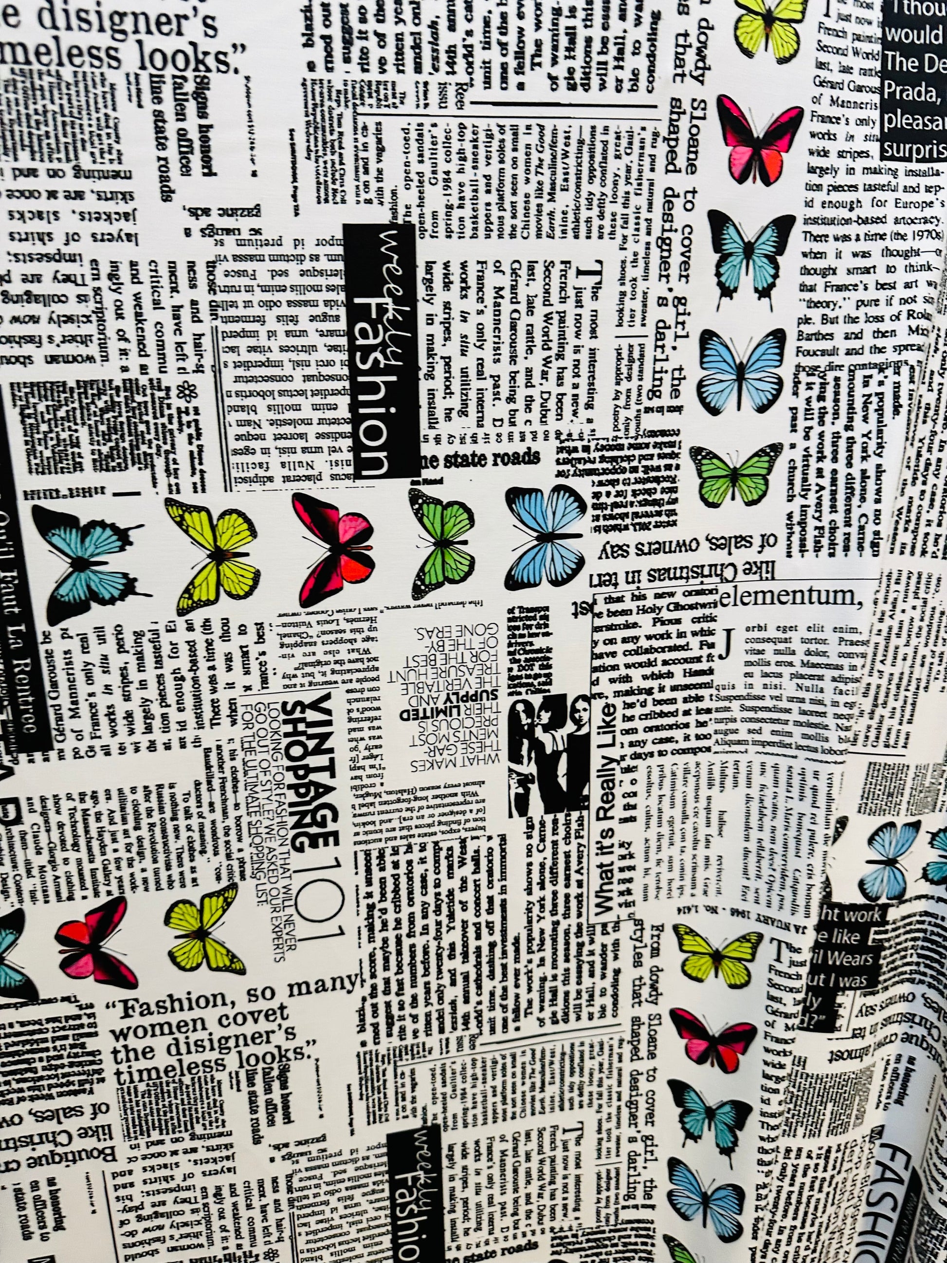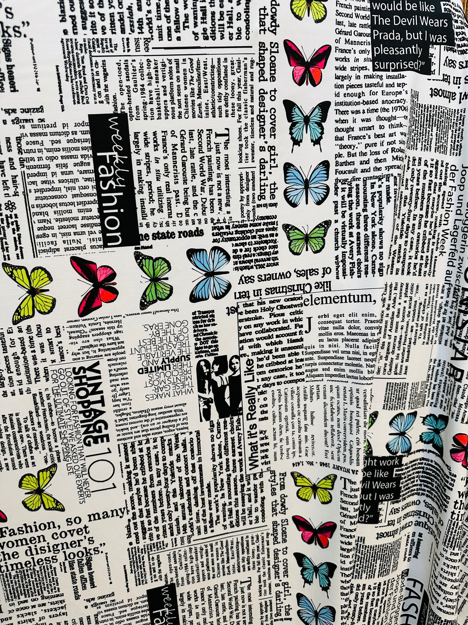 New Newspaper fashion Butterfly design print on great quality of nylon spandex 4-way stretch 58/60” Sold by the YD. Ships worldwide from Los Angeles California USA