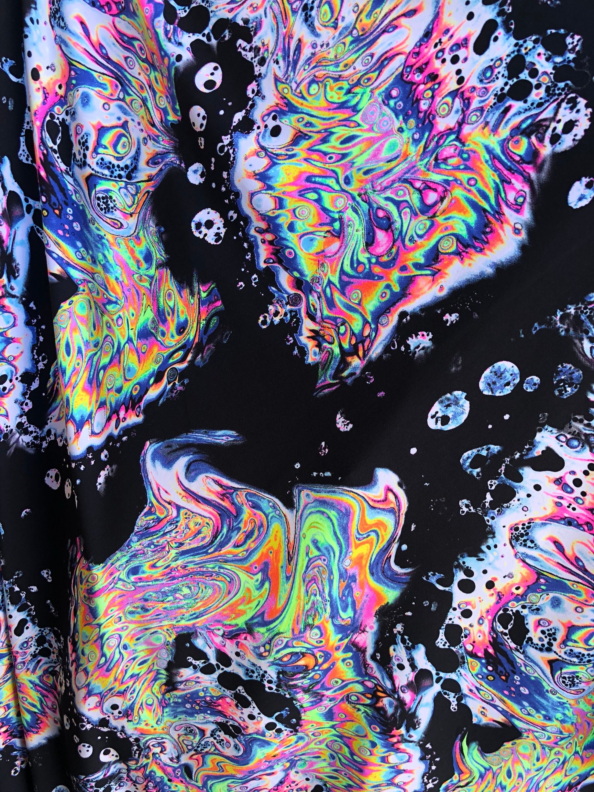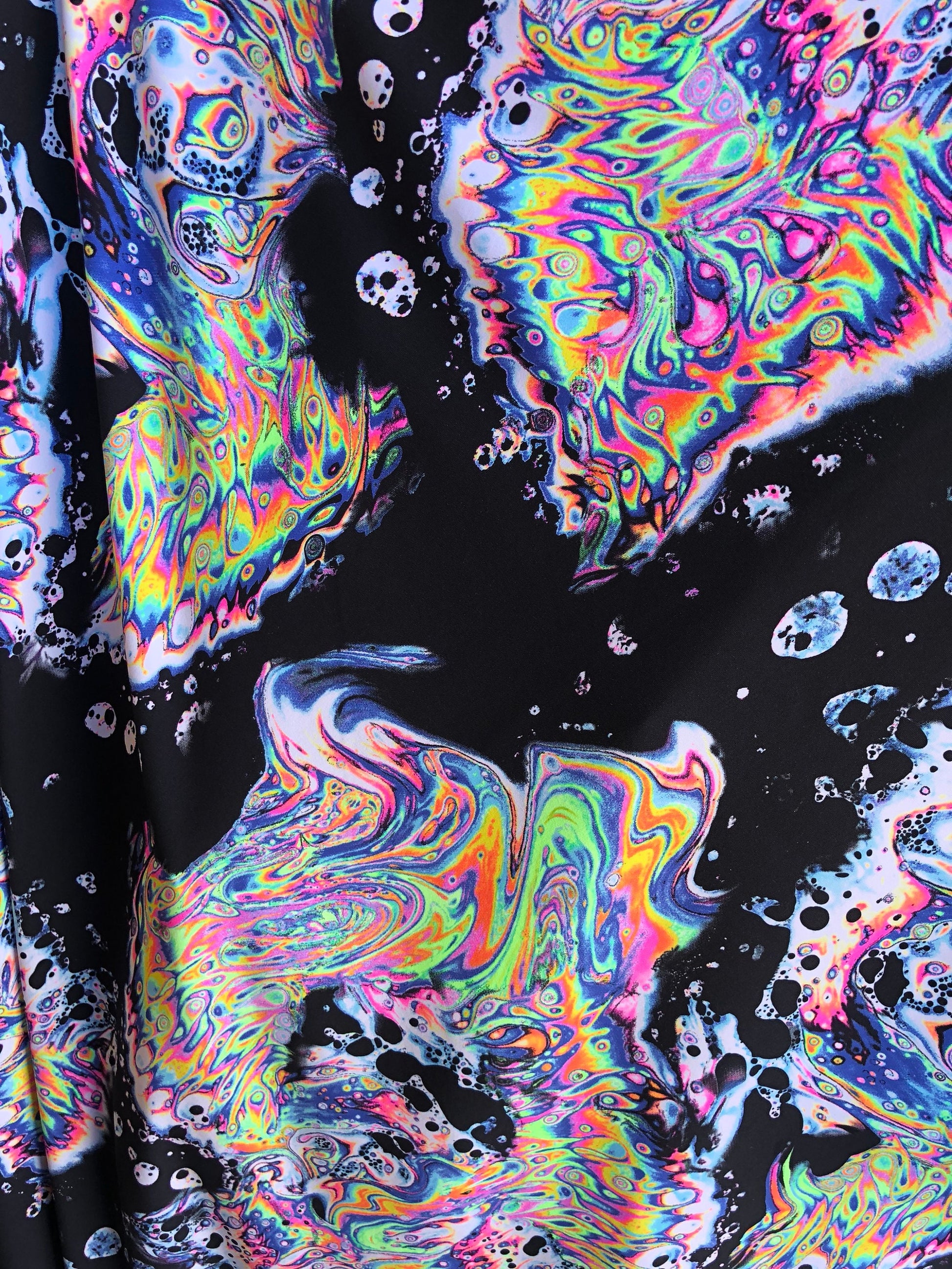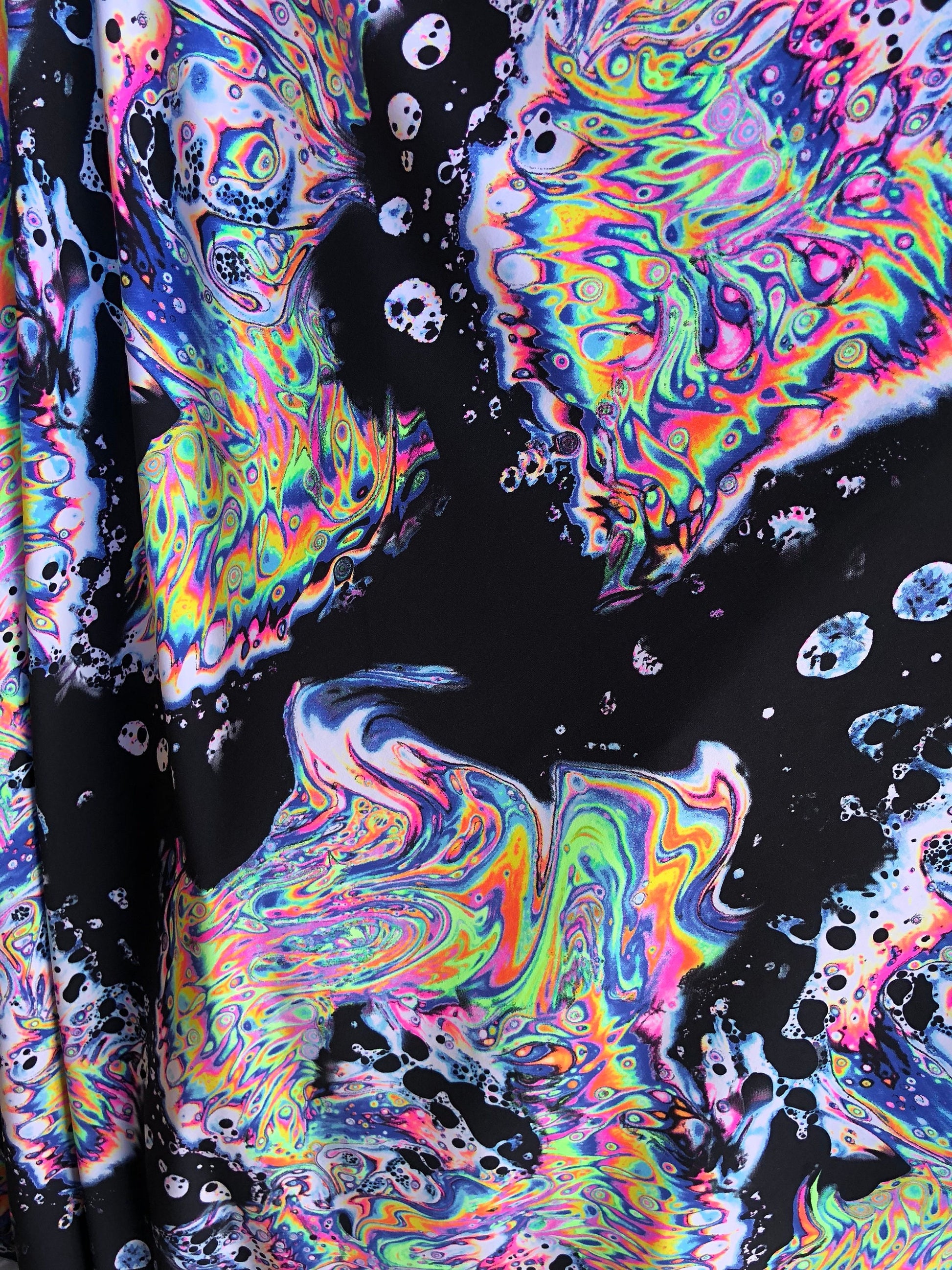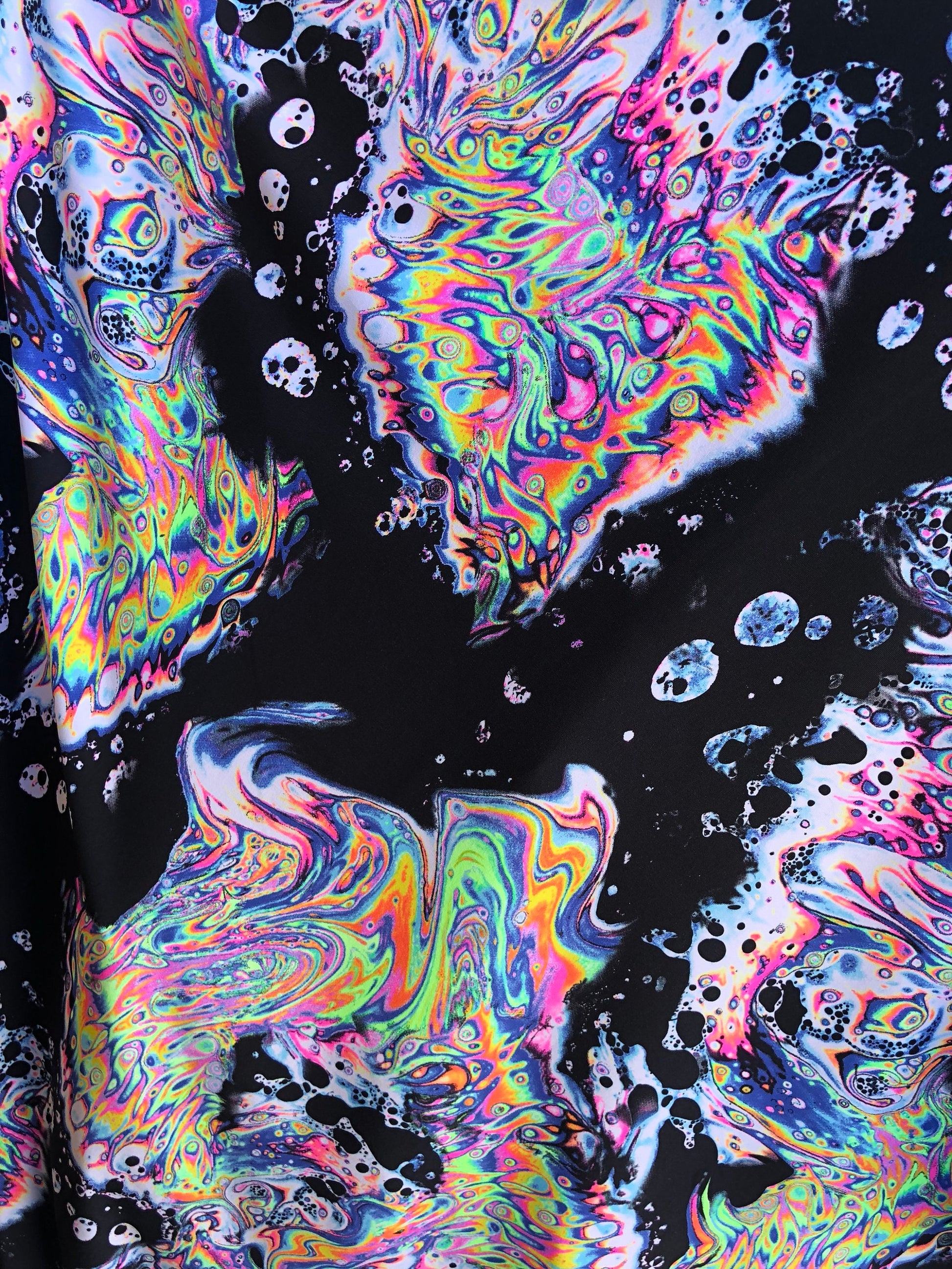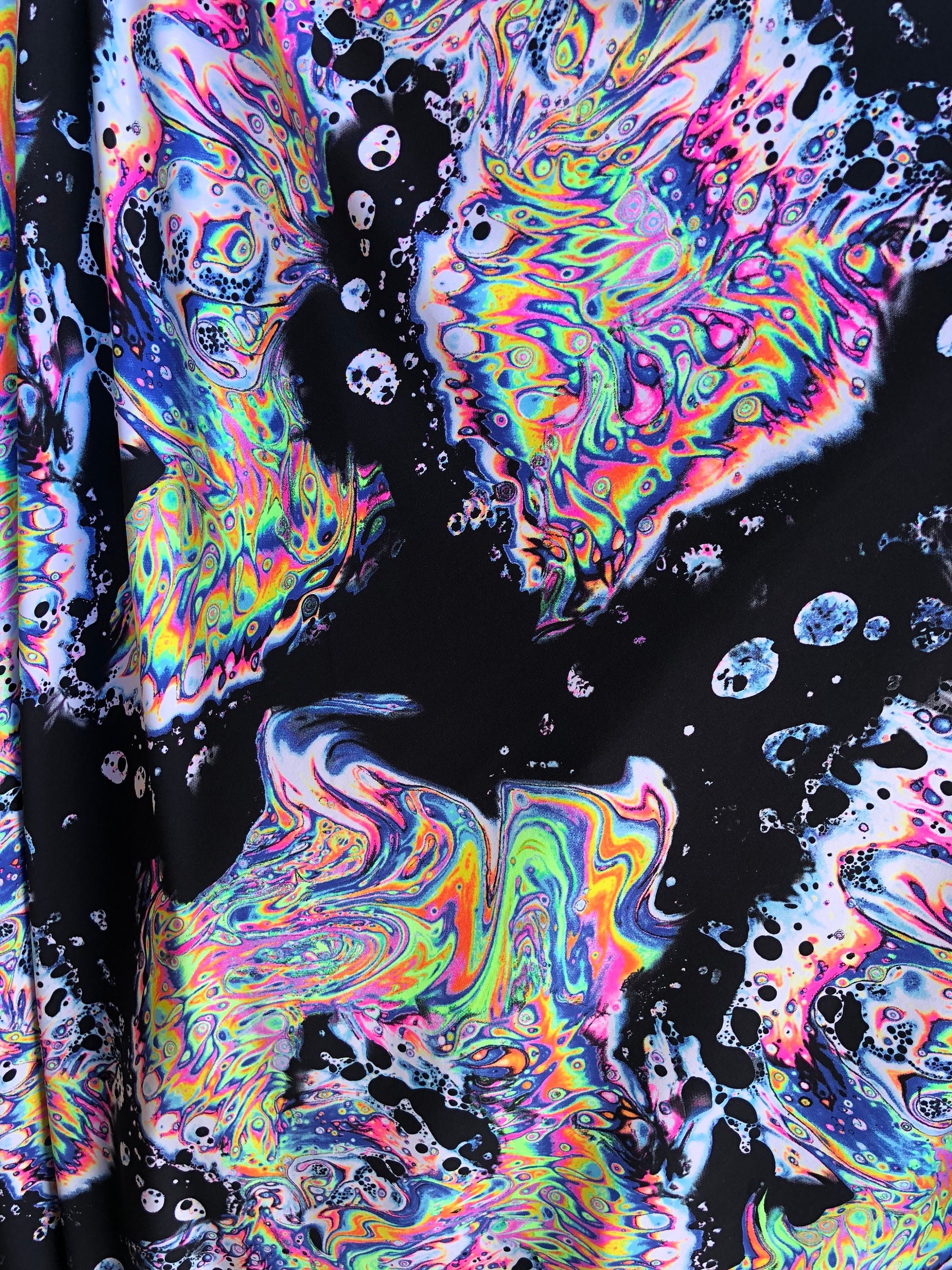New nylon spandex abstractive design black/multicolor UV Light It glows under black light 4way stretch 58/60" Sold by the YD. Ships Worldwide from Los Angeles California USA. High quality fabrics by AlexLAFabrics