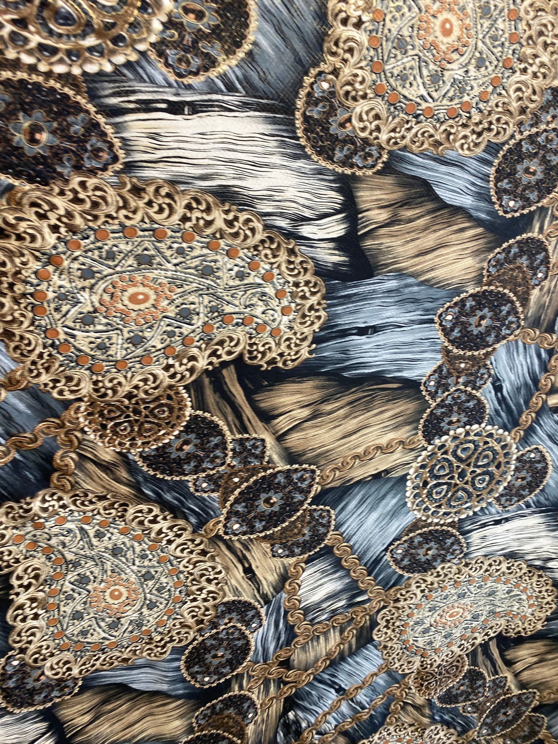 New paisley fashion design print on poly spandex 4-way stretch 58/60” Sold by the YD. Ships worldwide from Los Angeles California USA.