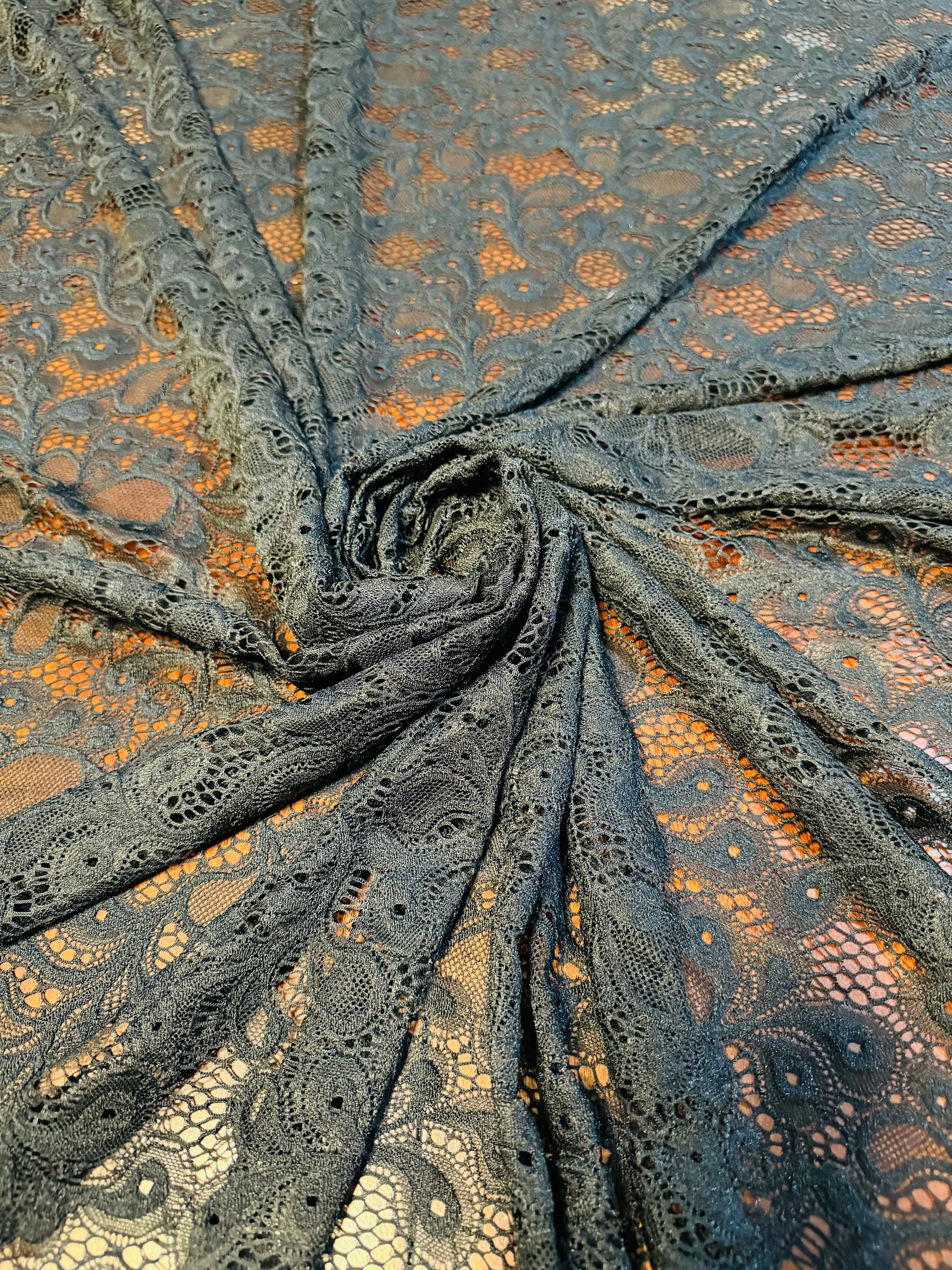 New paisley black stretch lace 4-way stretch nylon spandex 58/60” Sold by the YD. Ships worldwide from Los Angeles California USA. High quality fabrics by AlexLAFabrics