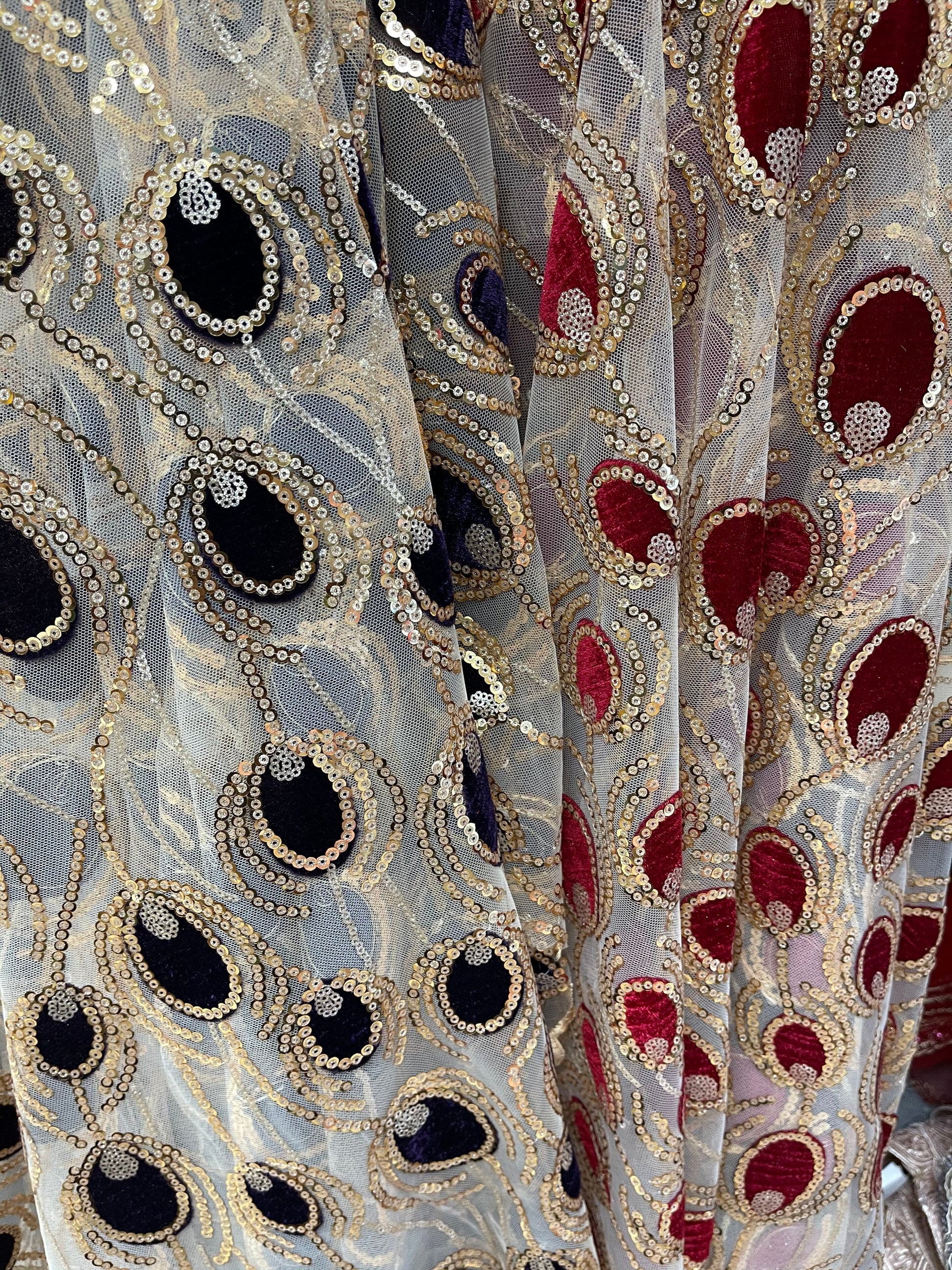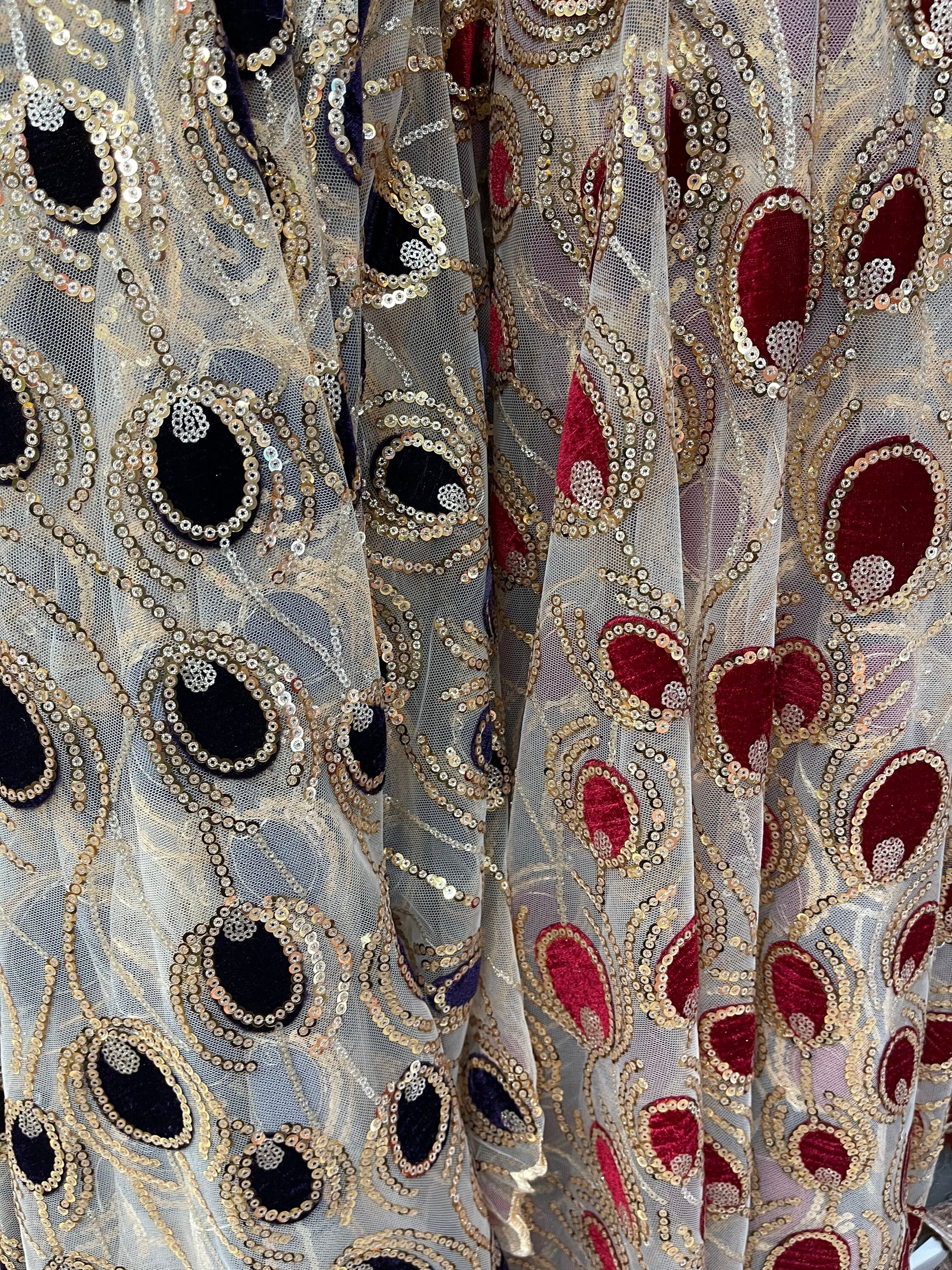 New Peacock design embroidered on stretch mesh 2-way 55/57 Sold by the YD. Ships Worldwide from Los Angeles California USA.