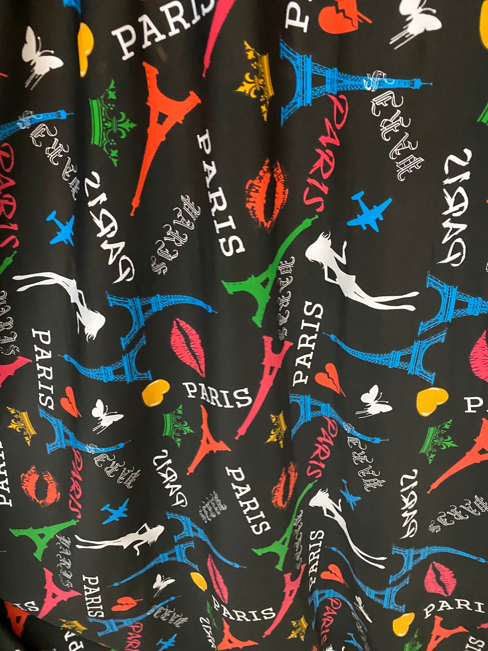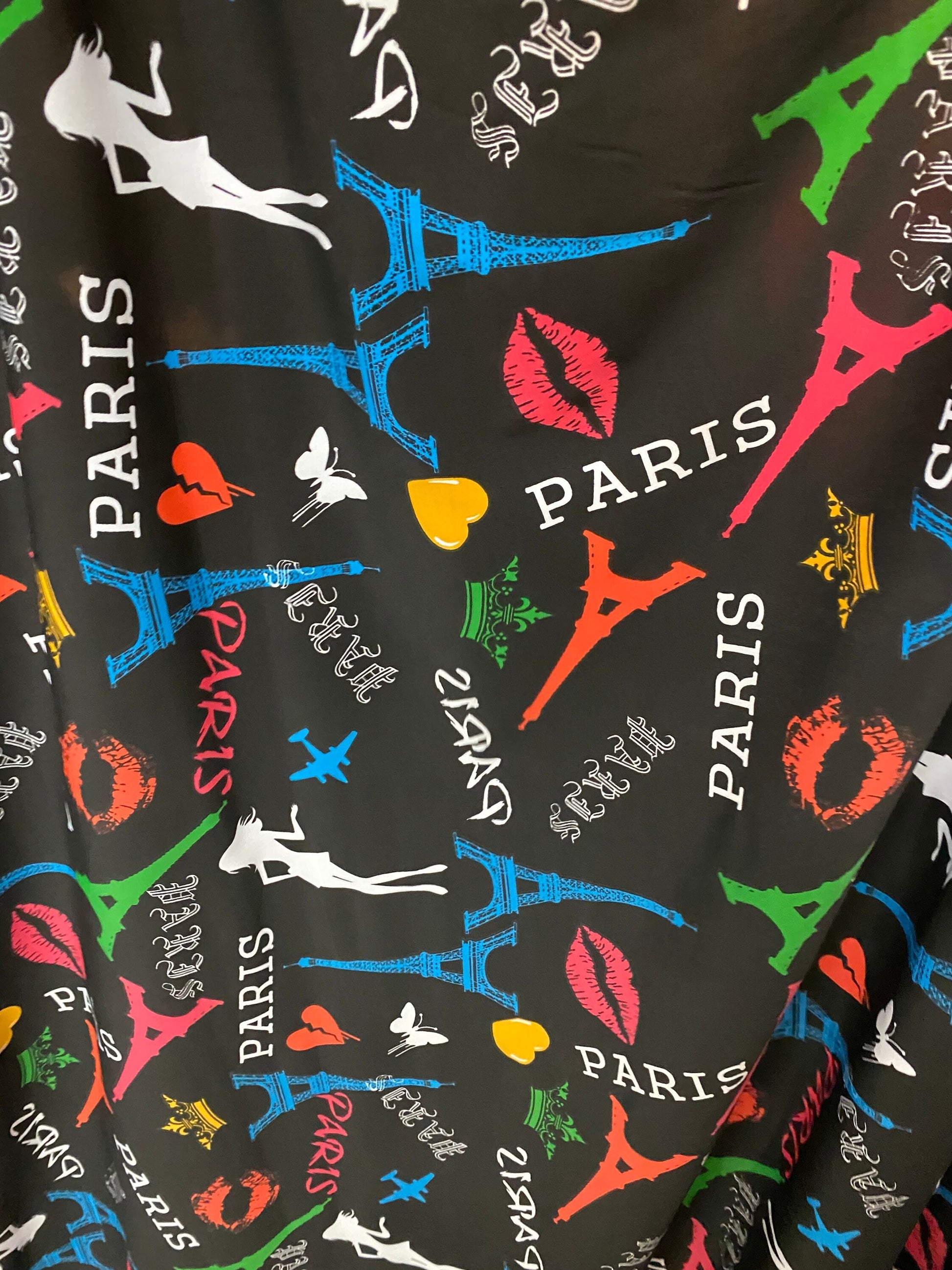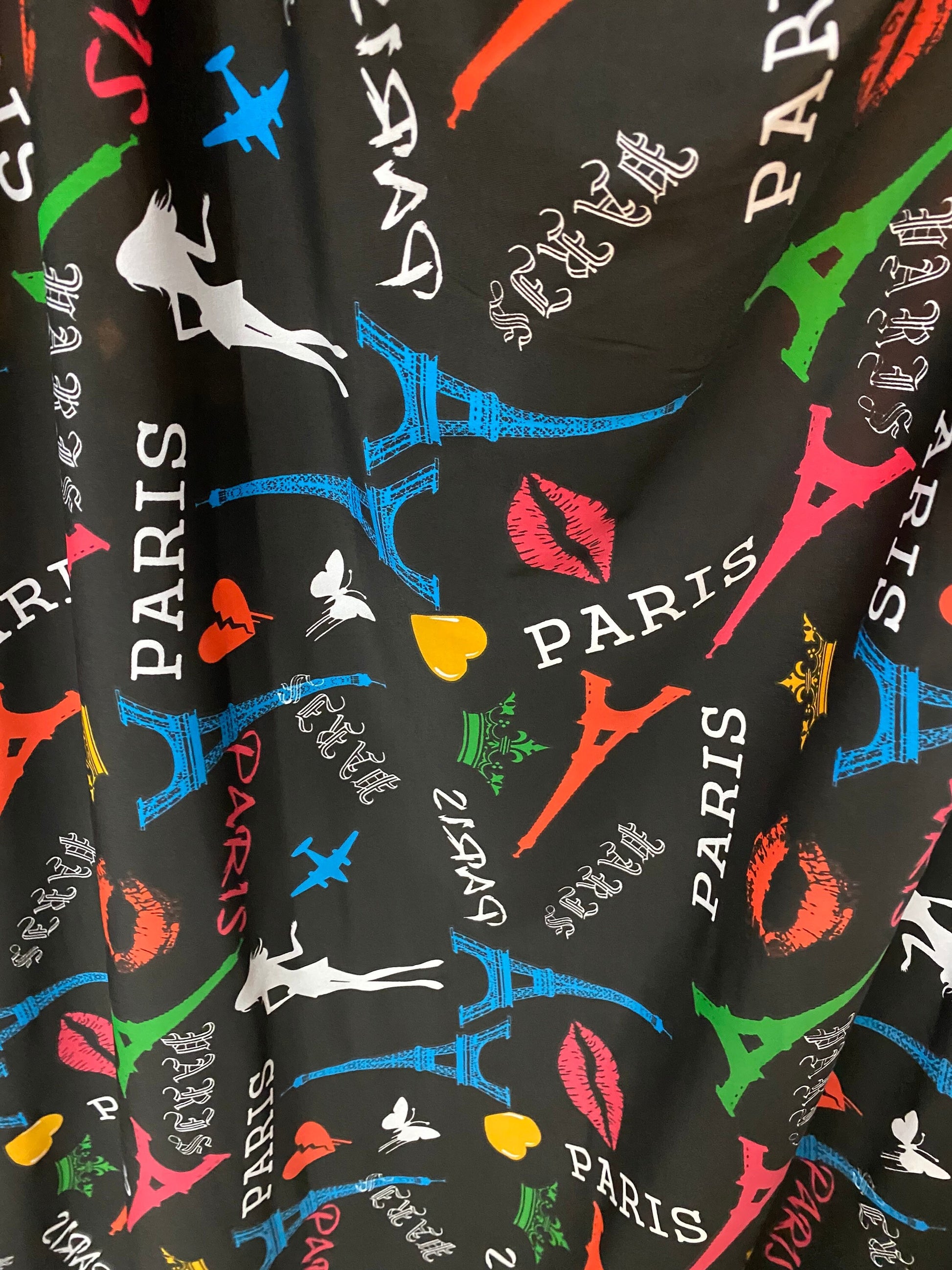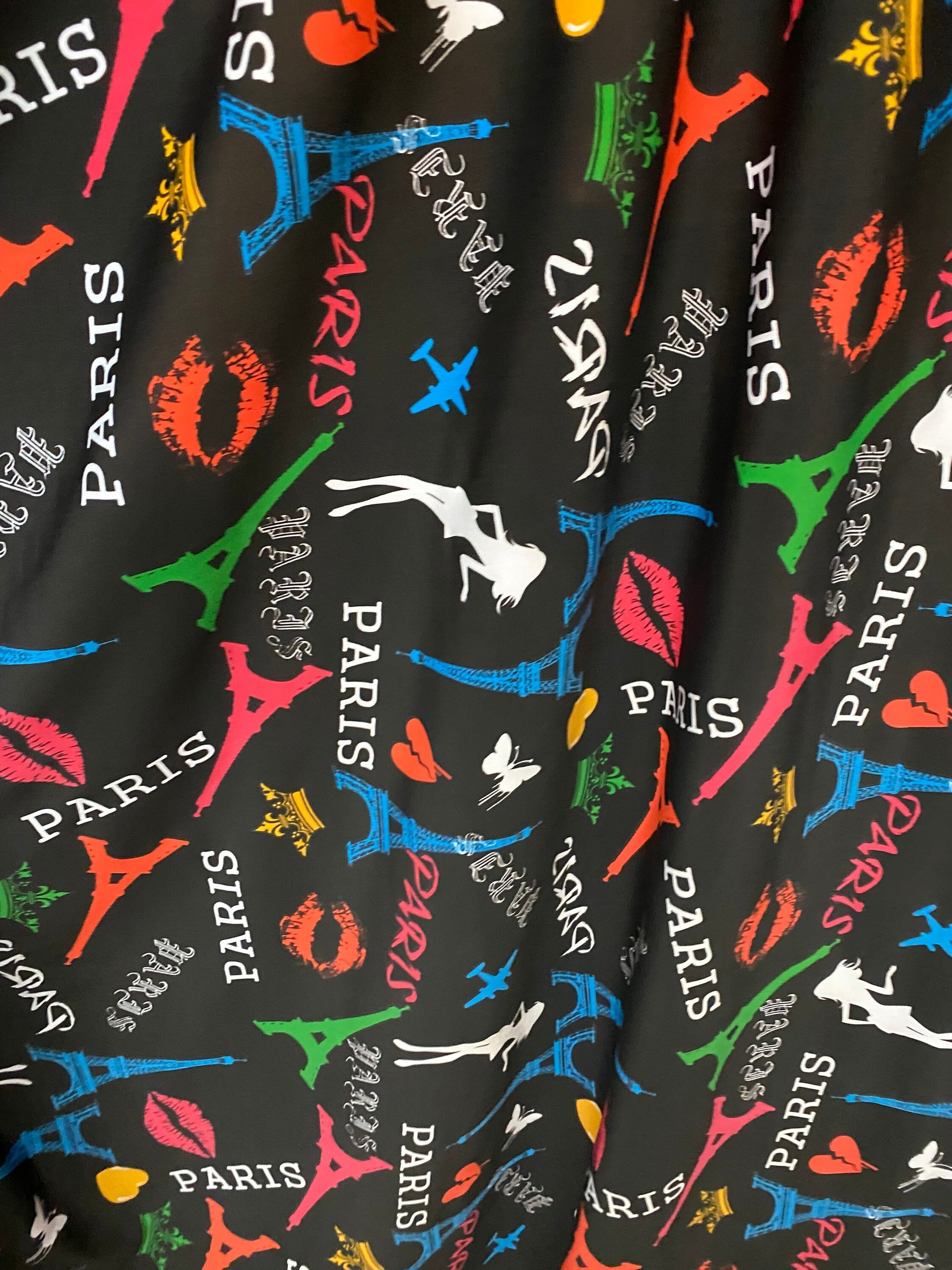 New Poly print spandex Paris design Black/Multicolor 2-way stretch 58/60” Sold by the YD. Ships worldwide from Los Angeles California USA.
