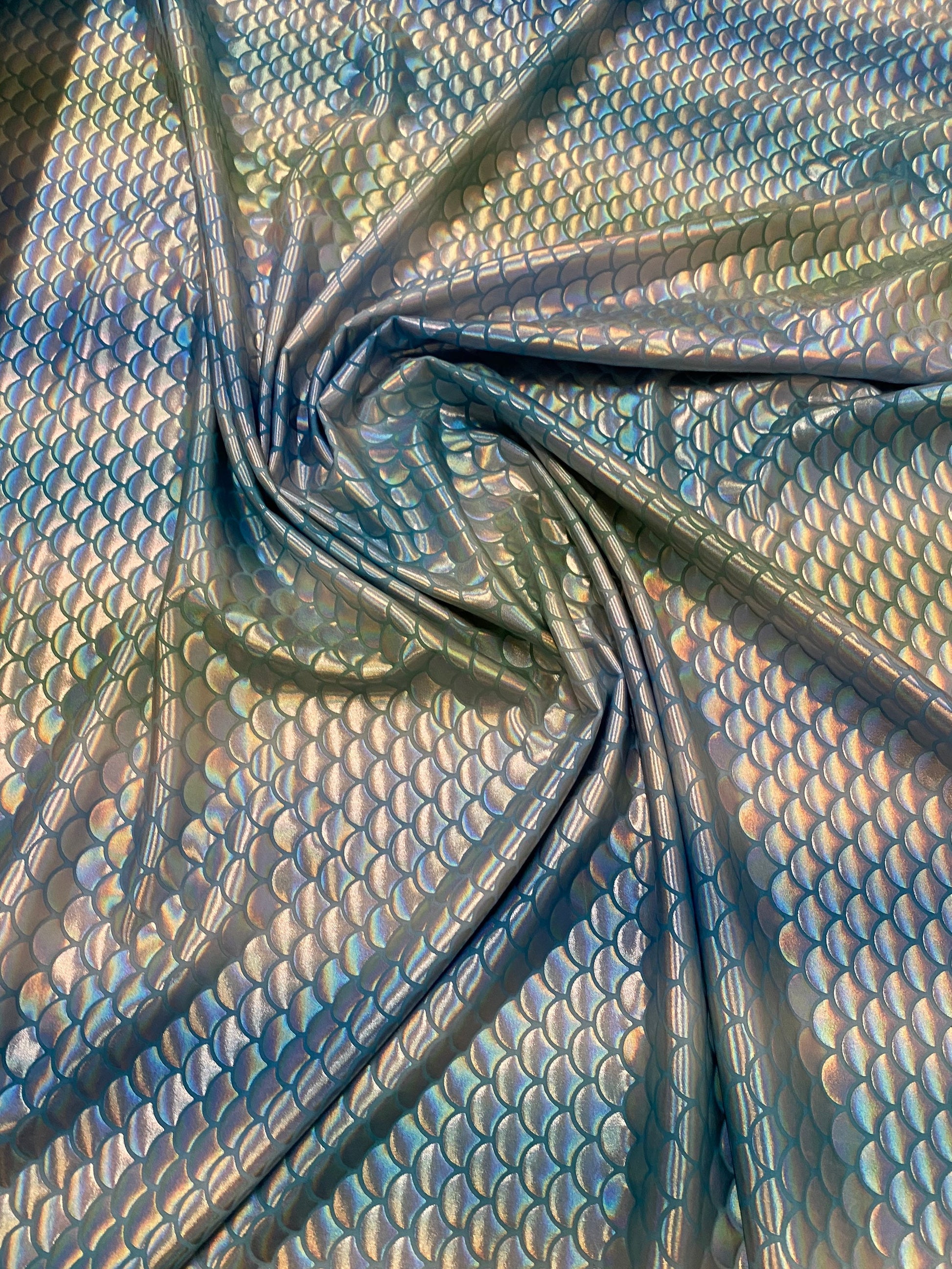 New Rainbow mermaid design blue/silver iridescent metallic nylon spandex 4-way stretch 58/60” Sold by the YD. Ships worldwide from Los Angeles California USA.