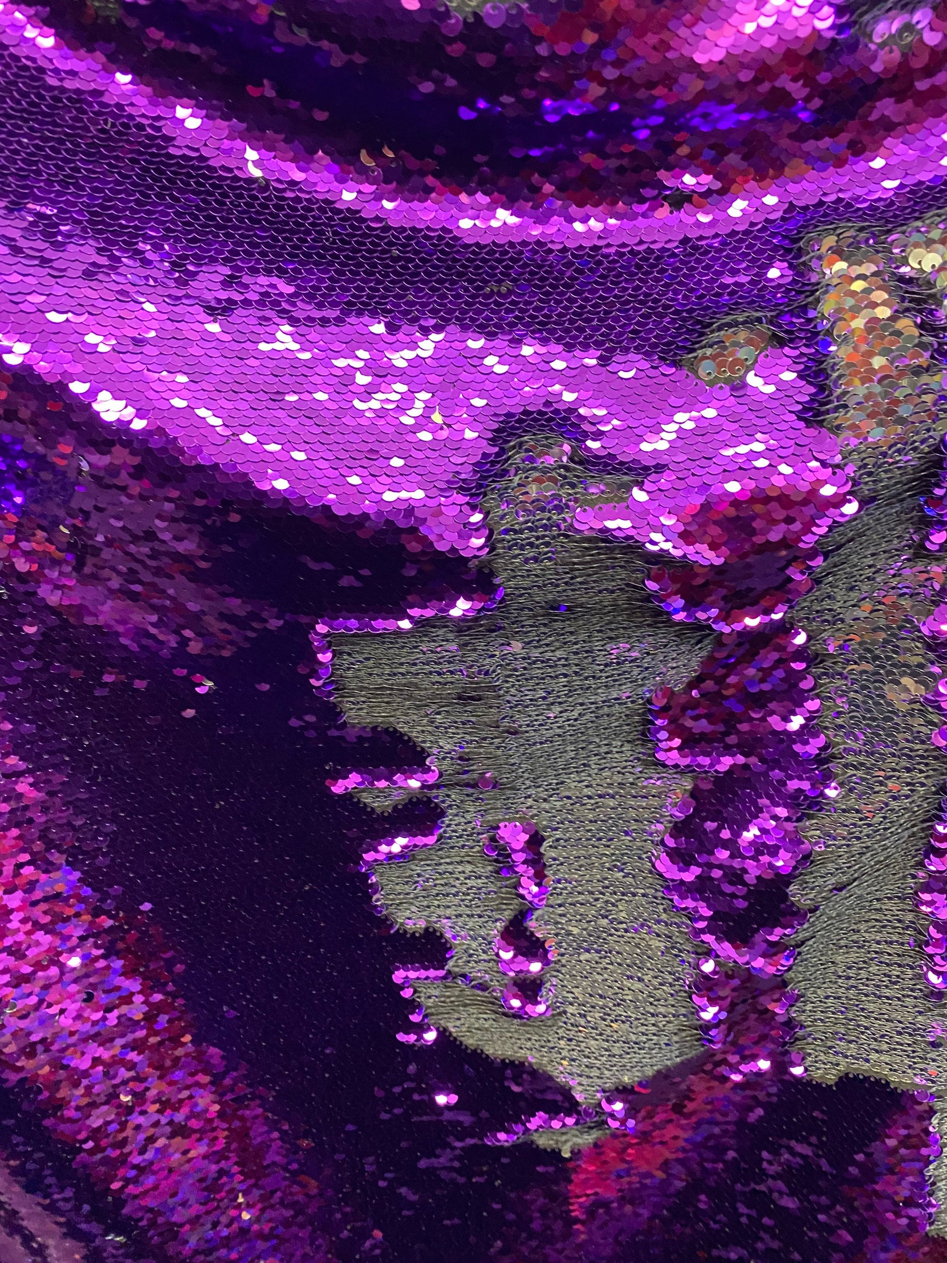 New Reversible flip up sequins purple/silver 5mm seq with Lycra base 58/60” sold by the yd. Ships worldwide from Los Angeles California USA.