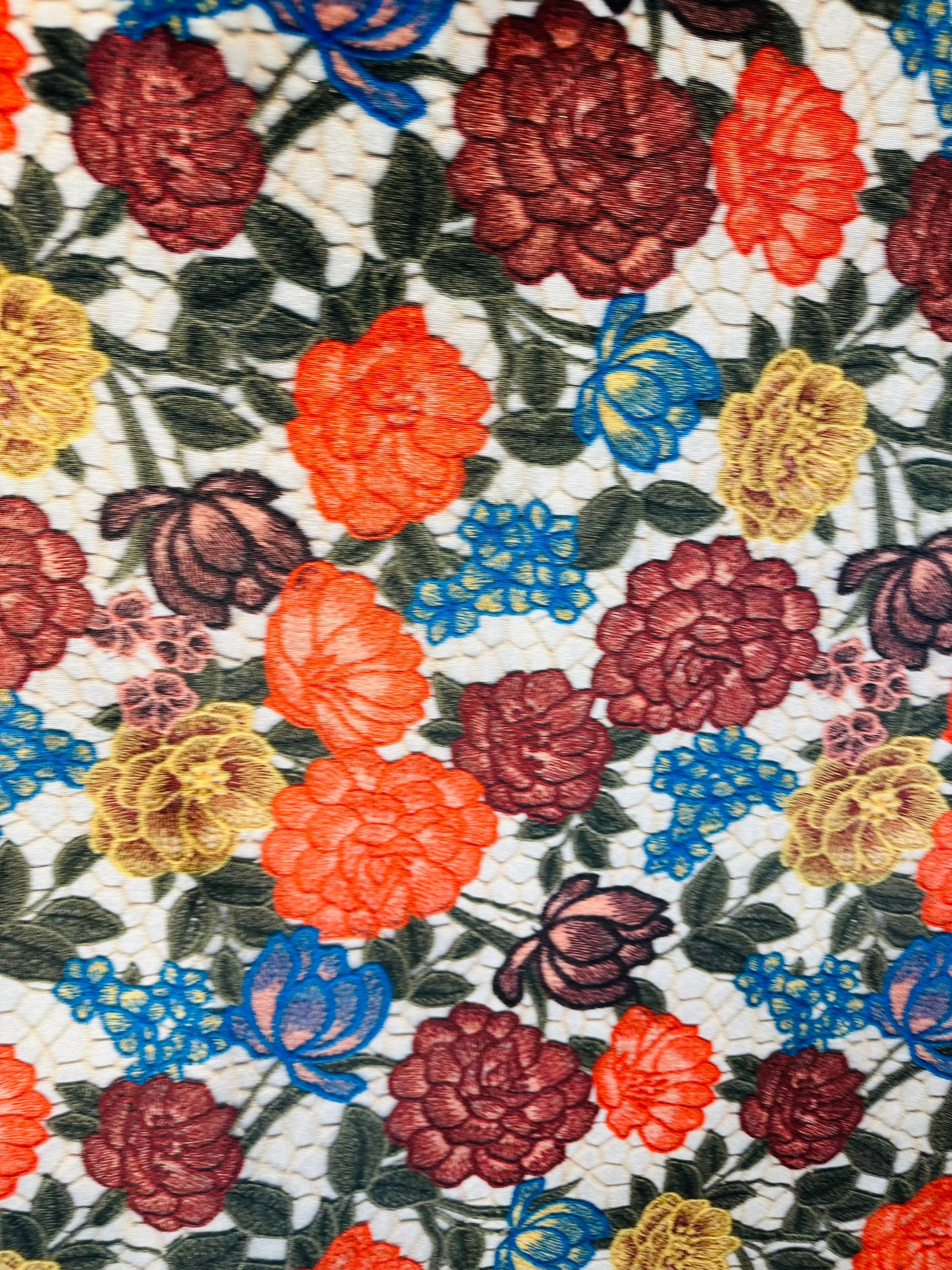 New Romantic embroidered flowers design print on great quality of stretch velvet 4-way stretch 58/60” Sold by the YD. Ships worldwide from Los Angeles California USA