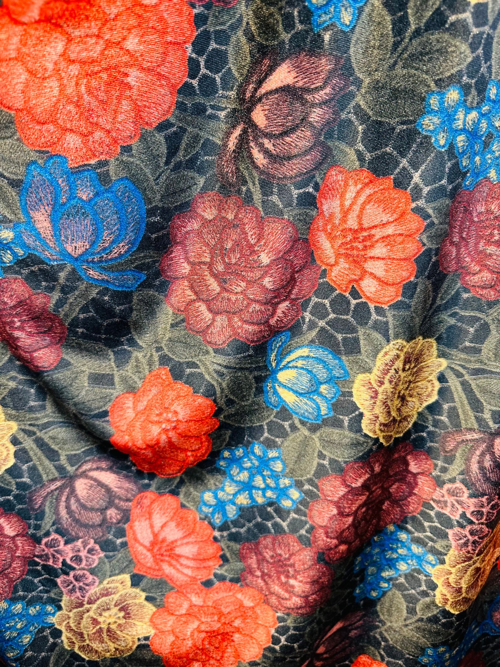 New Romantic embroidered flowers design print on great quality of stretch velvet 4-way stretch 58/60” Sold by the YD. Ships worldwide