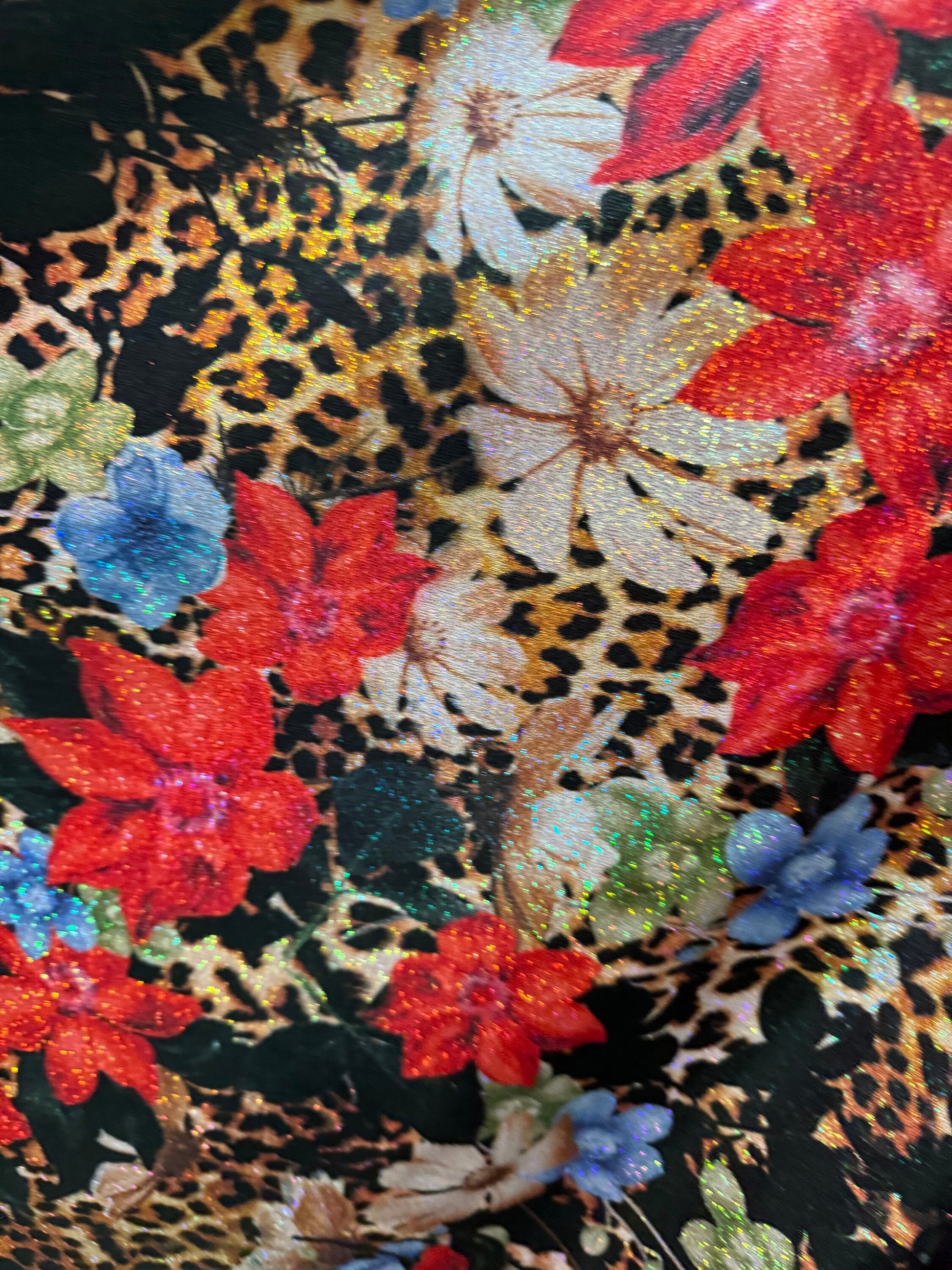 New Romantic flower design with exotic leopard design on hologram foggy foil metallic nylon spandex 4-way stretch 58/60” Sold by the YD. Ships worldwide from Los Angeles California USA. High quality fabrics by AlexLAFabrics