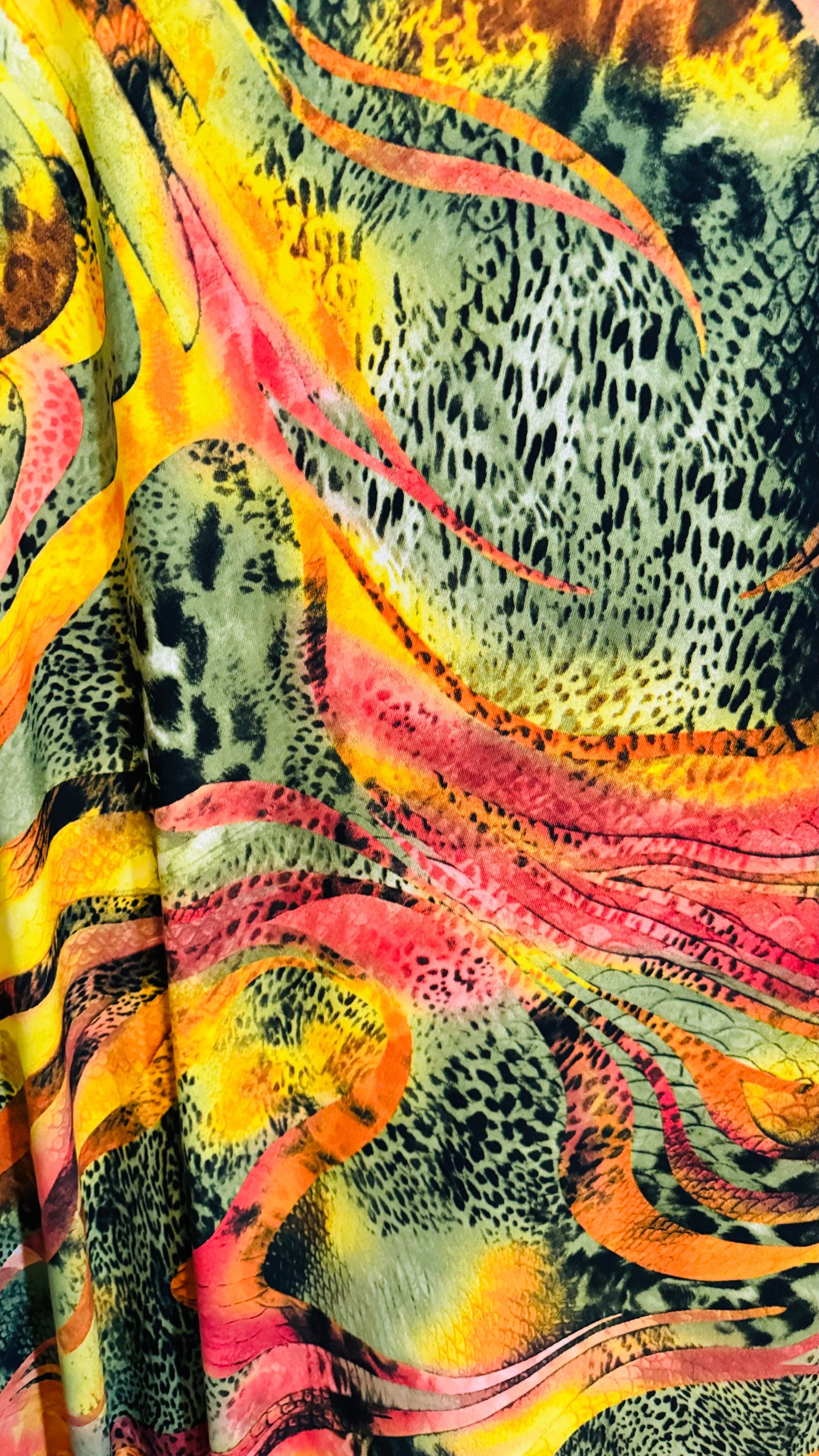 New Safari design exotic animal print multicolor print on great quality of poly spandex 4-way stretch 58/60” Sold by the YD. Ships worldwide from Los Angeles California USA. High quality fabrics by AlexLAFabrics