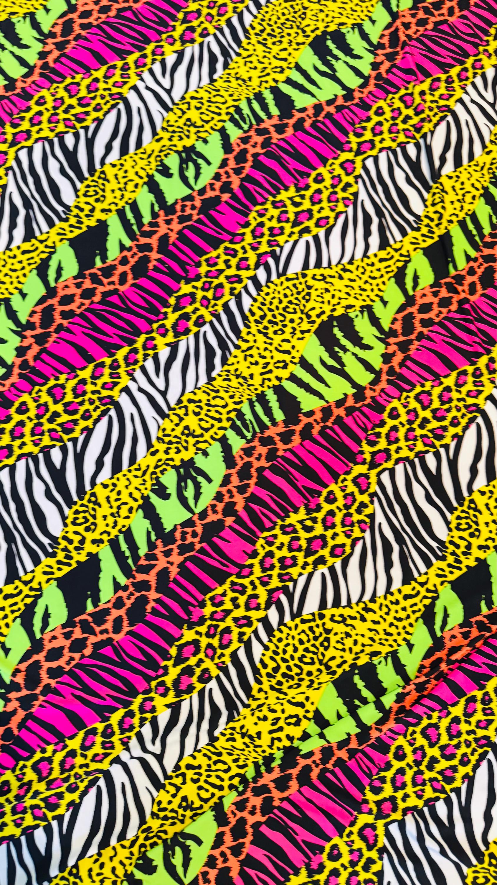 New safari design multi patch work multicolor print on poly spandex 4way stretch 58/60" Sold by the YD. Ships worldwide from Los Ángeles CA