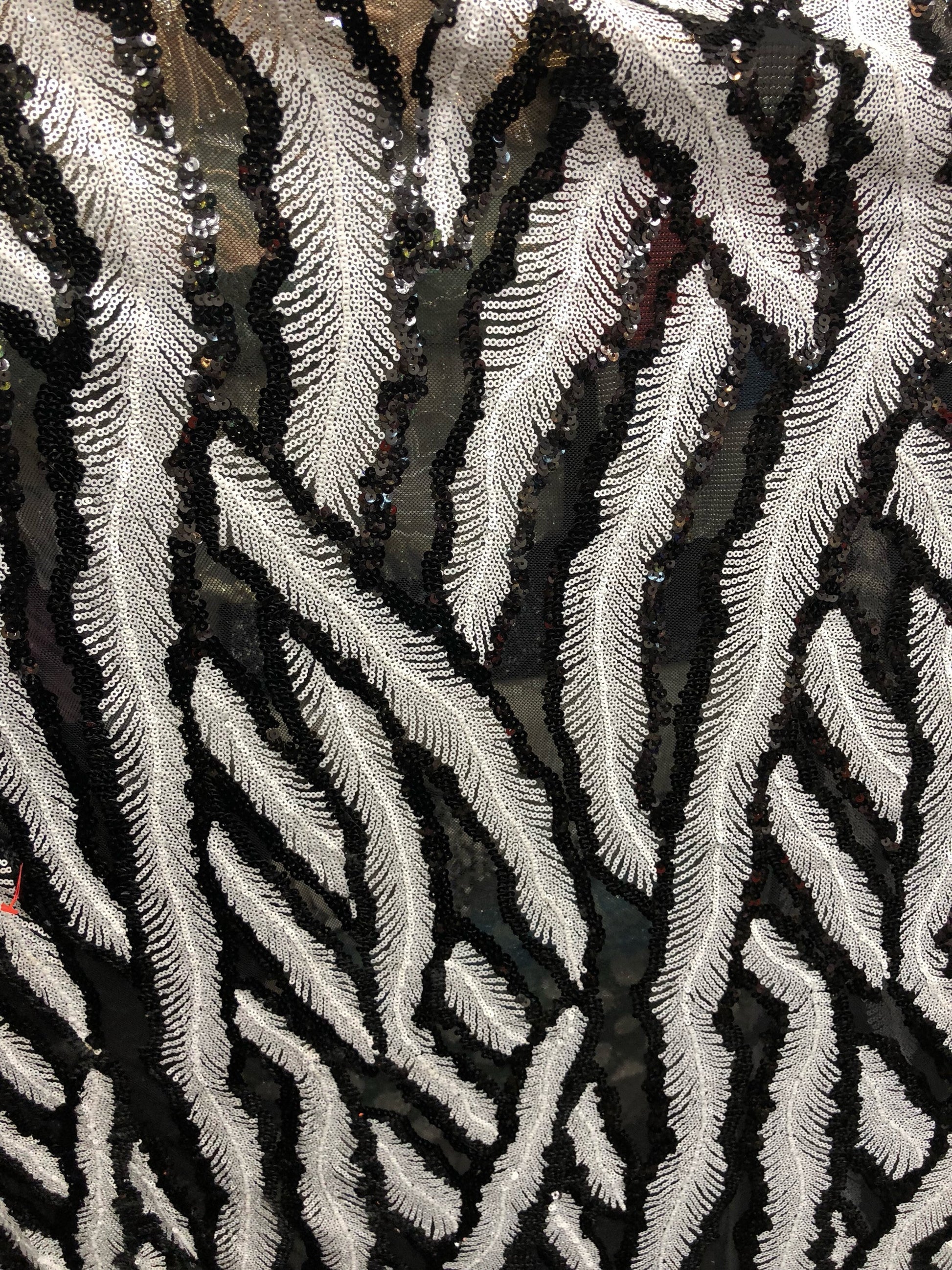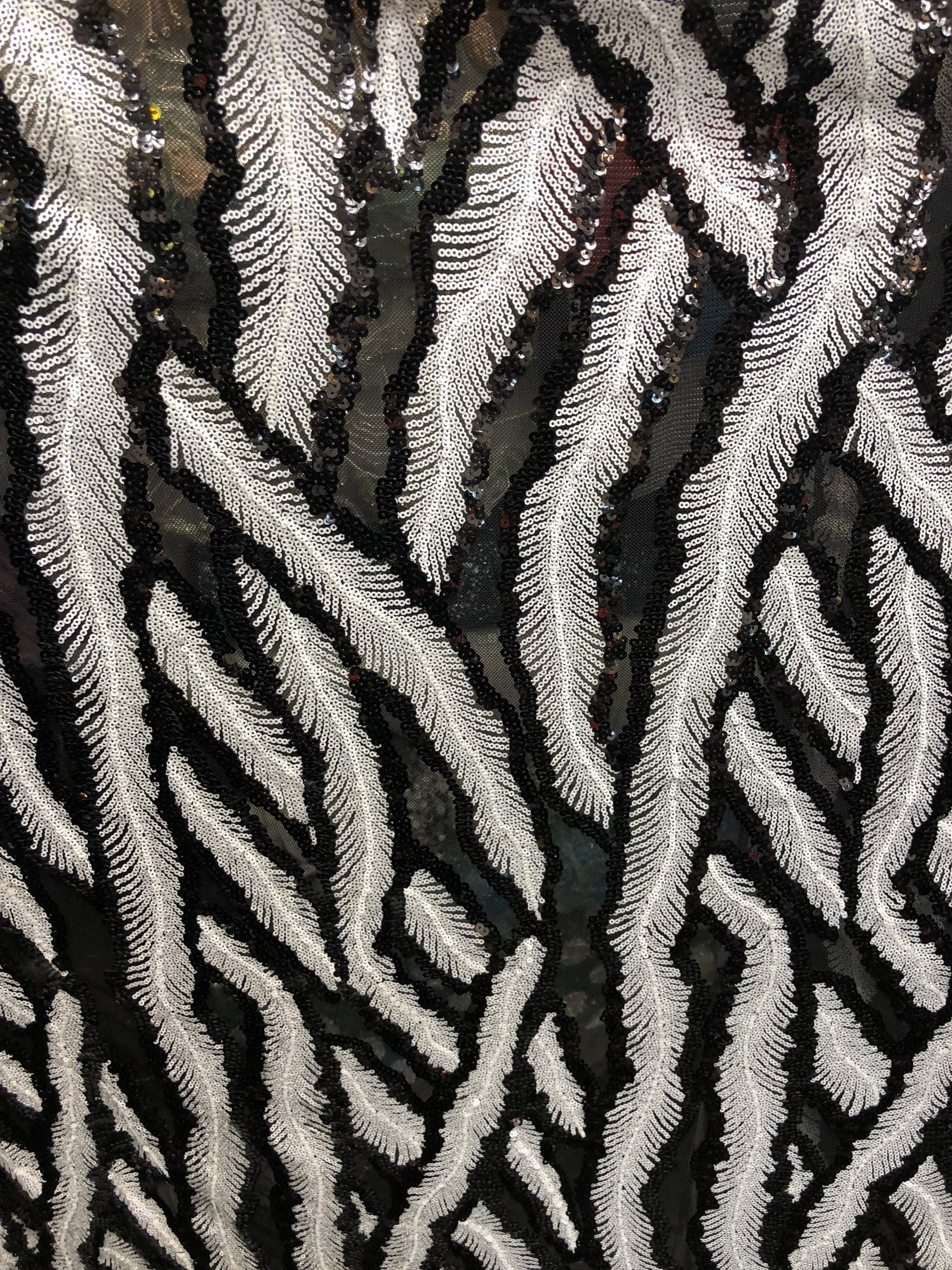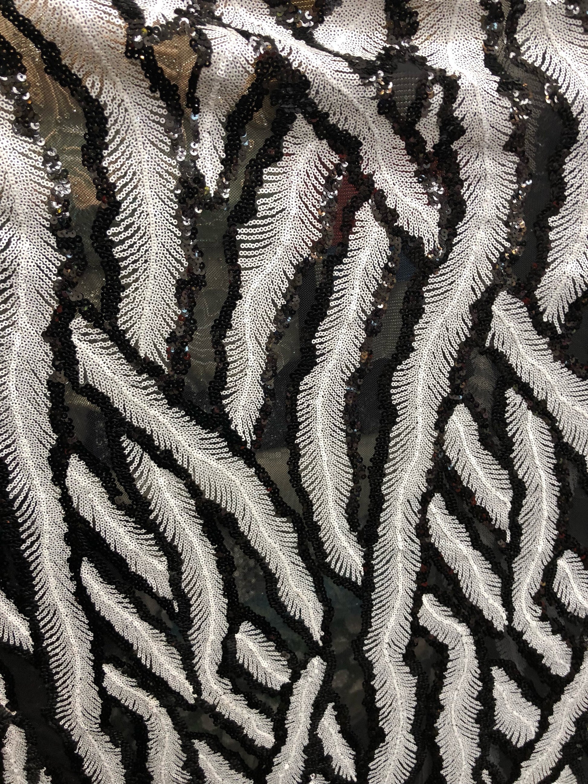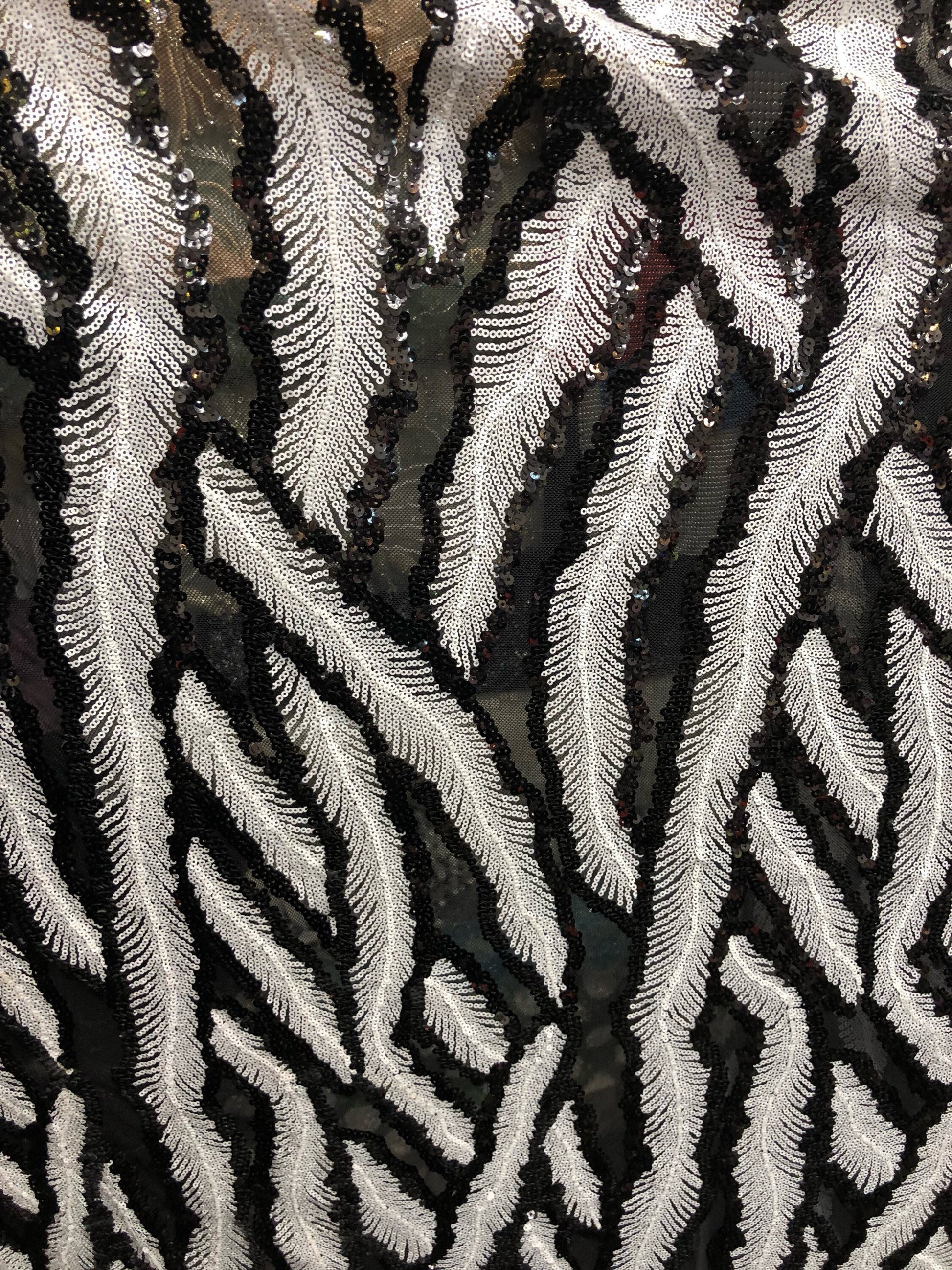 New sequins leaf design black/white 2way Stretch 58/60" Sold by the YD. Ships worldwide from Los Angeles California USA