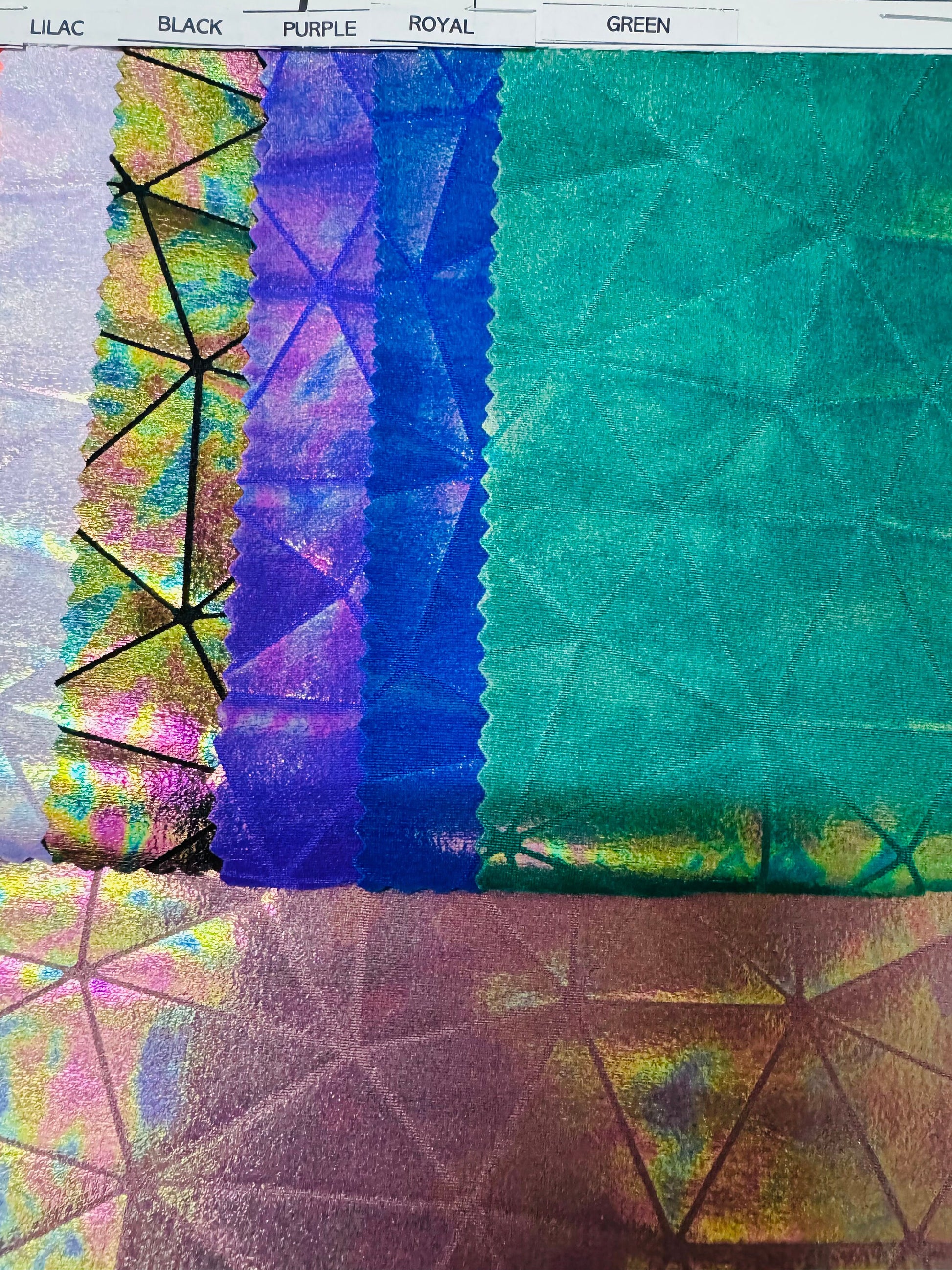 New shattered glass design with bohemian ilusión foil nylon spandex 4-way stretch 58/60” Sold by the YD. Ships worldwide from Los Angeles California USA. High quality fabrics by AlexLAFabrics
