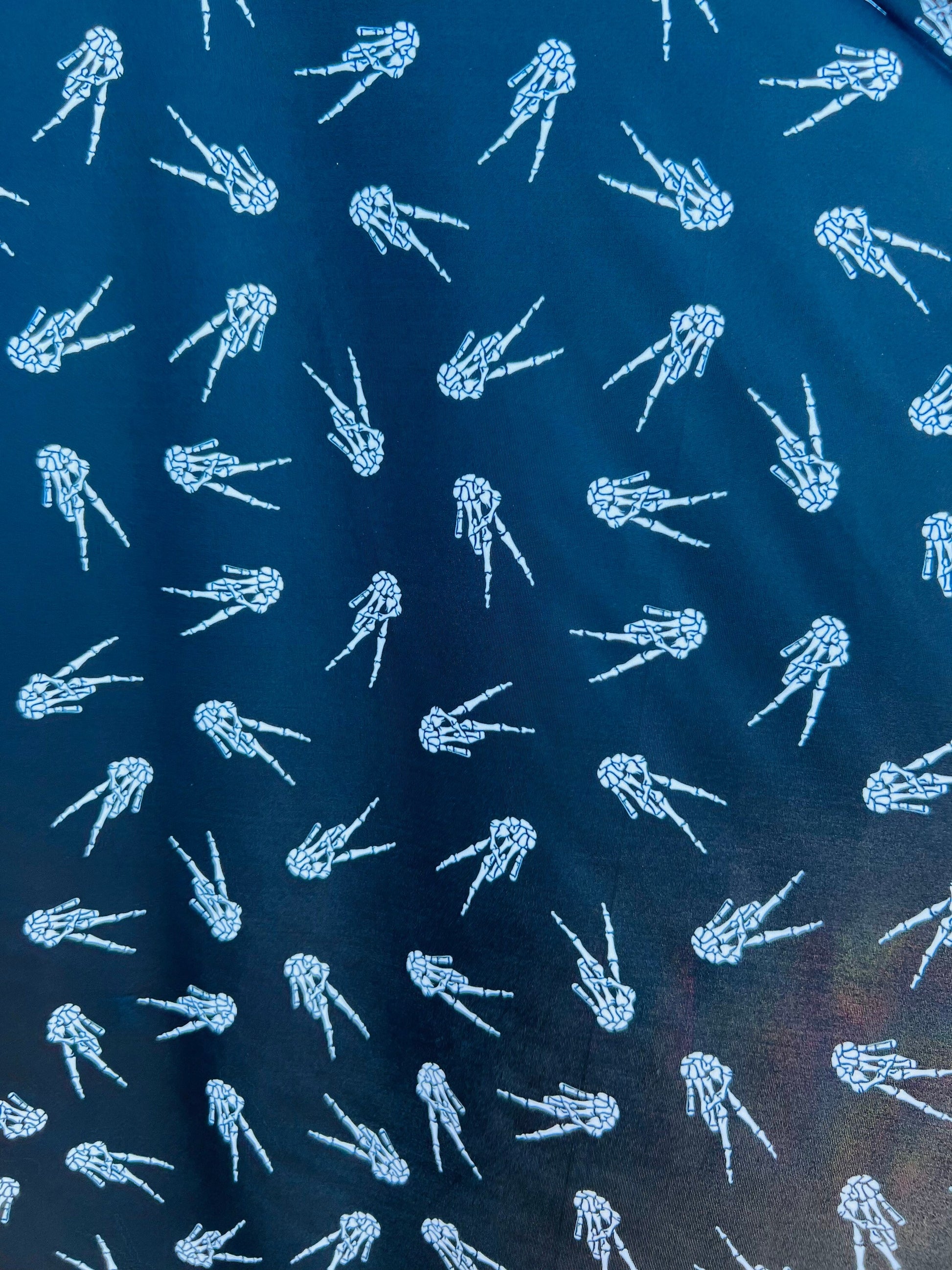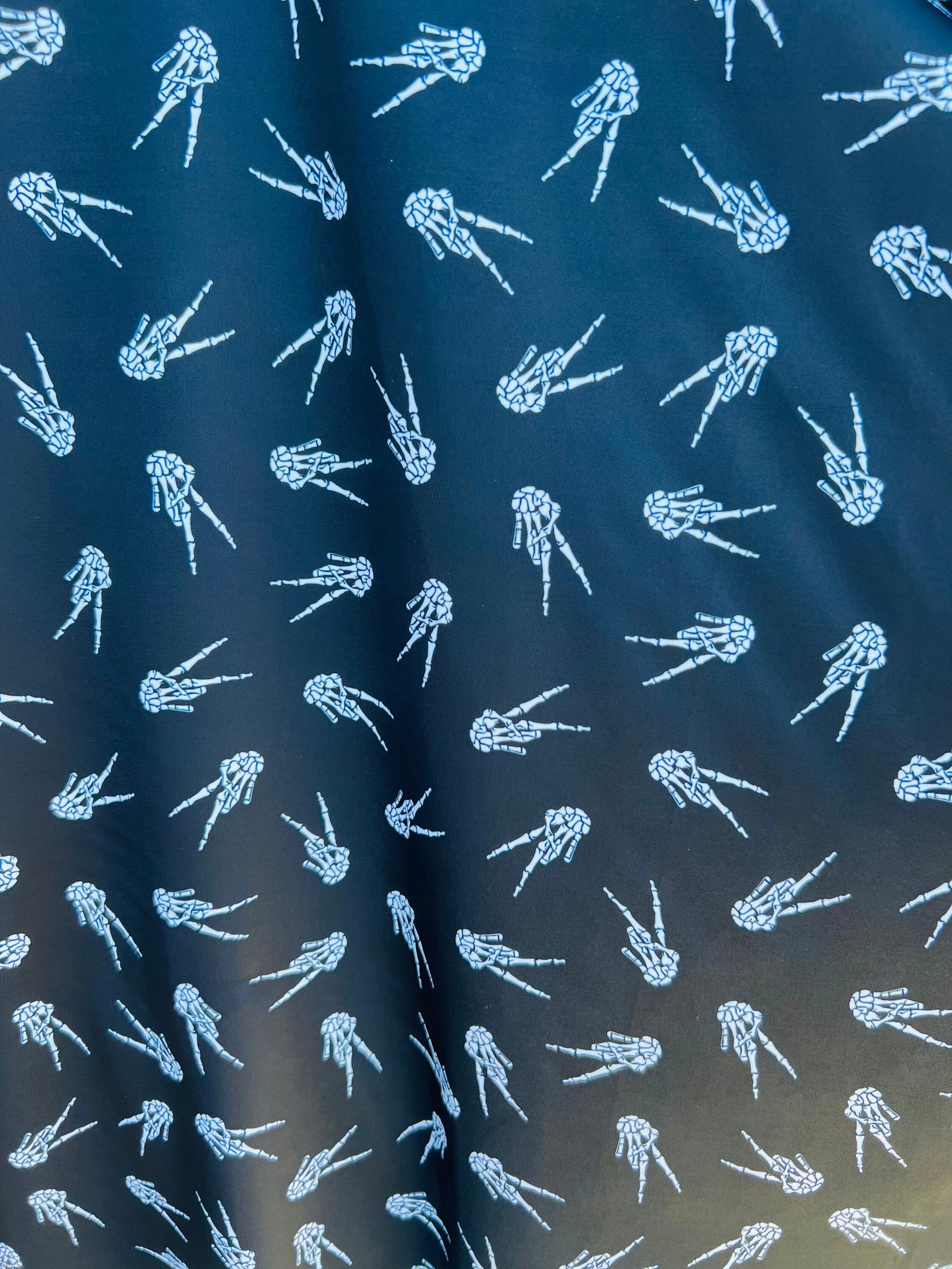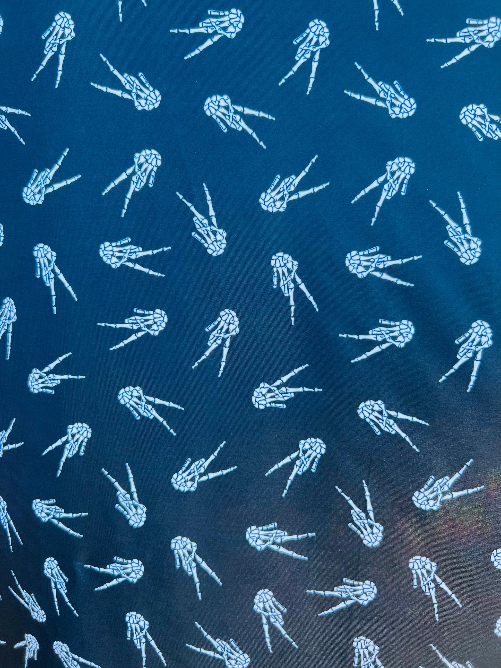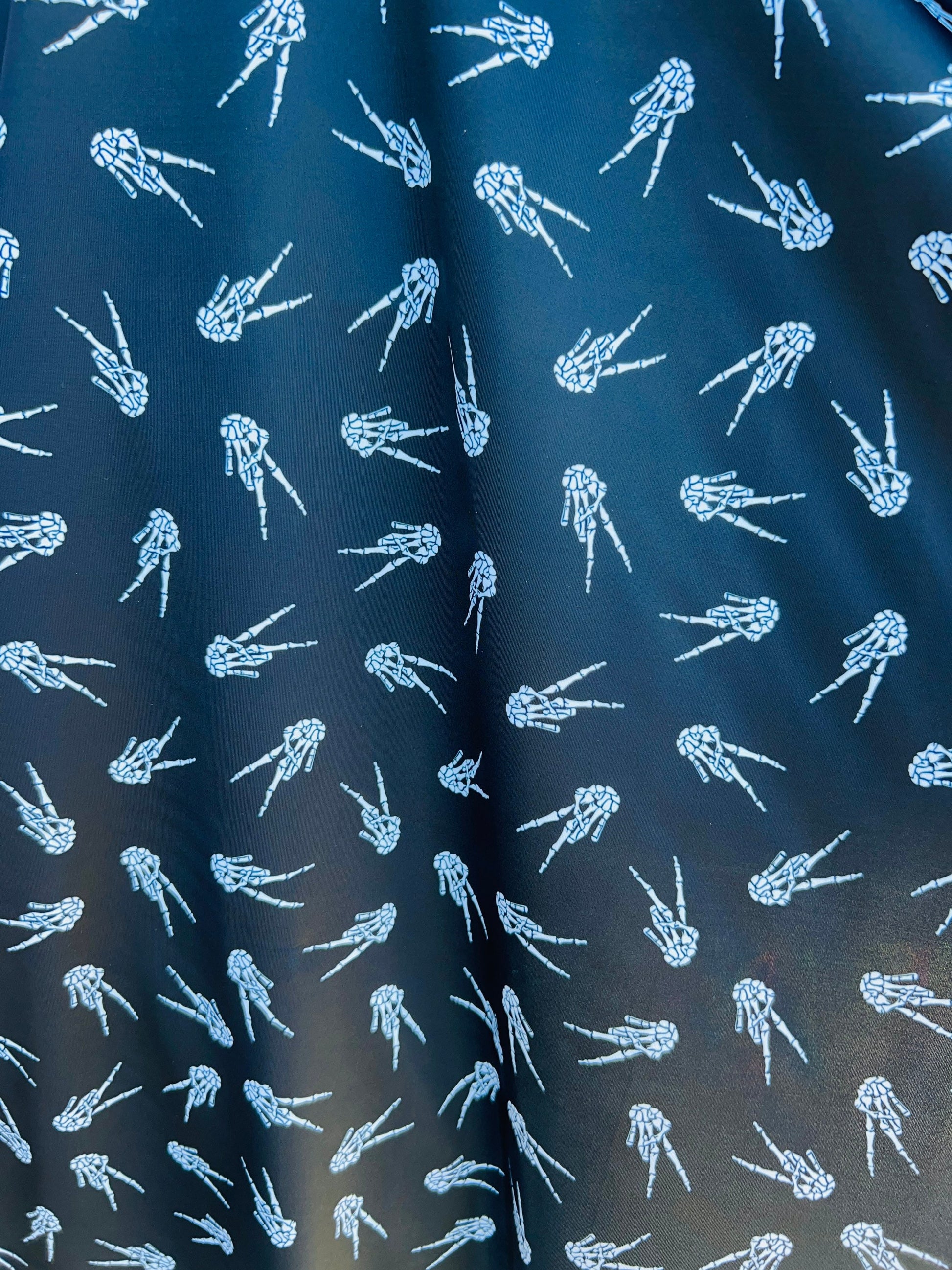 New Skeleton Hand design print on best quality of Nylon Spandex 4-way stretch 58/60” Sold by the YD. Ships Worldwide from Los Angeles CA.