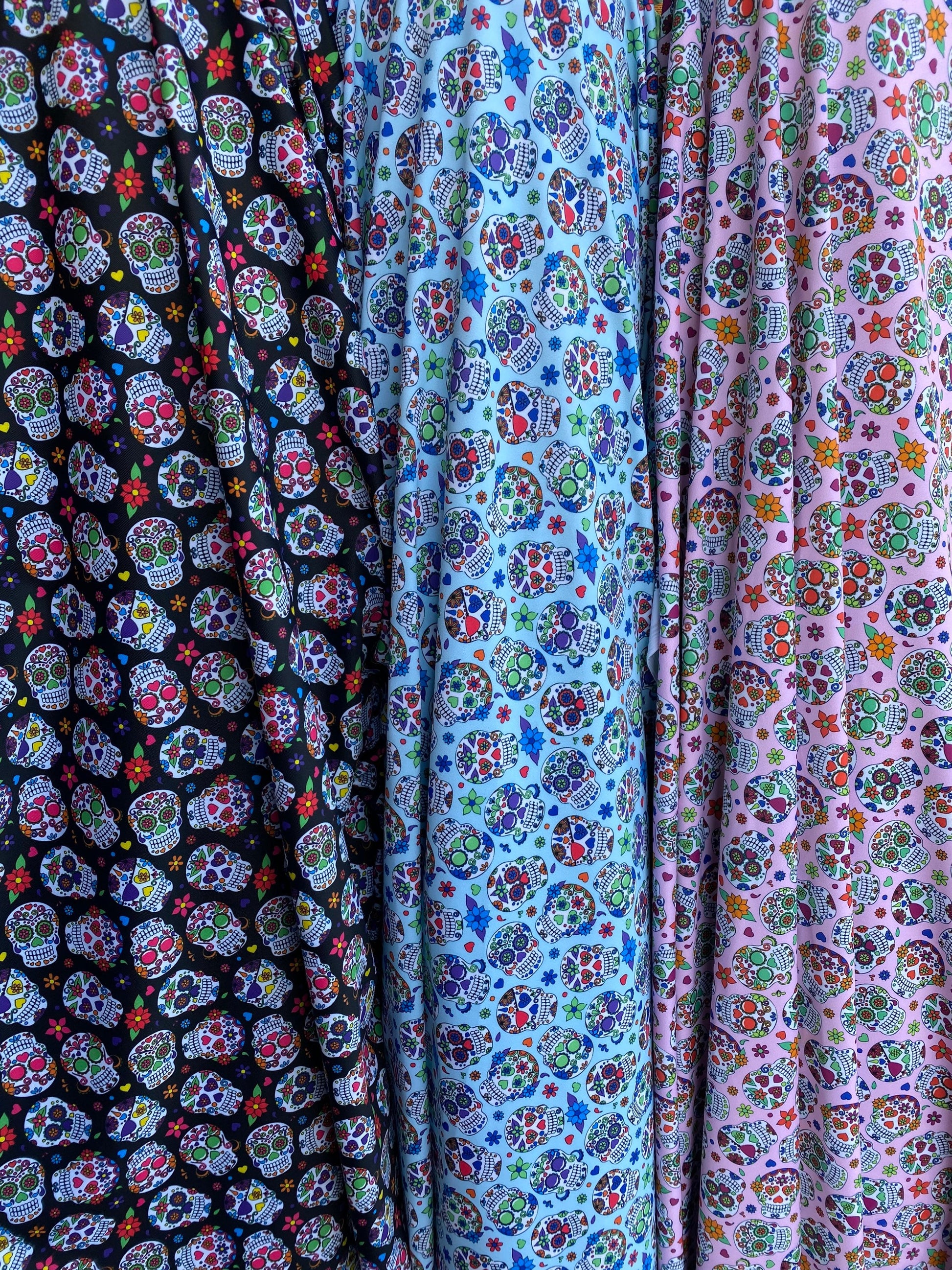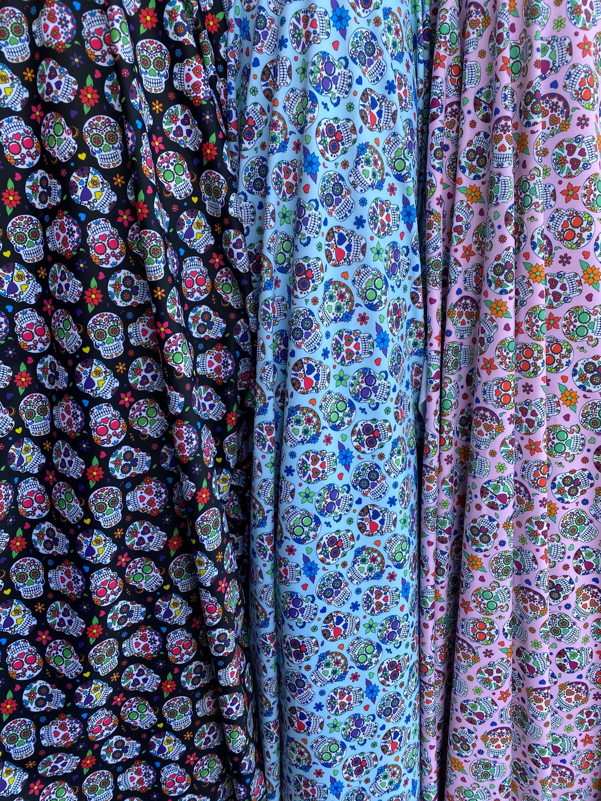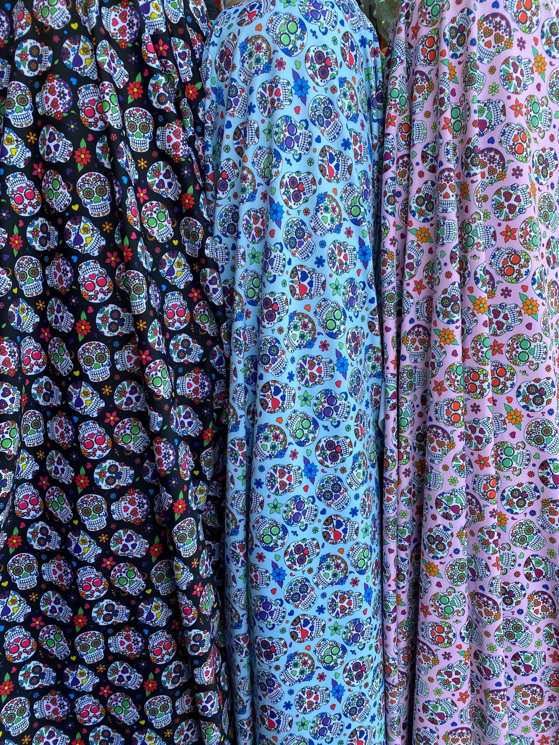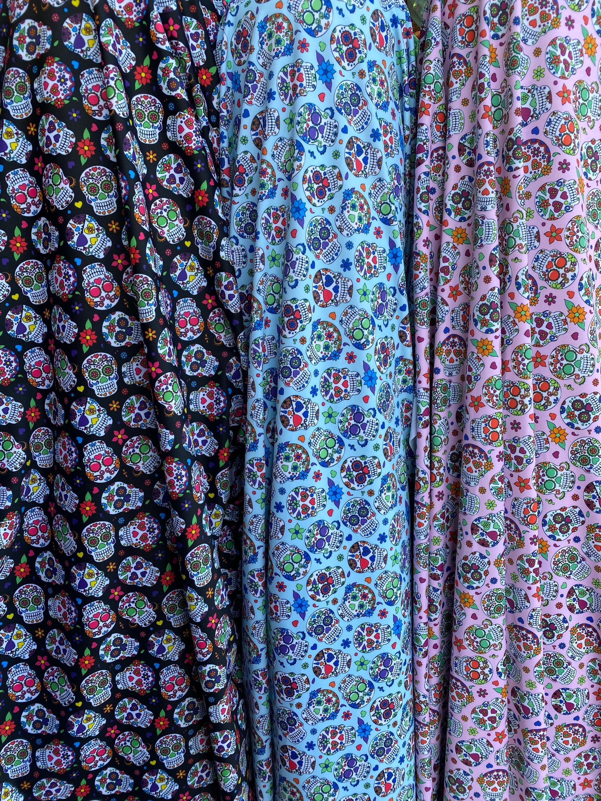 New skull design Multicolor print on best quality of nylon spandex 4-way stretch 58/60” Sold by the YD. Ships Worldwide from Los Angeles California USA.