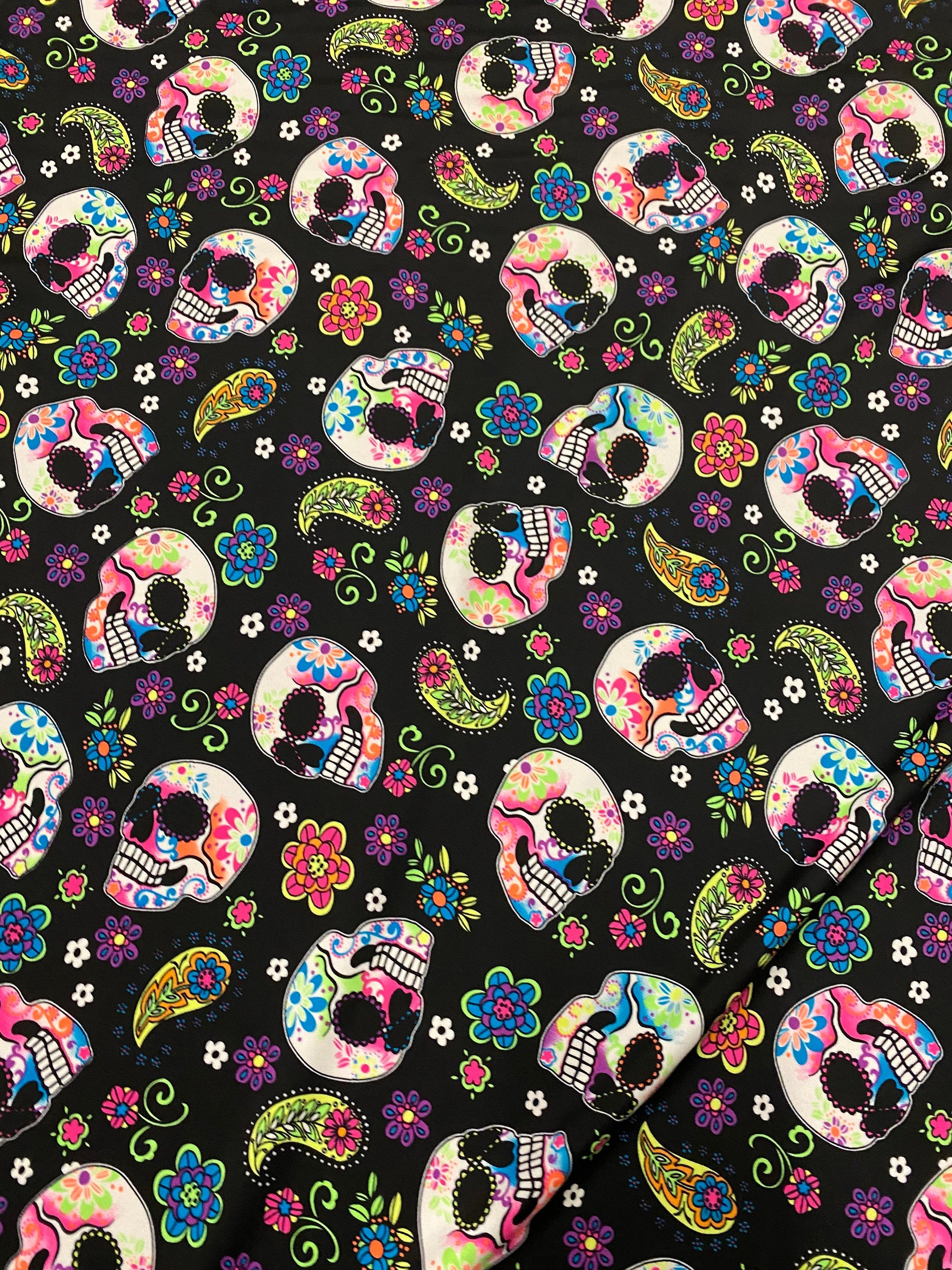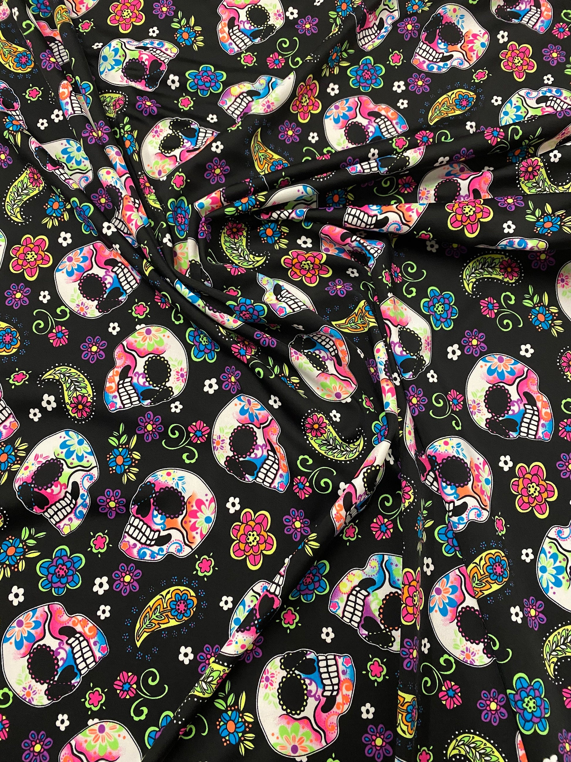 New skulls design black/multicolor nylon spandex print 4-way stretch 58/60” Sold by the YD. Ships worldwide from Los Ángeles California USA