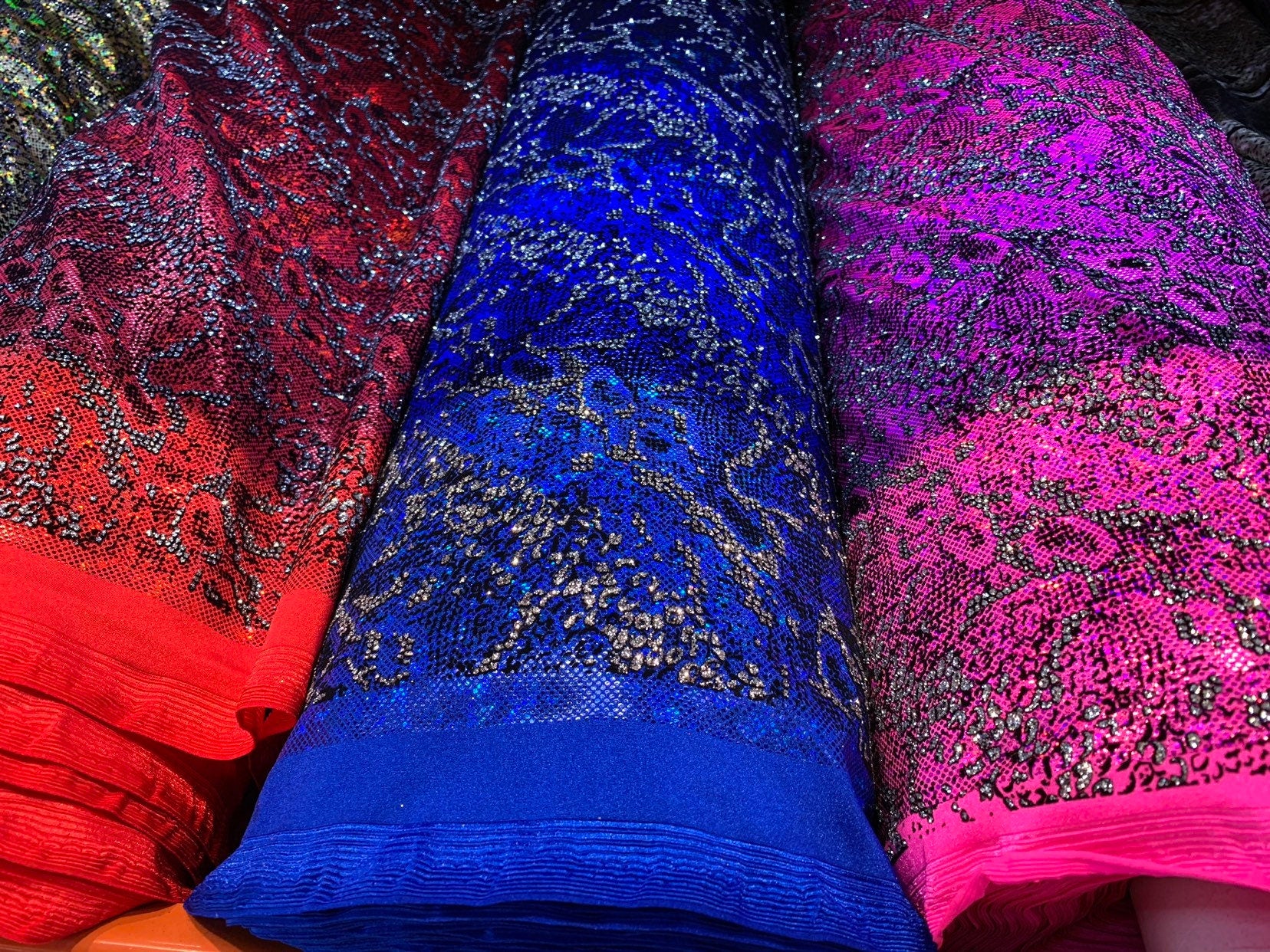 New snake design metallic nylon spandex with flocking and glitter 4way 58/60" Sold by the YD. Ships worldwide from Los Angeles California.