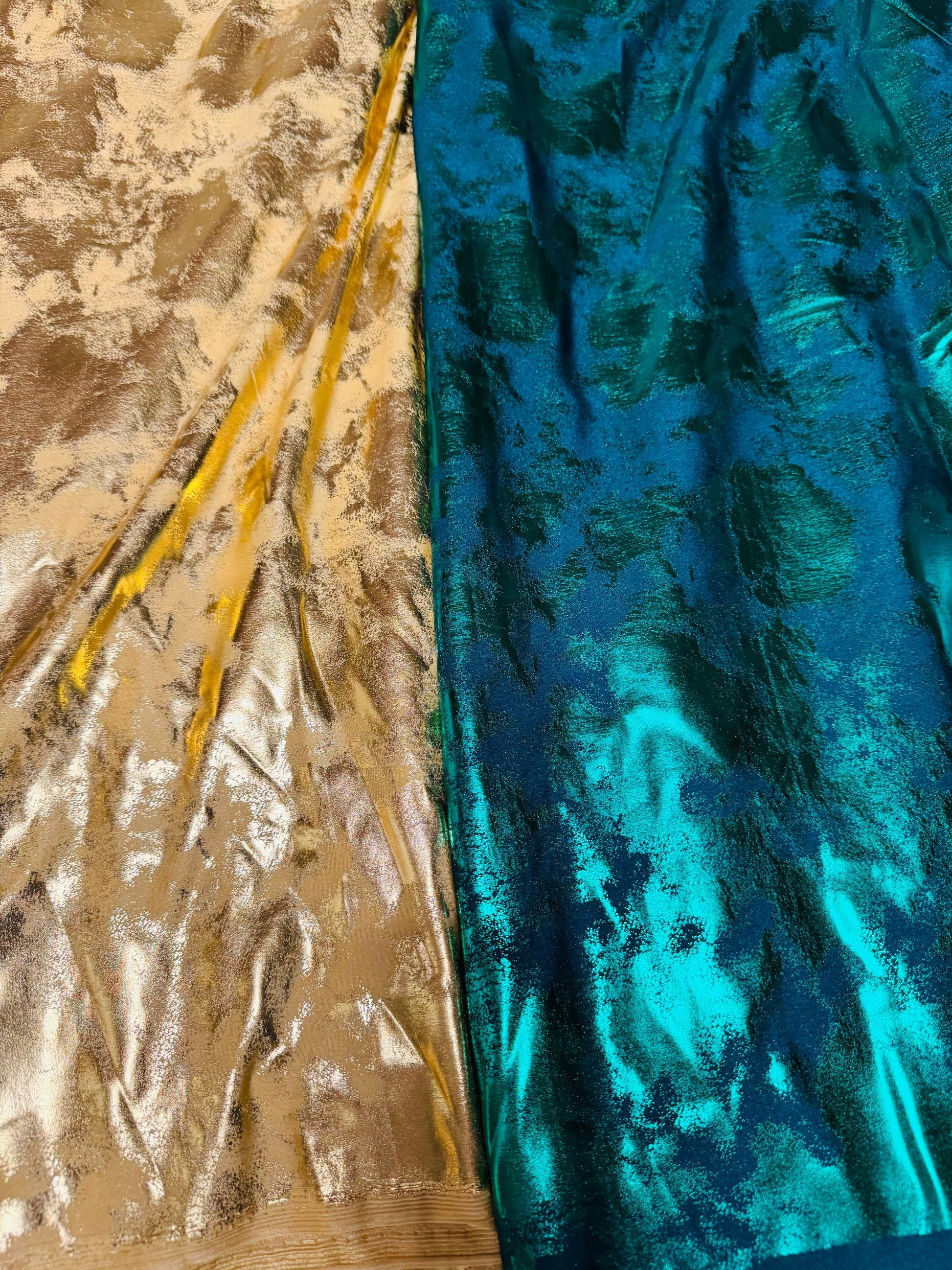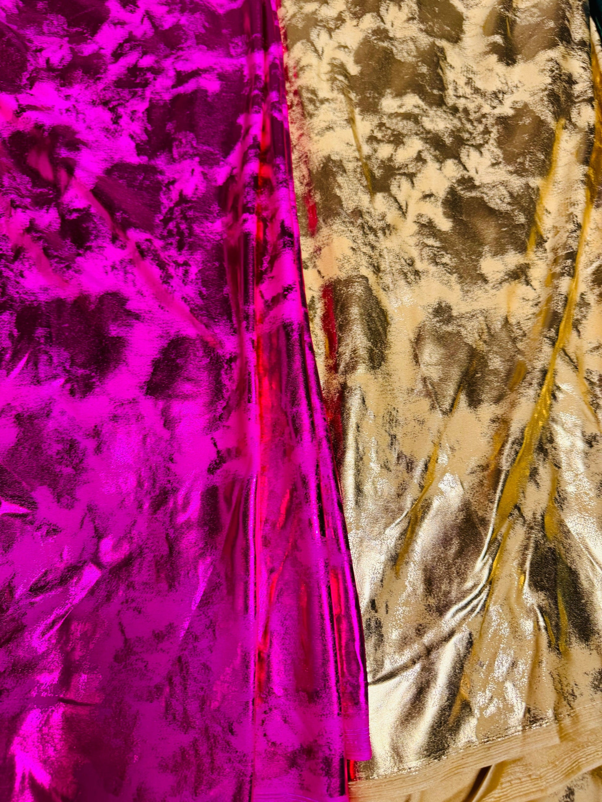 New splatter foil design metallic nylon spandex 4-way stretch 58/60” Sold by the YD. Ships worldwide from Los Angeles California USA.