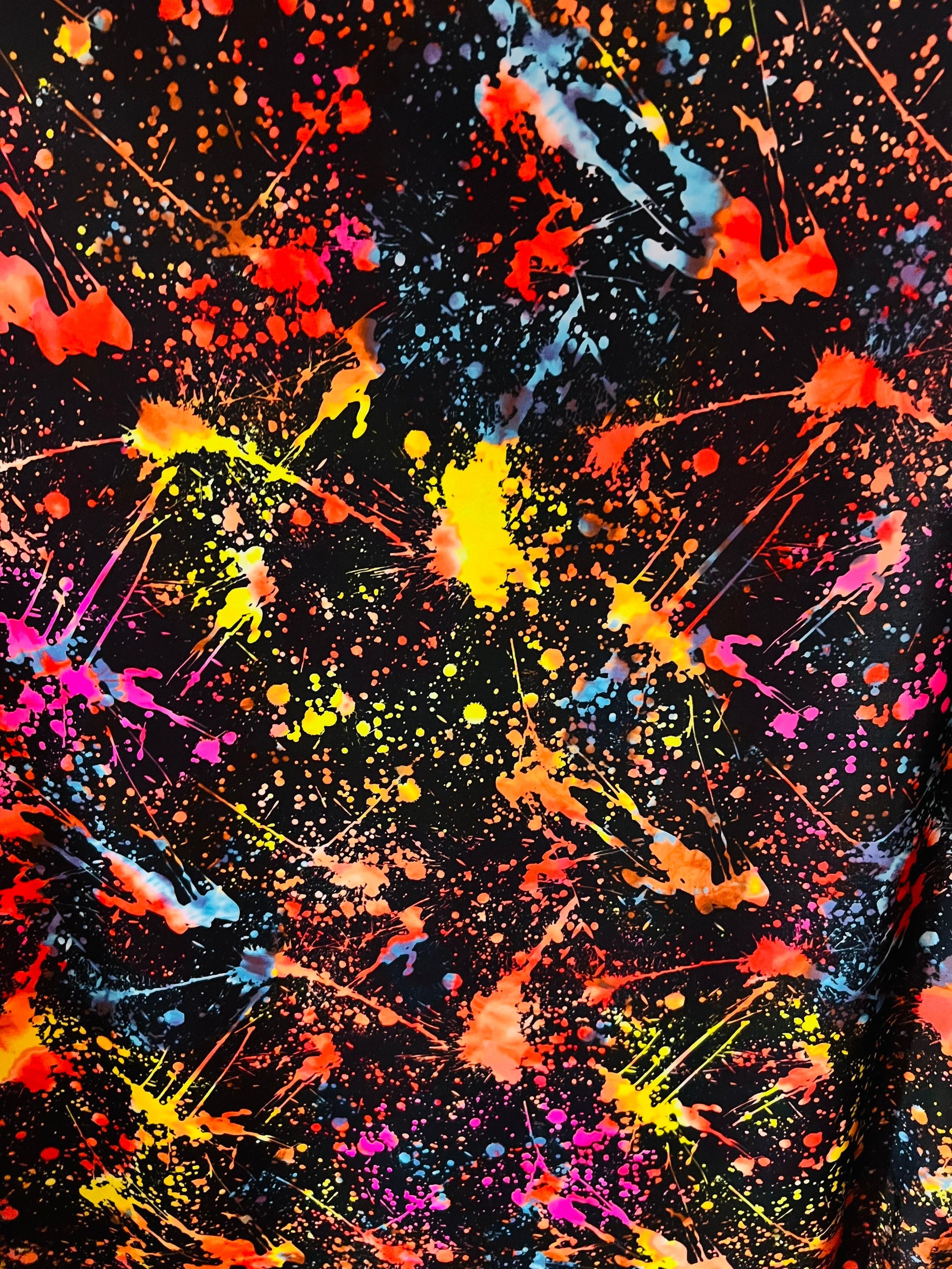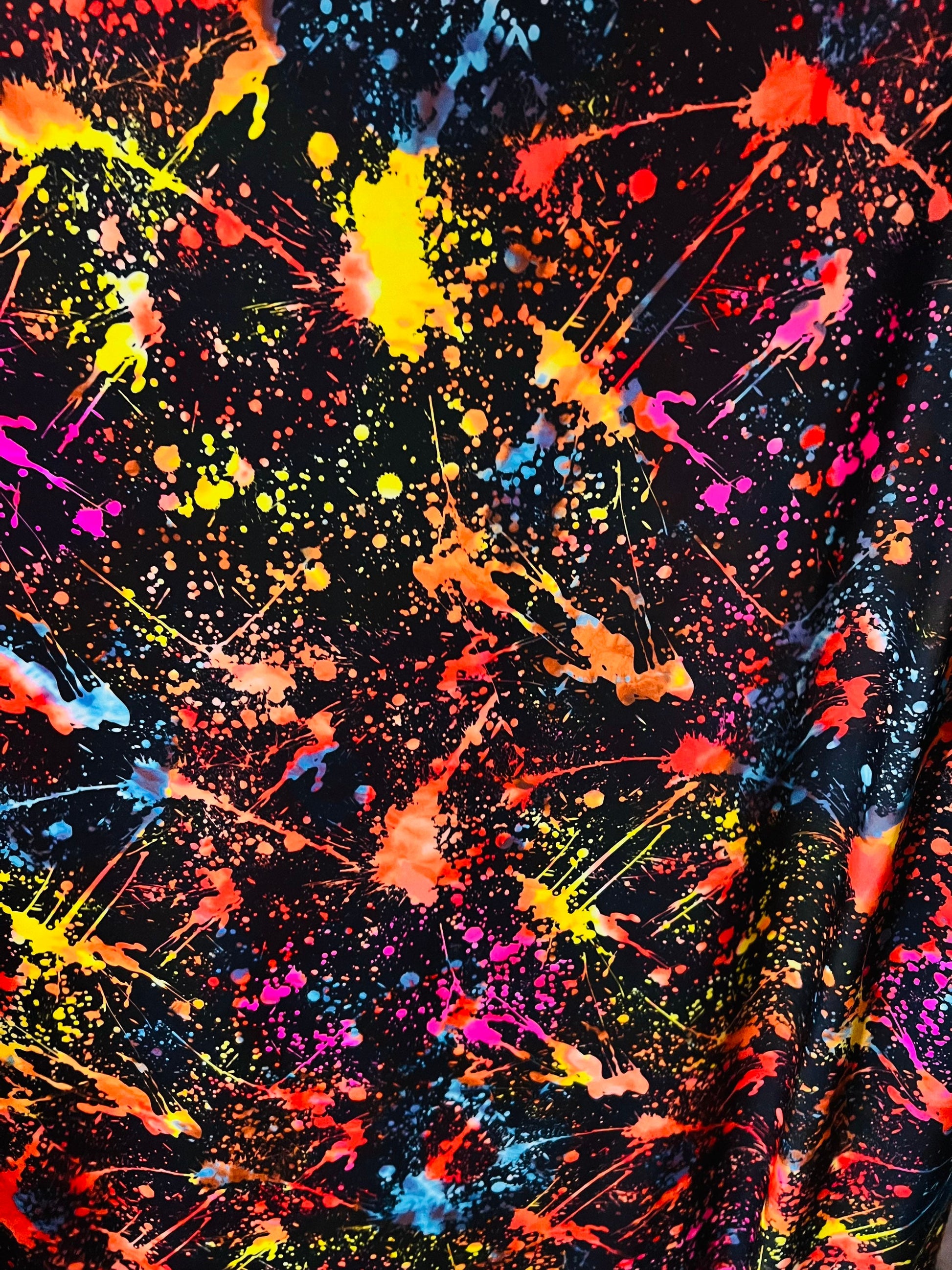 New splatter paint design Black/Multicolor print on nylon spandex 4-way stretch 58/60” Sold by the YD. Ships worldwide from Los Angeles Cali