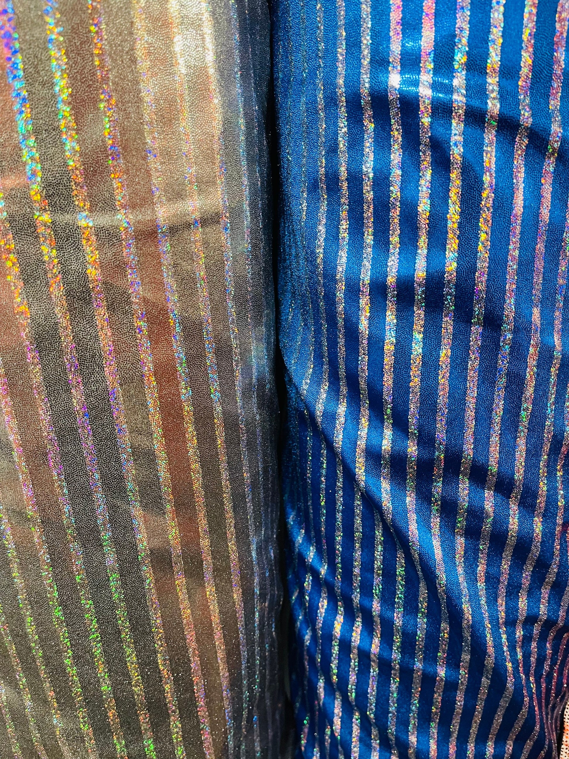 New striped metallic foggy foil hologram metallic nylon spandex 4-way stretch 58/60” Sold by the YD. Ships Worldwide from Los Angeles CA