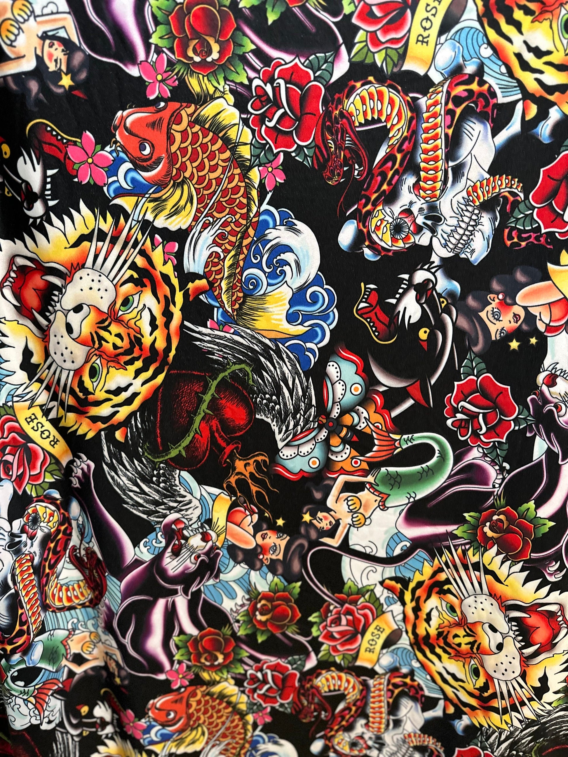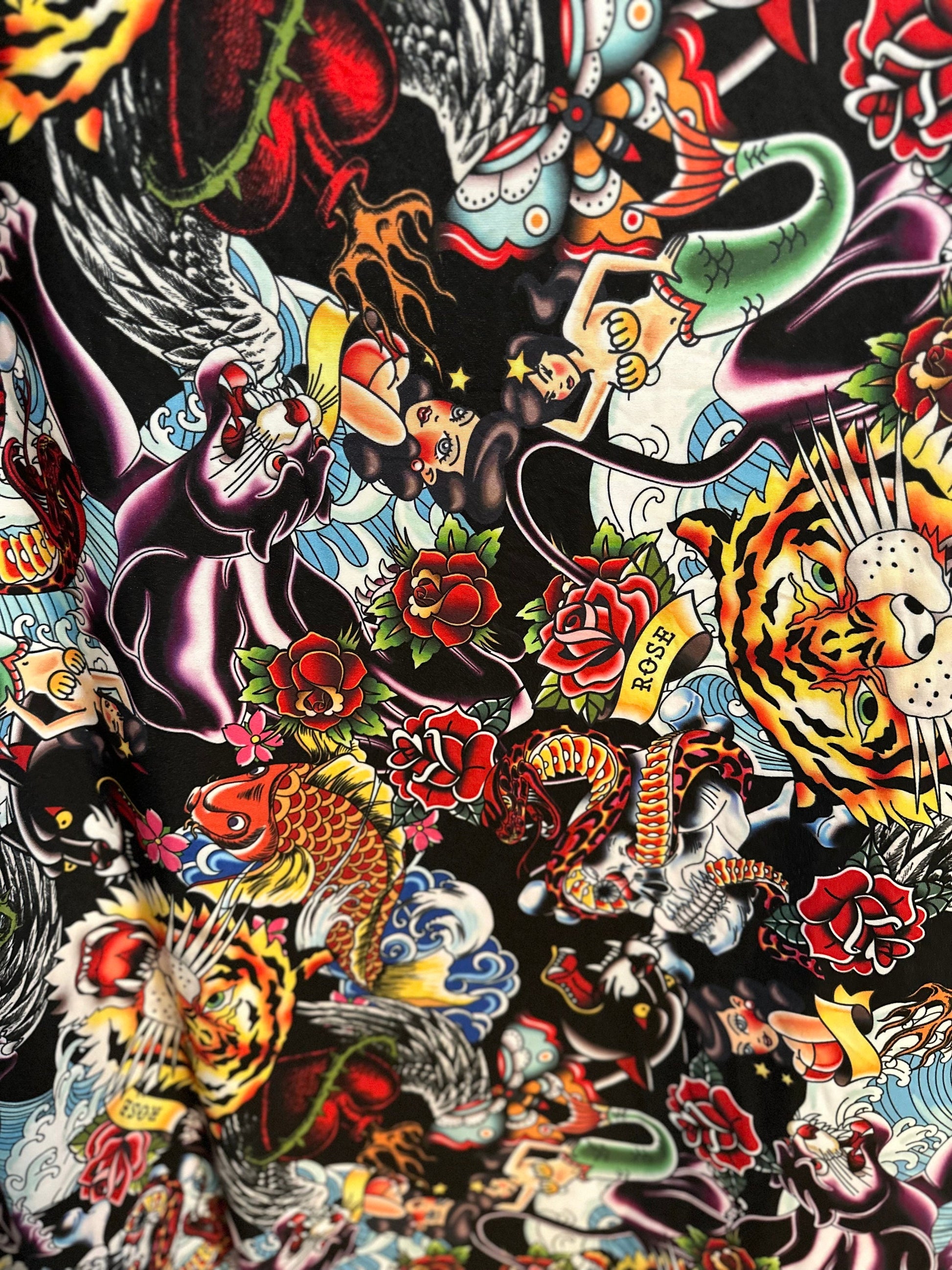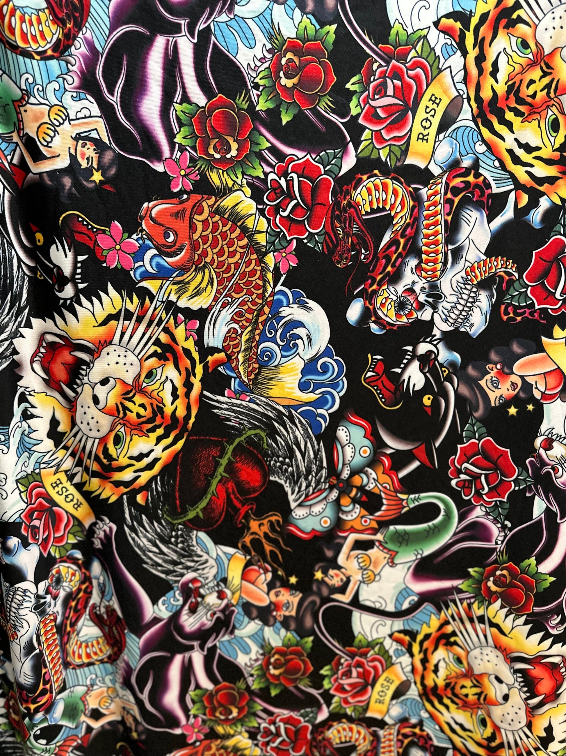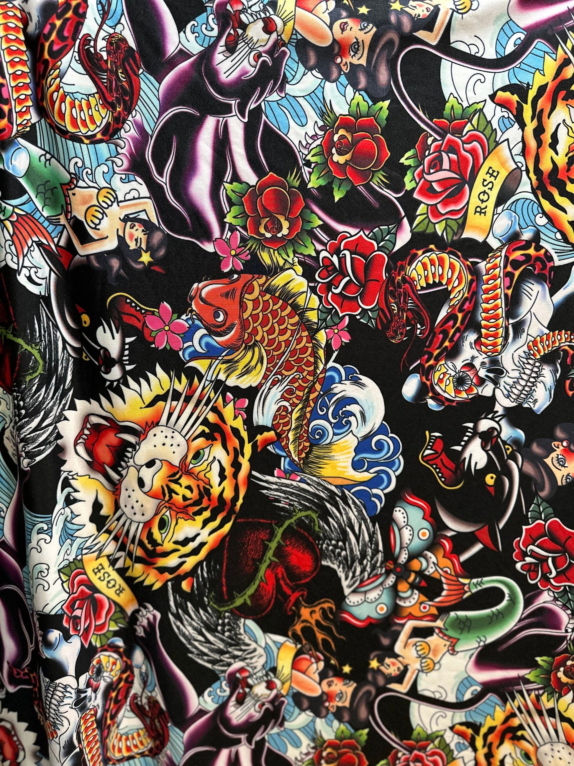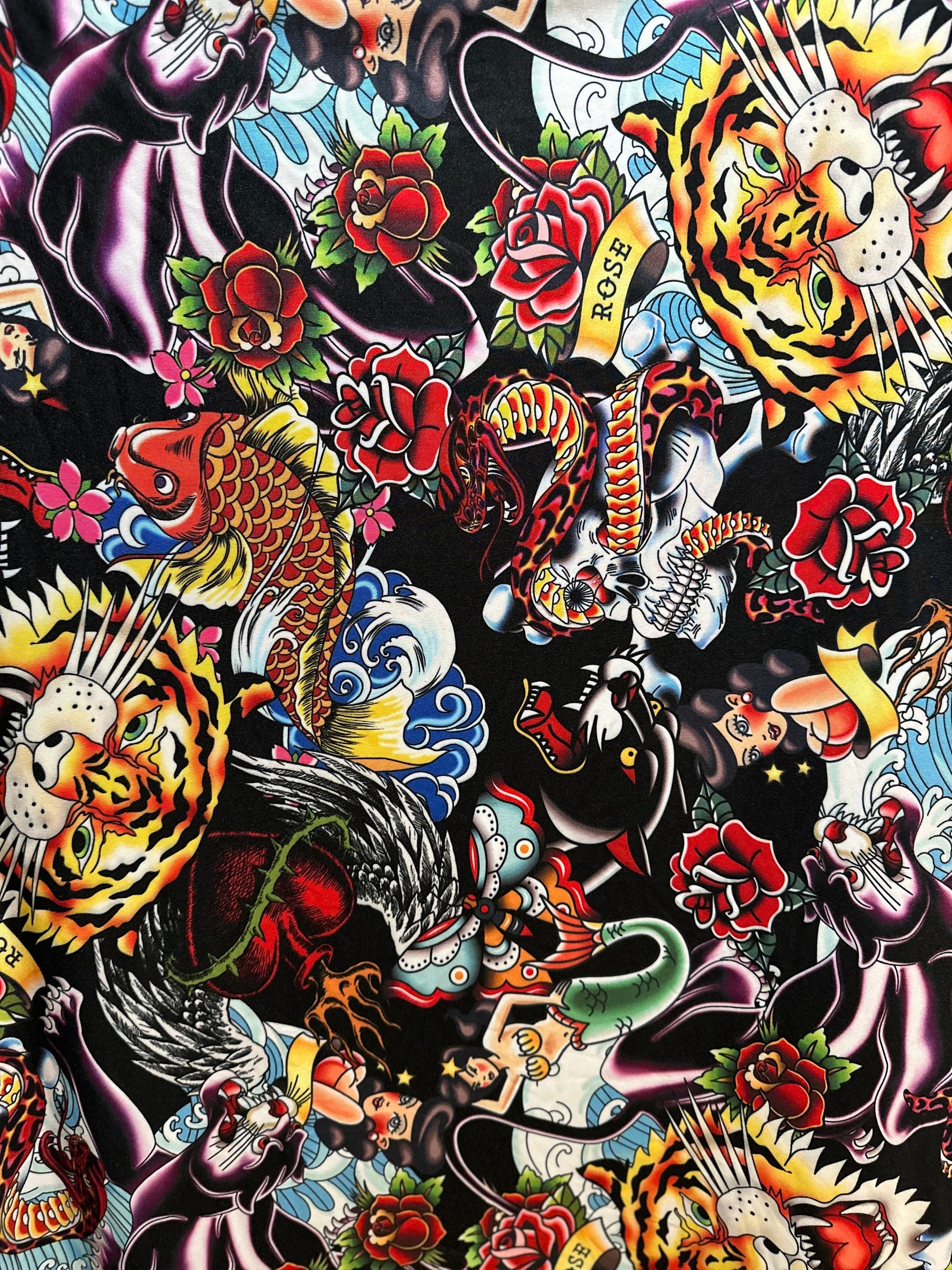 New Tattoo multi design print on nylon spandex 4-way stretch 58/60” Sold by the YD. Ships worldwide from Los Angeles California USA