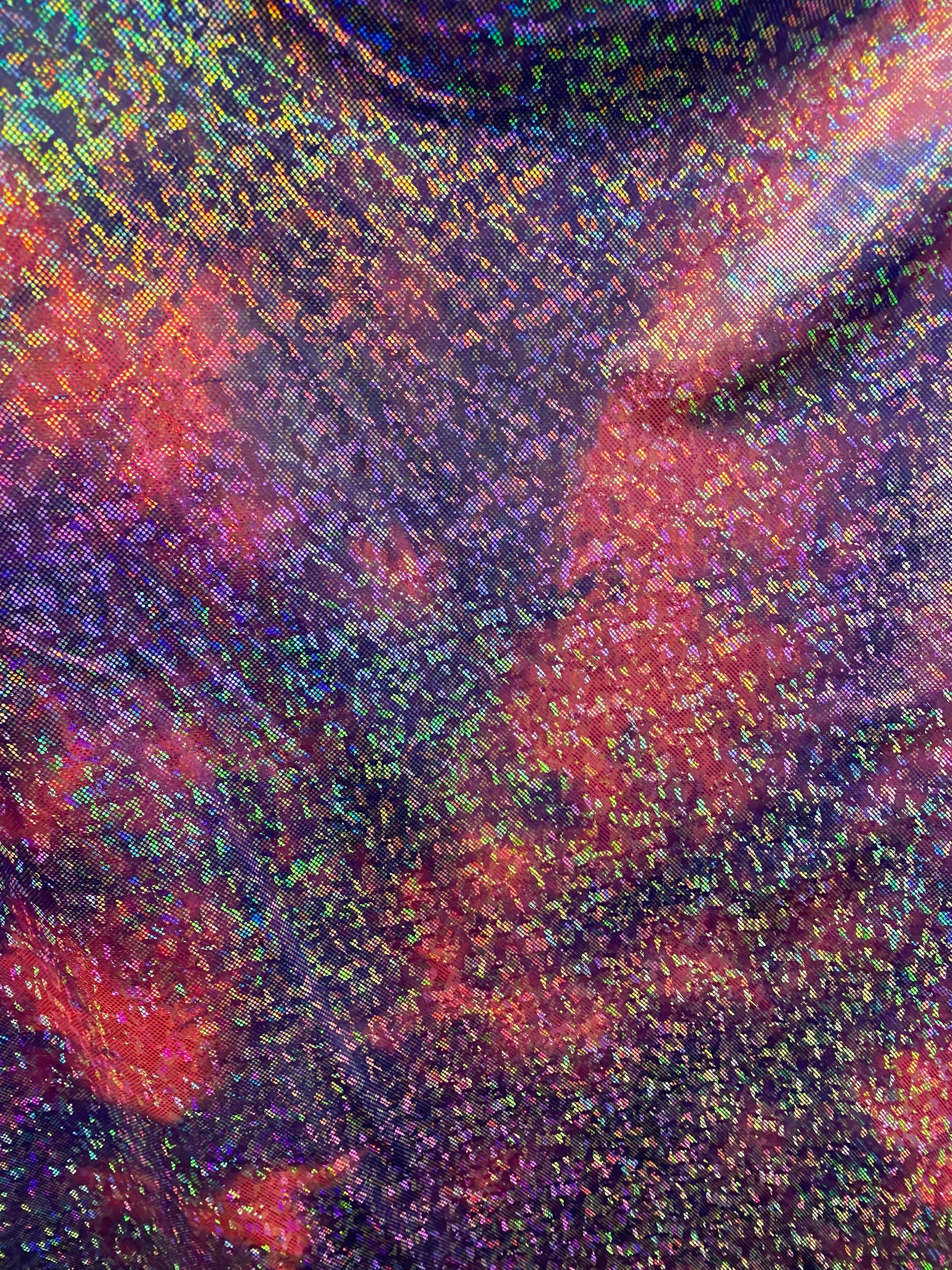 New tie dye cotton candy shattered glass metallic nylon spandex with hologram foil 4-way stretch 58/60” Sold by the YD. Sold by the YD. Ships worldwide from Los Angeles California USA.