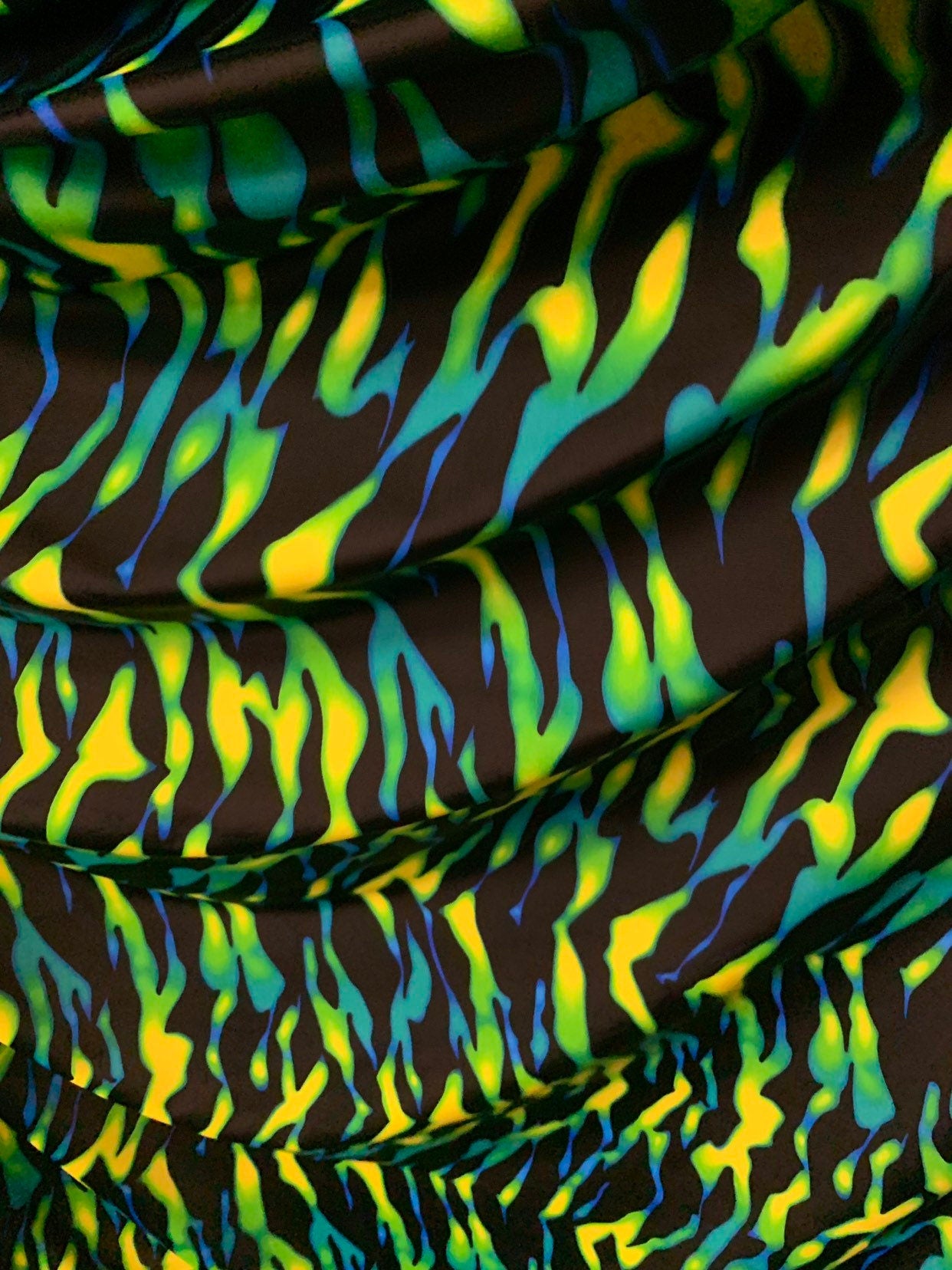 New tiger camouflage design black/green/yellow print on heavy nylon spandex 4way stretch 58/60" Sold by the YD. Ships worldwide from Los Angeles California USA.