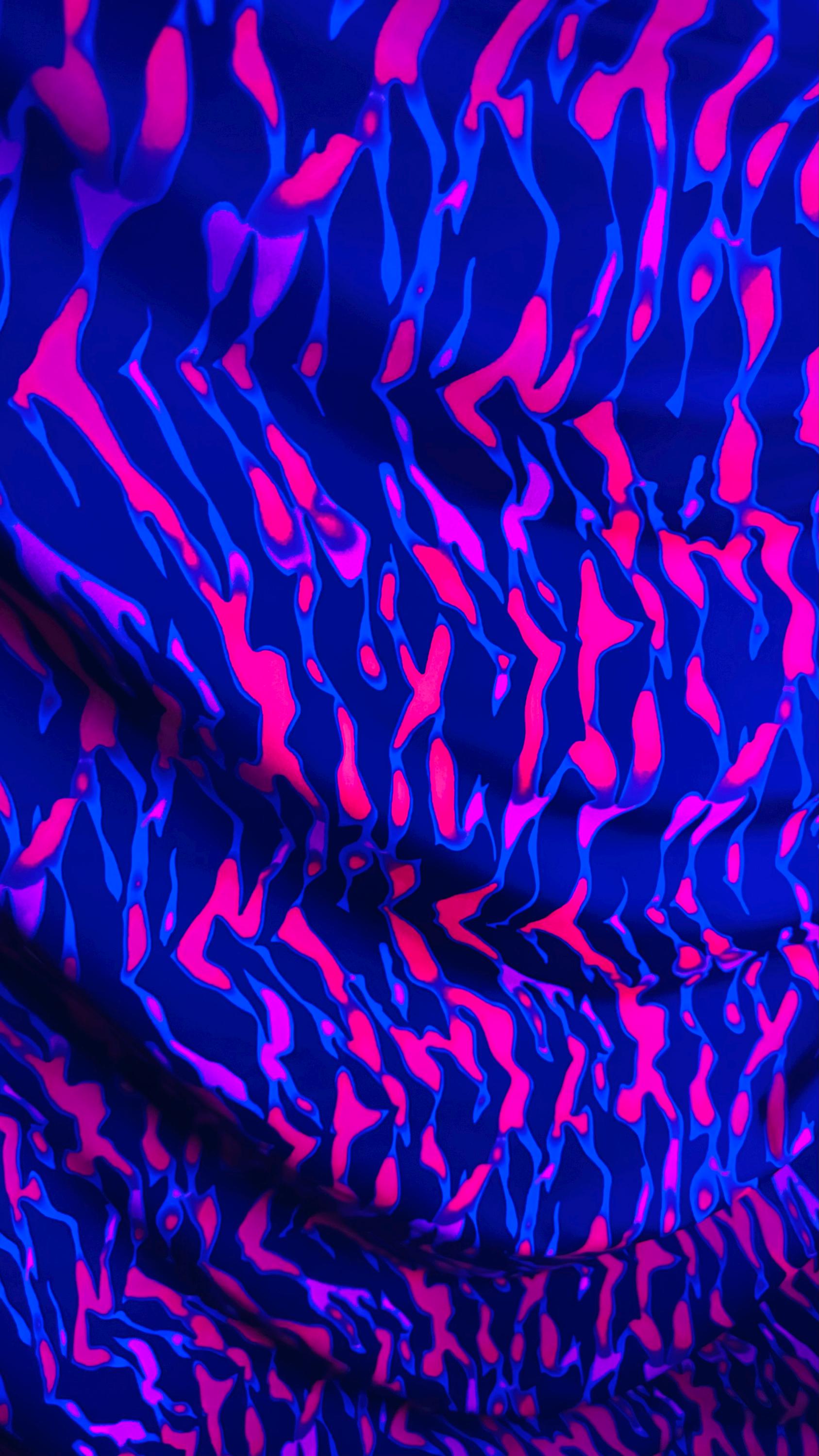 New UV light reflective Tiger abstract design Neon Ponk/Black print on heavy nylon spandex 4-way stretch 58/60” Sold by the YD.