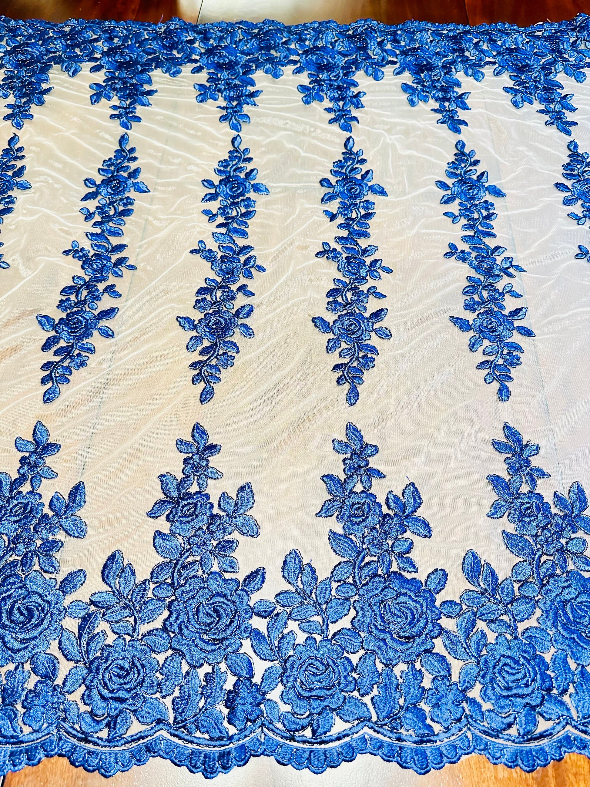 New Victoria embroidered lace Nude/Midnight Blue 2-way stretch 42/44” Sold by the YD. High quality fabrics by AlexLAFabrics Ships worldwide from Los Angeles California USA