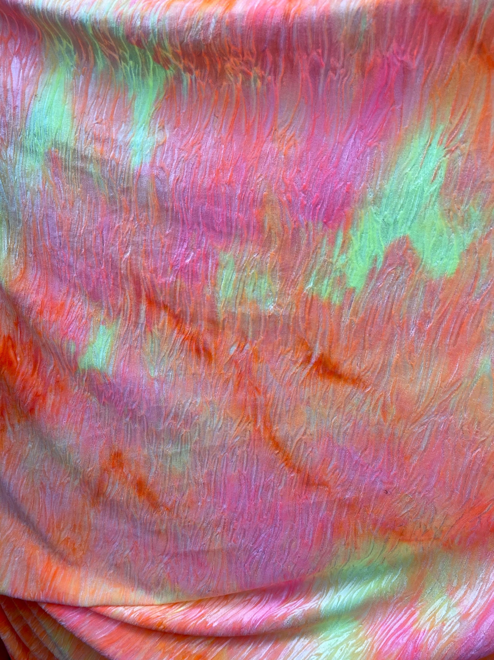 New wavy crushed velvet mega tie dye Orange/pink/yellow colors 4-way stretch 58/60” Sold by the YD. Ships Worldwide from Los Angeles California USA.