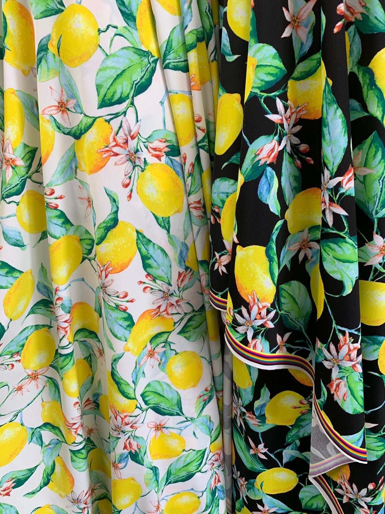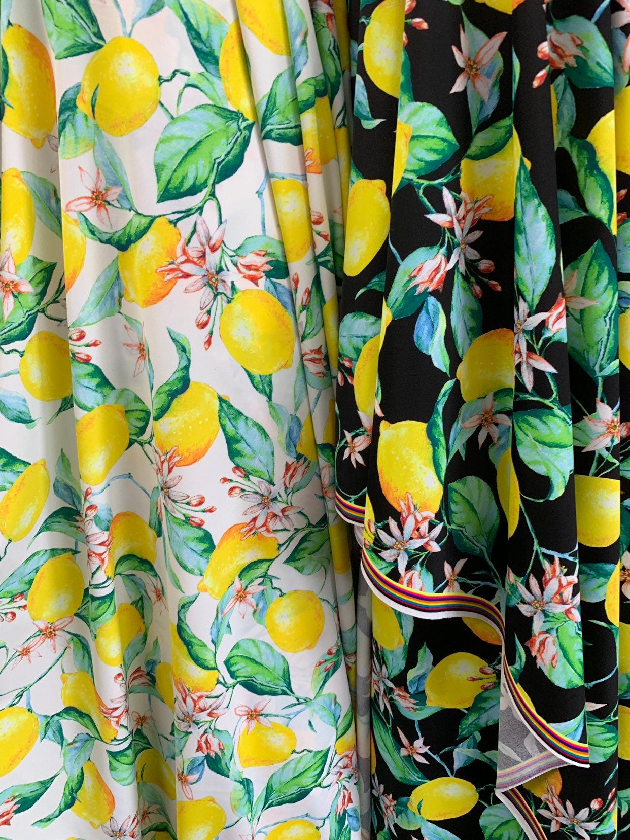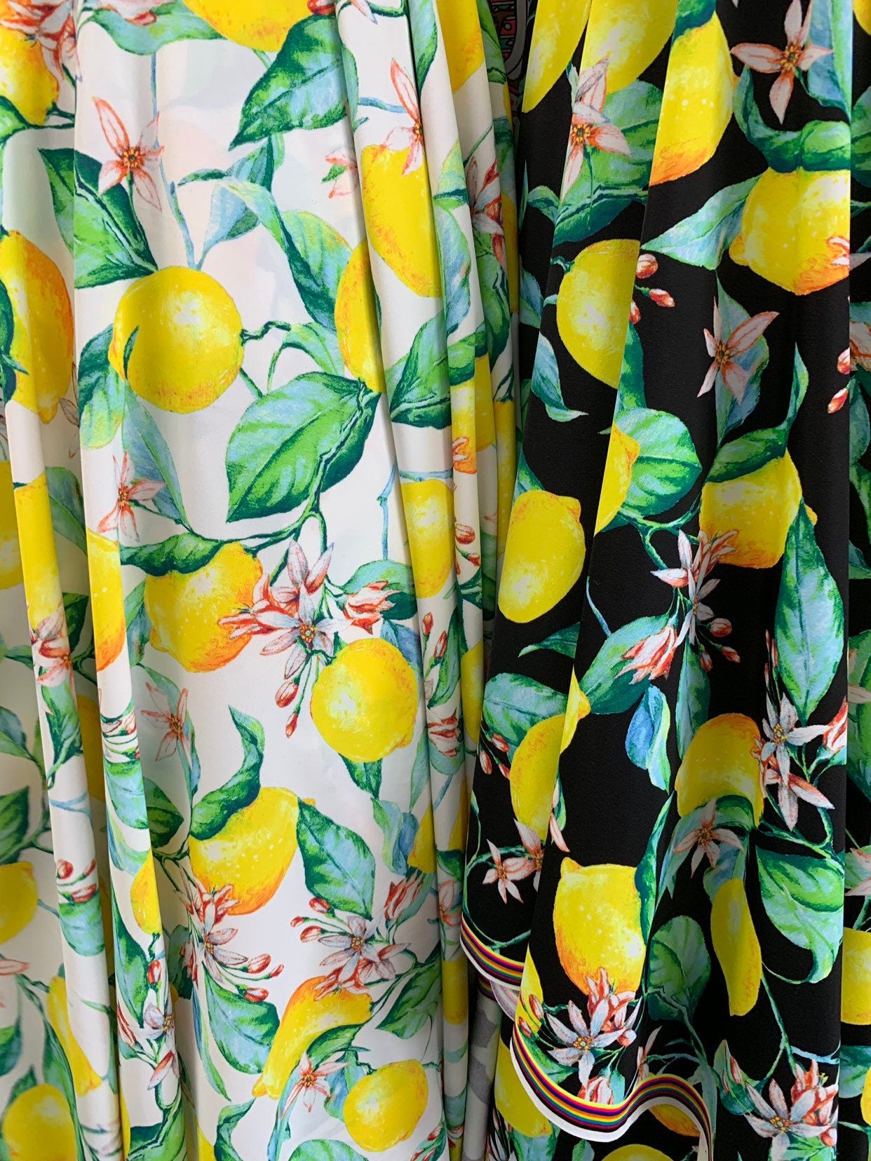 NEW yellow lemons design print on fine quality of nylon spandex 4way spandex 58/60" Sold by the YD. Ships worldwide from Los Angeles California USA.