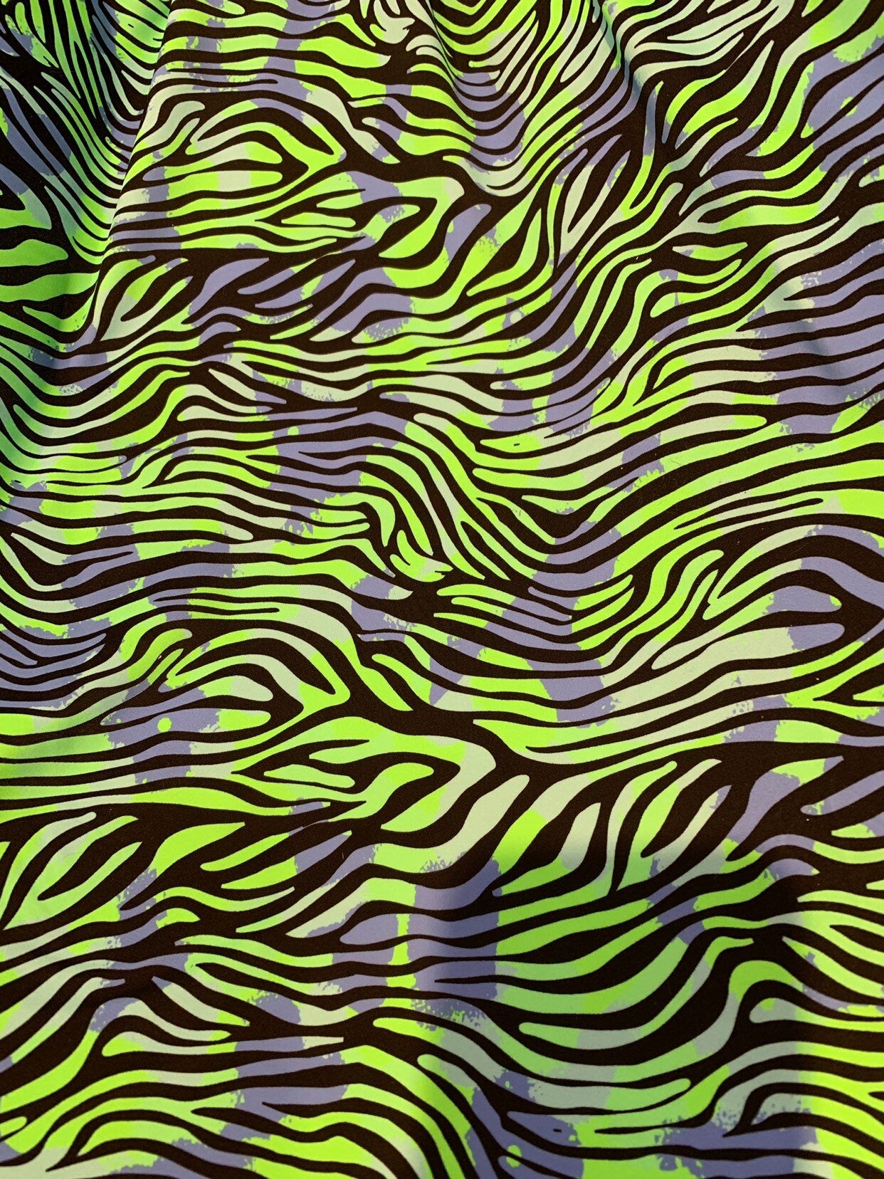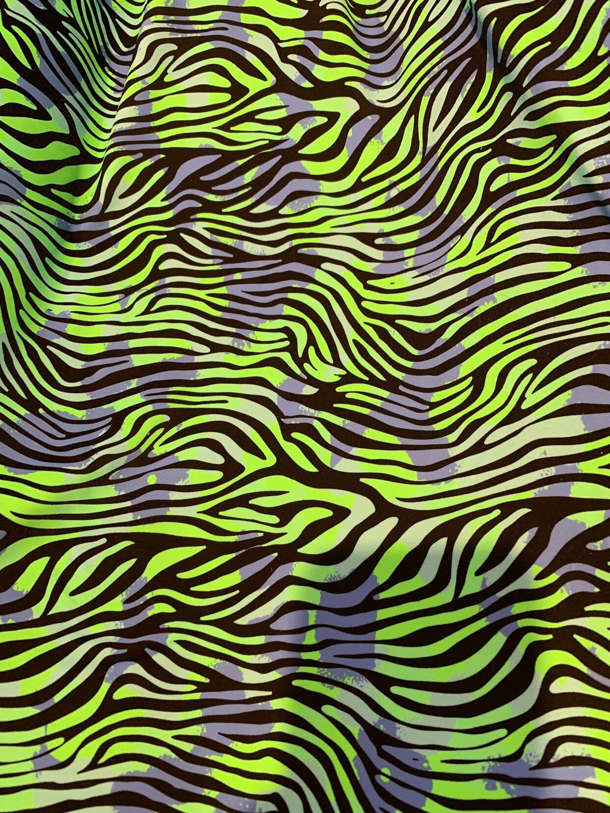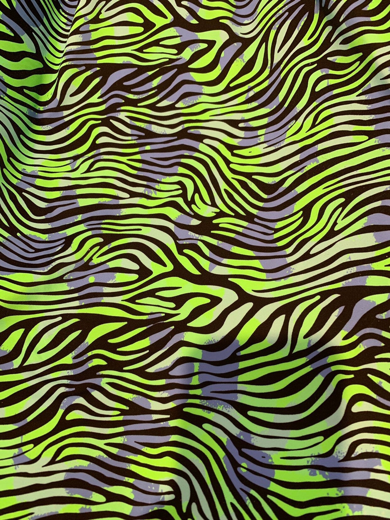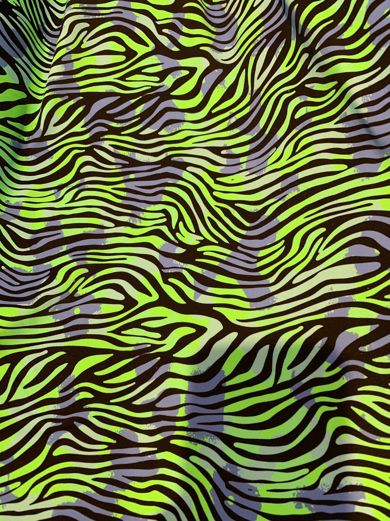 New zebra design Neon green print on heavy nylon spandex 4way stretch 58/60" Sold by the YD. Ships worldwide from Los Angeles California USA